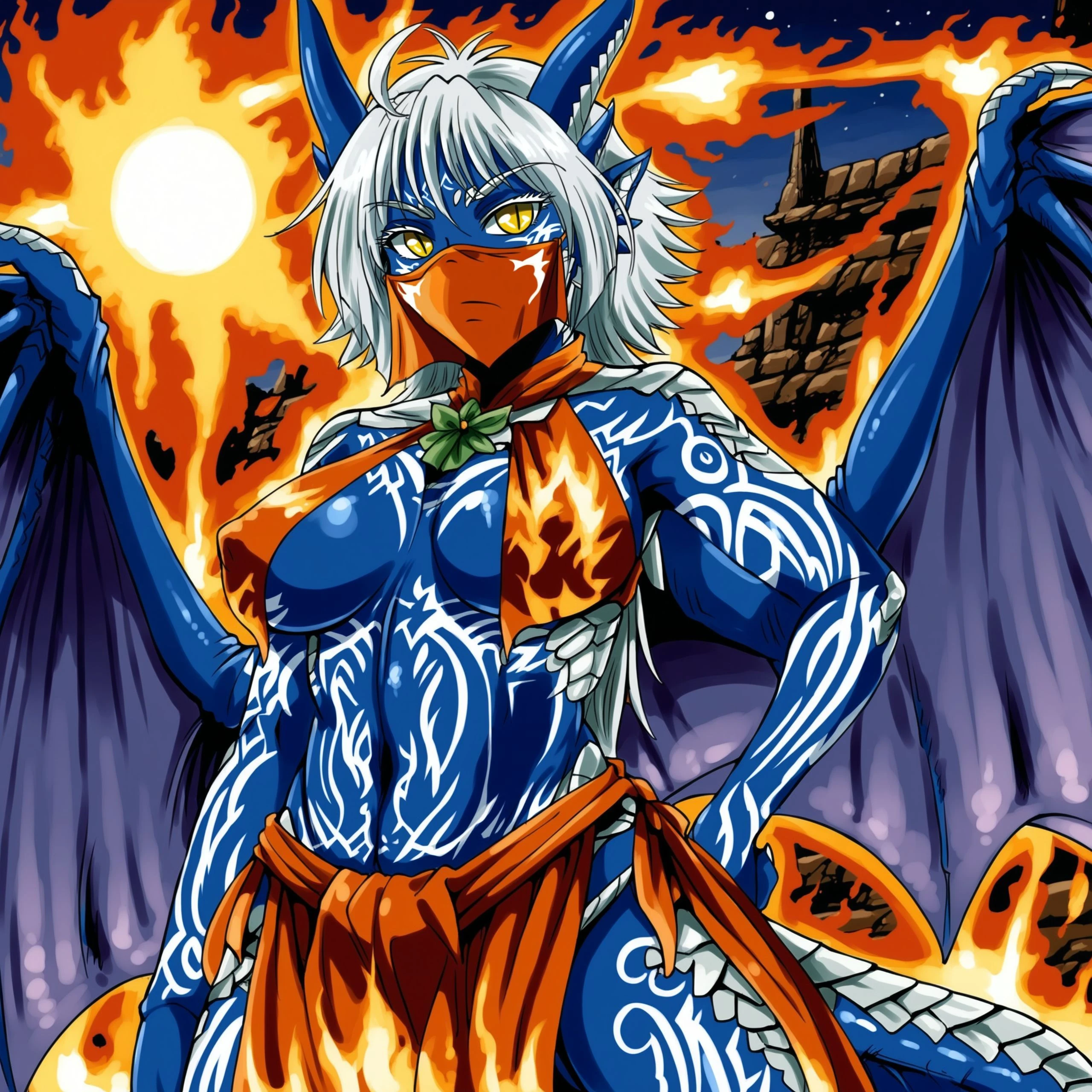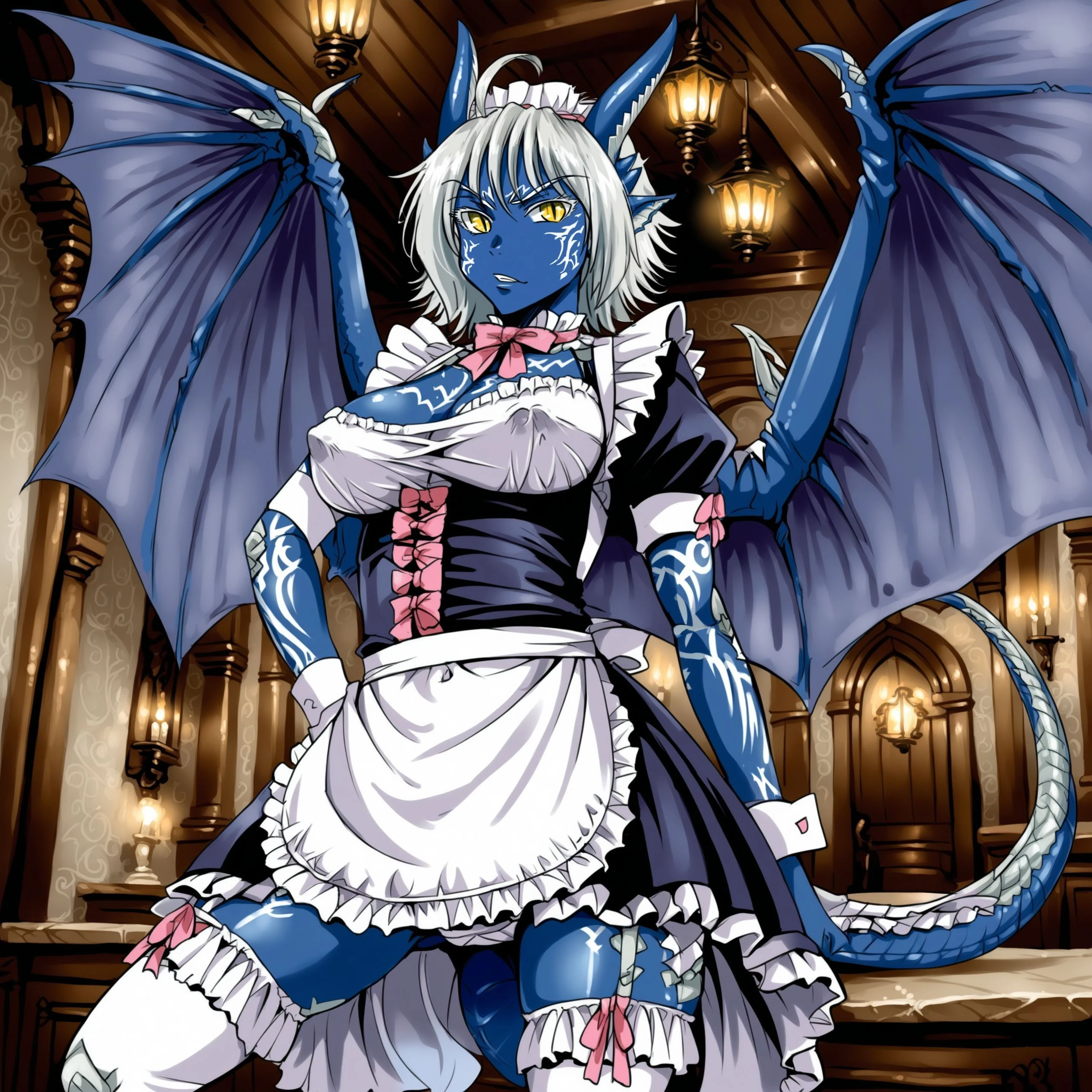 The recommended prompt is giselle, wings, tail, scales, blue skin, yellow eyes.