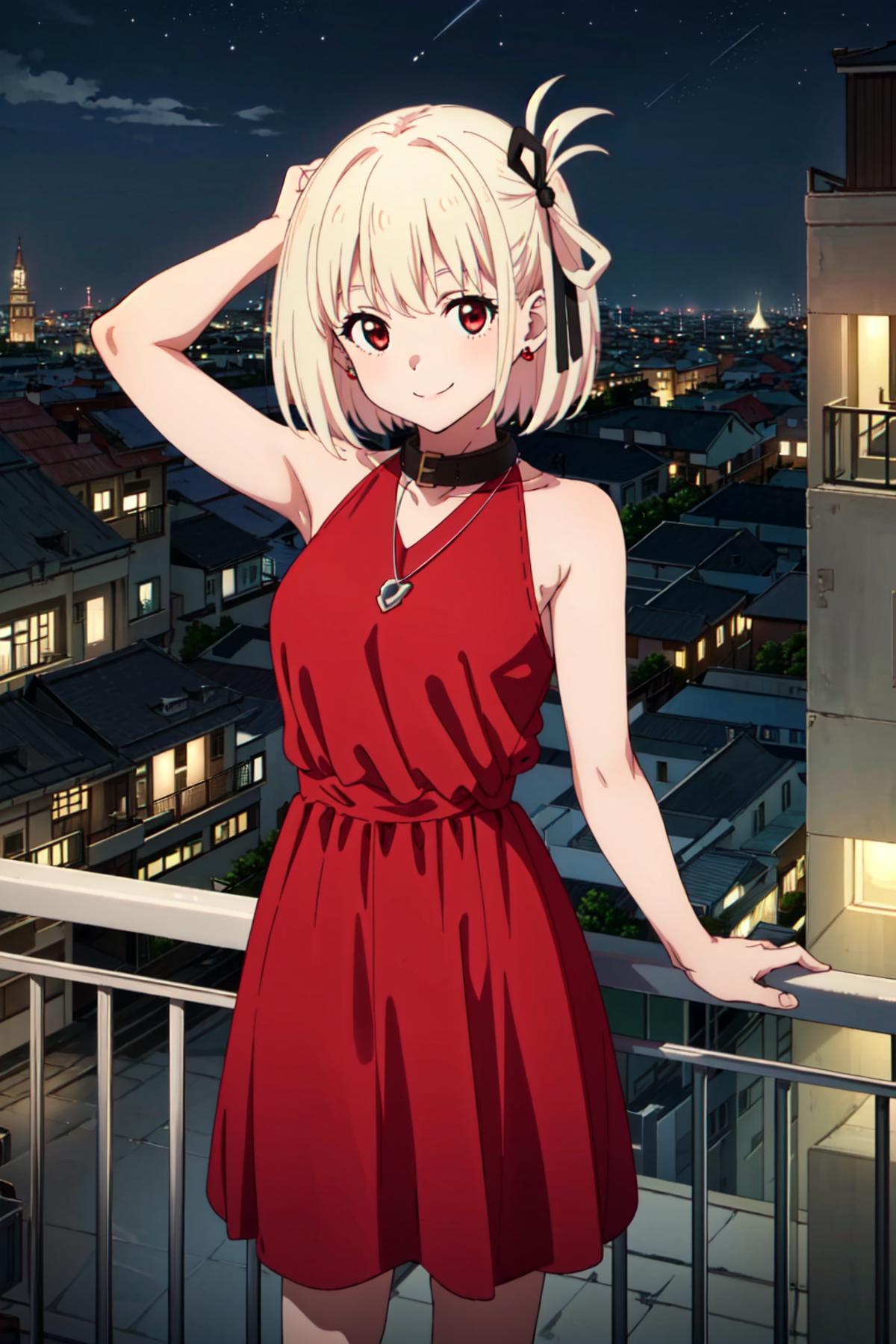chdo,red dress,sleeveless dress,sleeveless,bare shoulders,official alternate costume,black collar,jewelry,necklace,pendant,ribbon,hair ribbon,black ribbon,