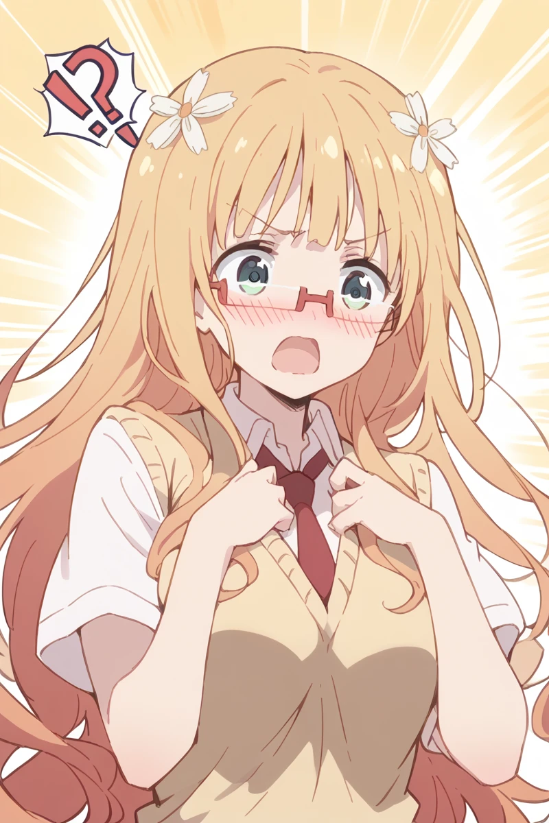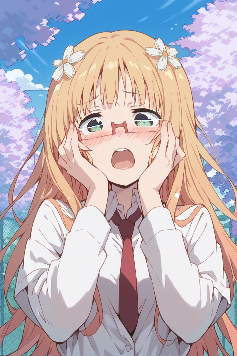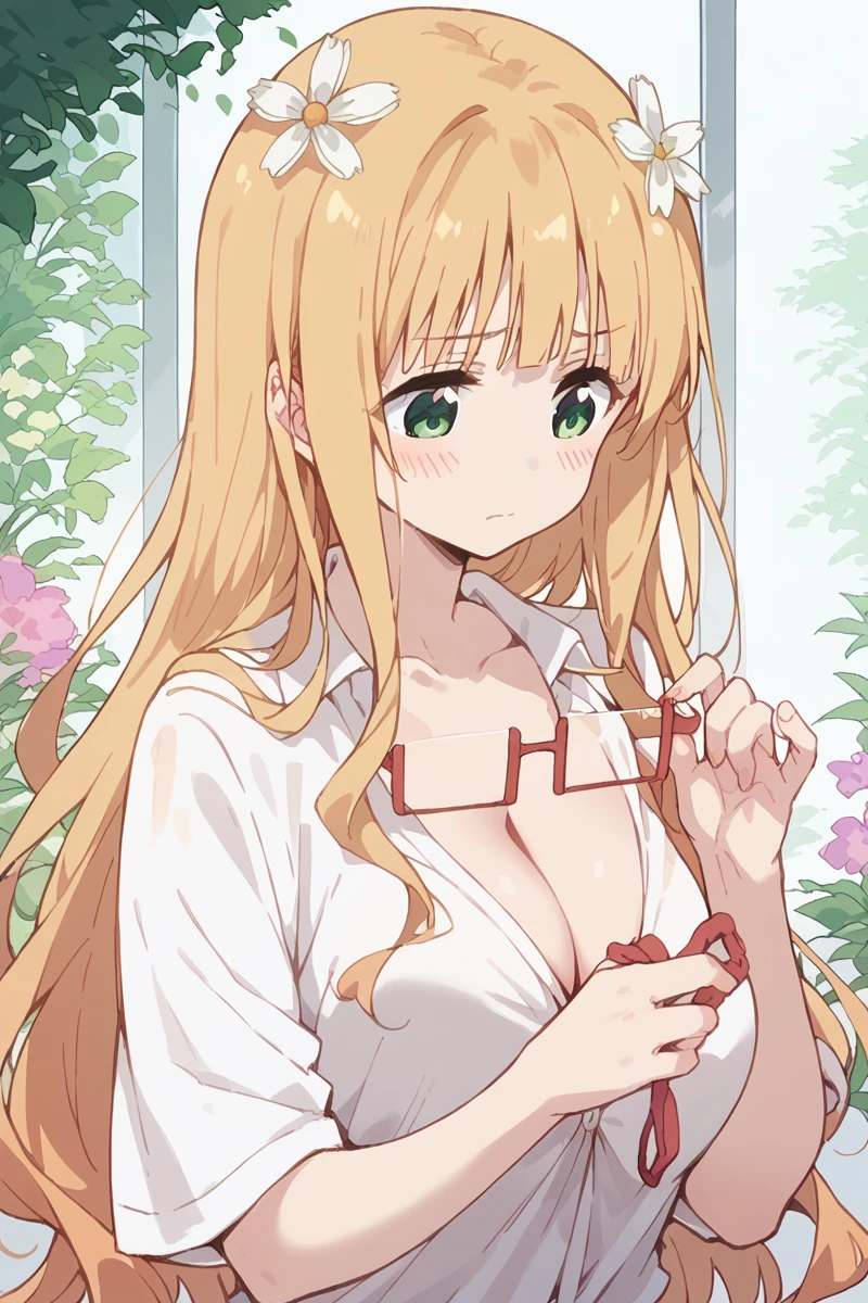 mitsuki, 1girl, glasses, long hair, hair ornament, solo, blonde hair, green eyes, necktie, school uniform, blazer/shirt