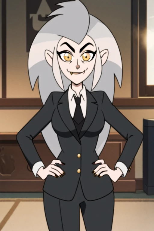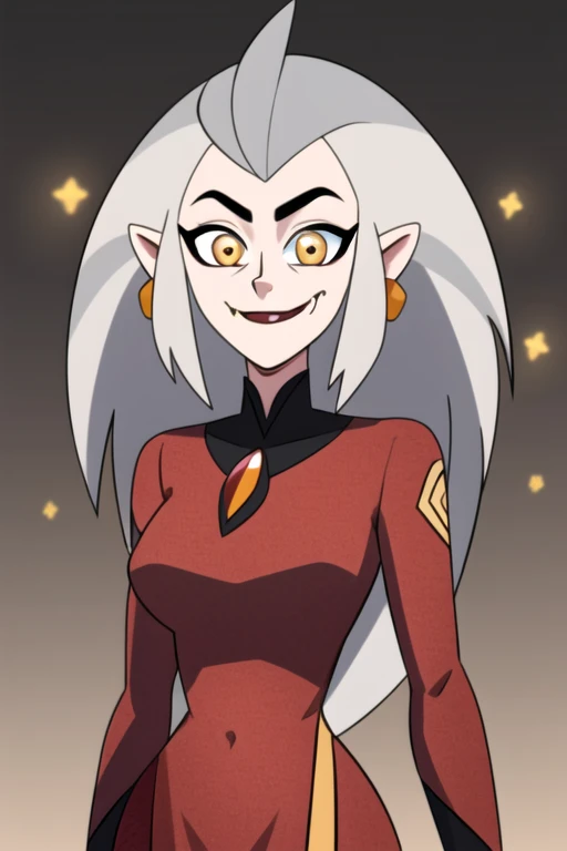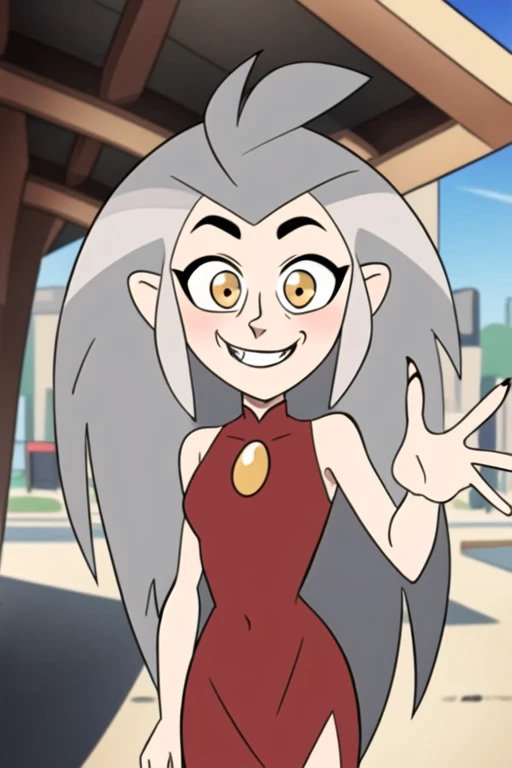 1girl, yellow eyes, grey hair, long hair, smile, red dress, jewelry, pale skin, fangWould you like to have a model of a character? Contact me; I can assist you