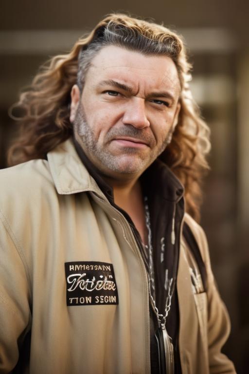 дополнительные слова в промте: middle age male, 40y, dark caramel blonde sides ringlets hair with blond highlight