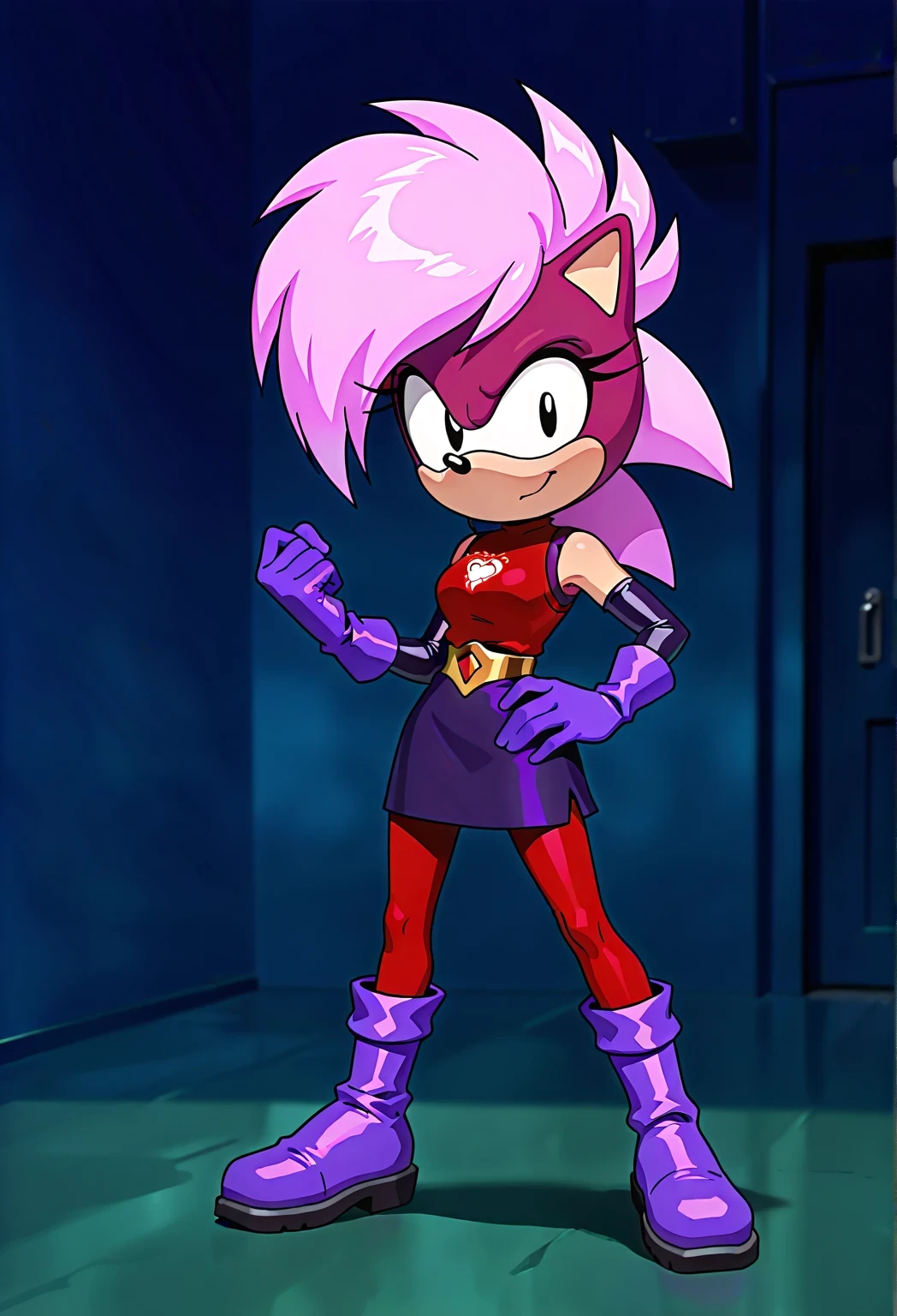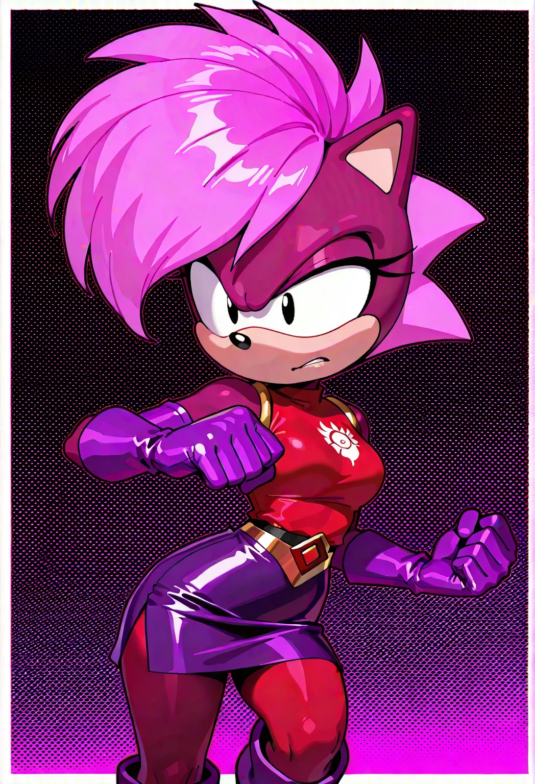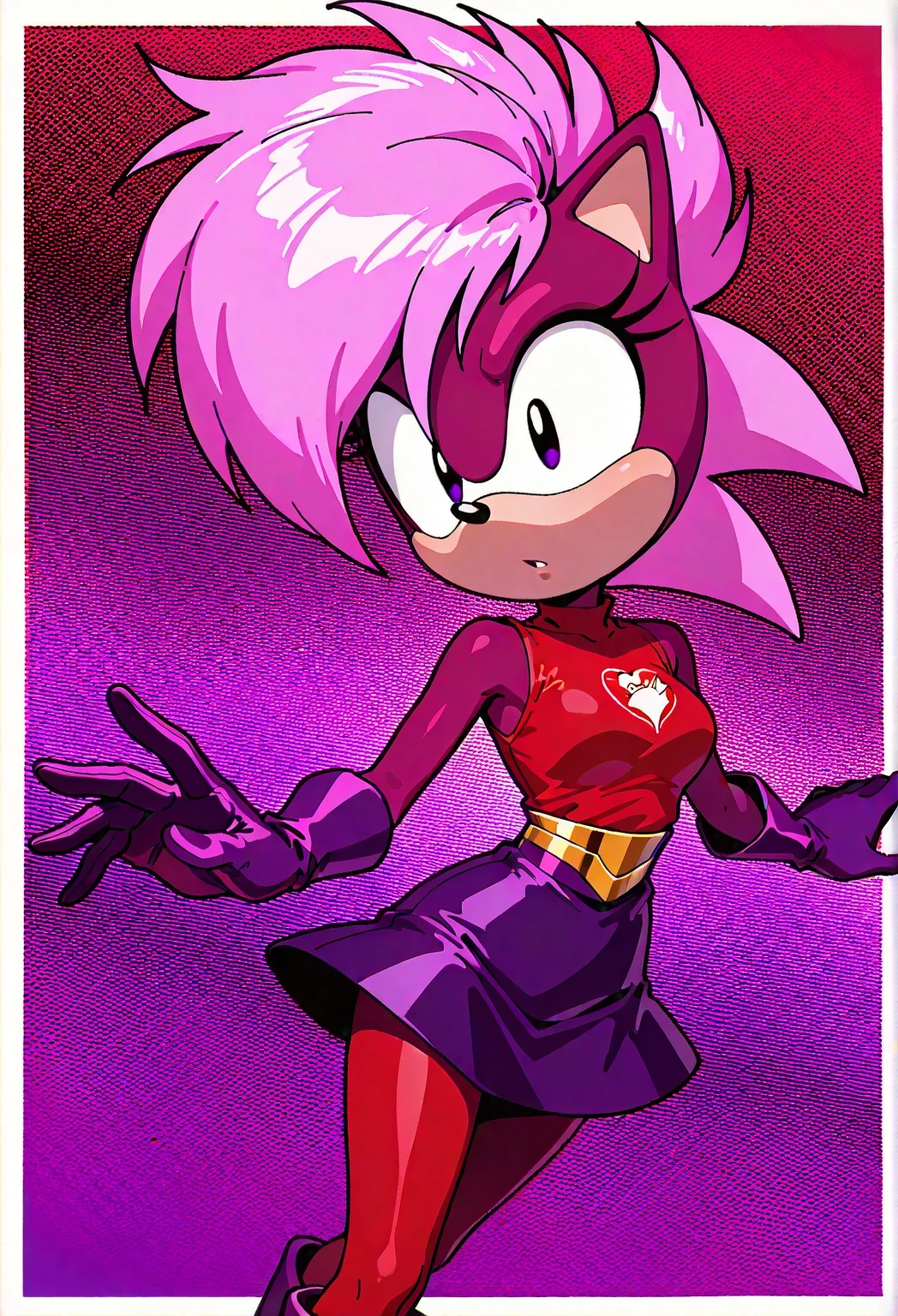SoniaSU, 1girl, vibrant pink spiky hair, dark red top with a red heart emblem, short dark purple skirt, purple gloves, red leggings, purple boots, black eyes, sonic the hedgehog, short