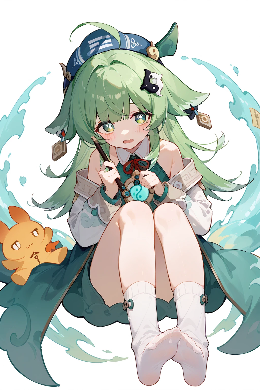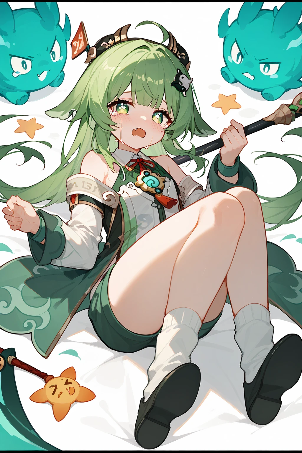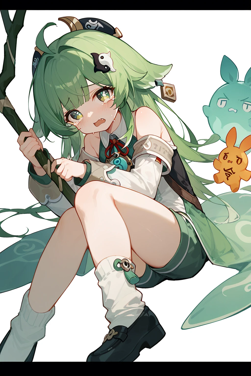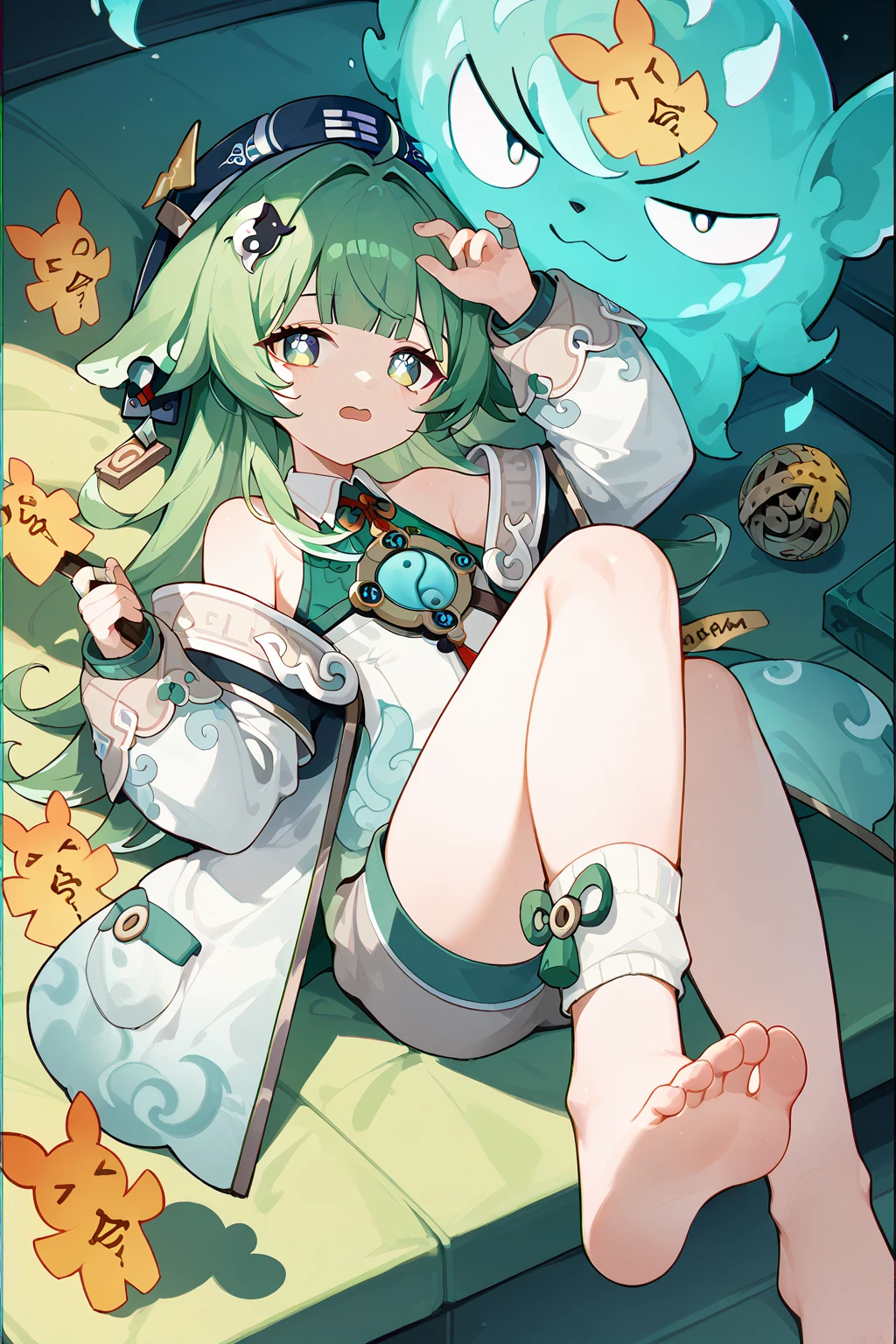HuoHuo(Honkai: Star Rail),green hair,1girl,long hair,shorts,hat,ahoge,bangs,animal ears,long sleeves,grey eyes,bare shoulders,brown shorts,solo,black footwear,black headwear,hair ornament,
