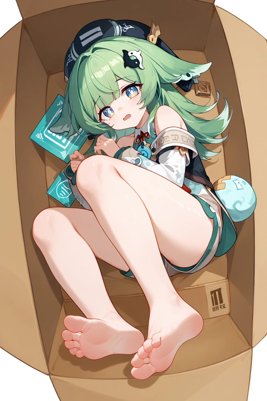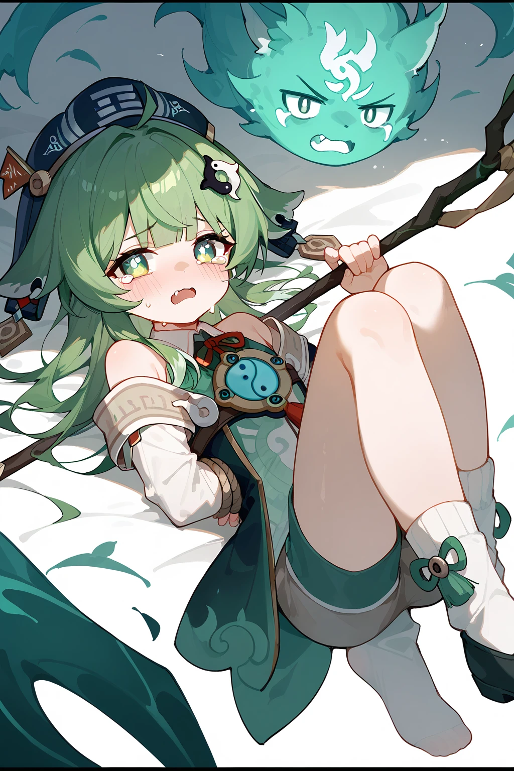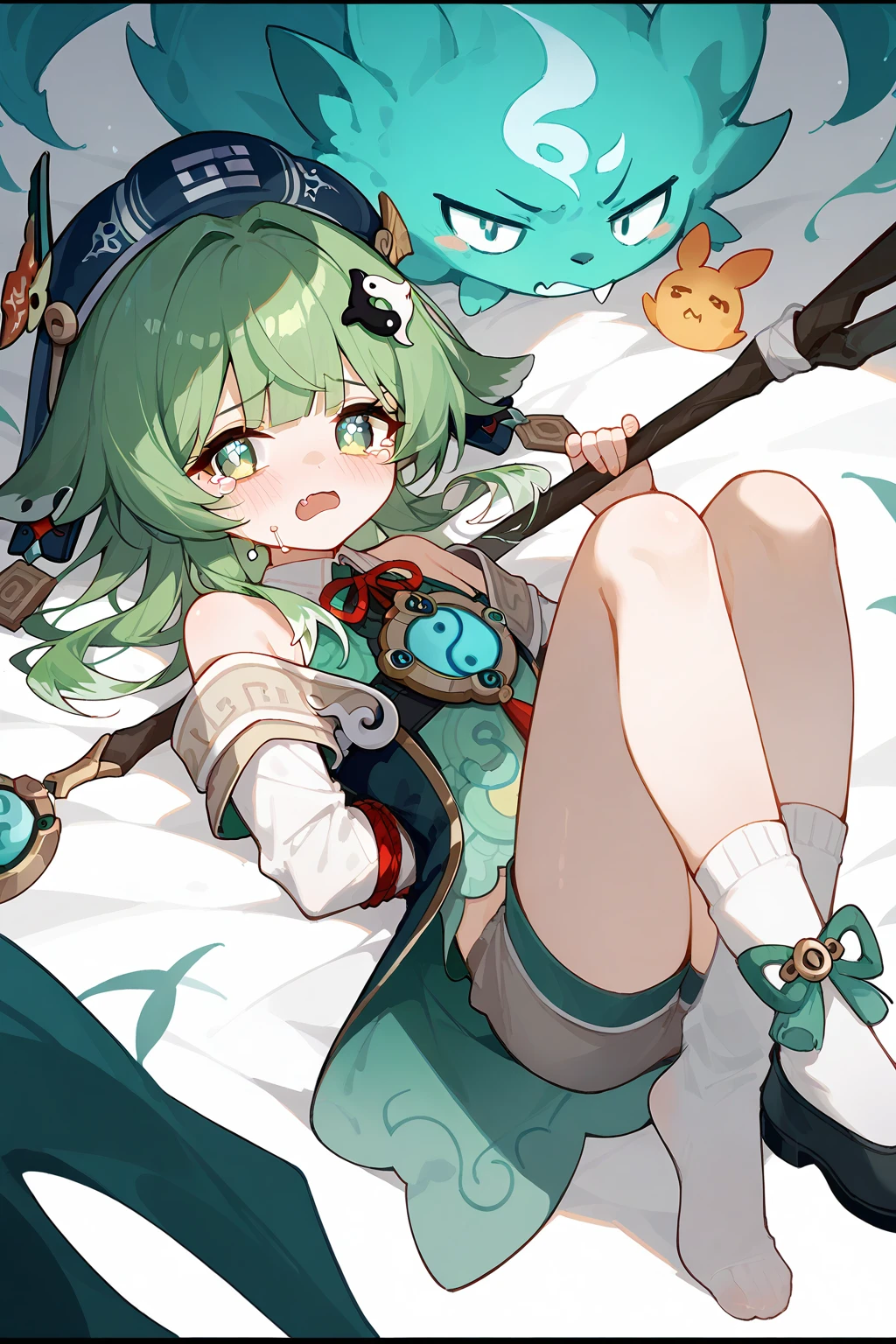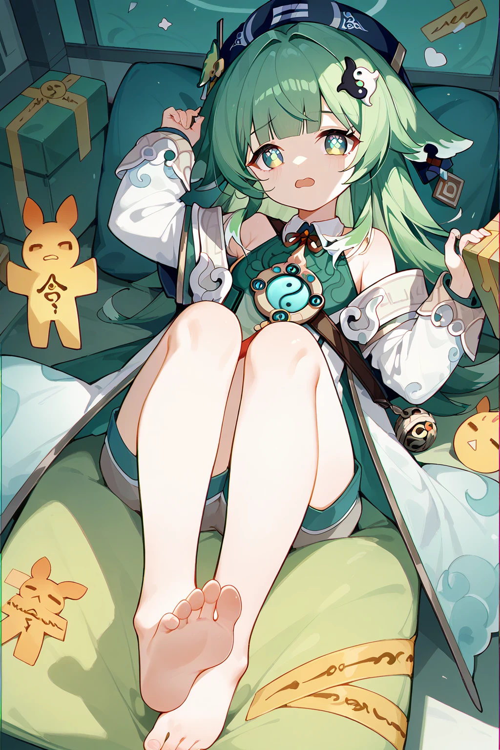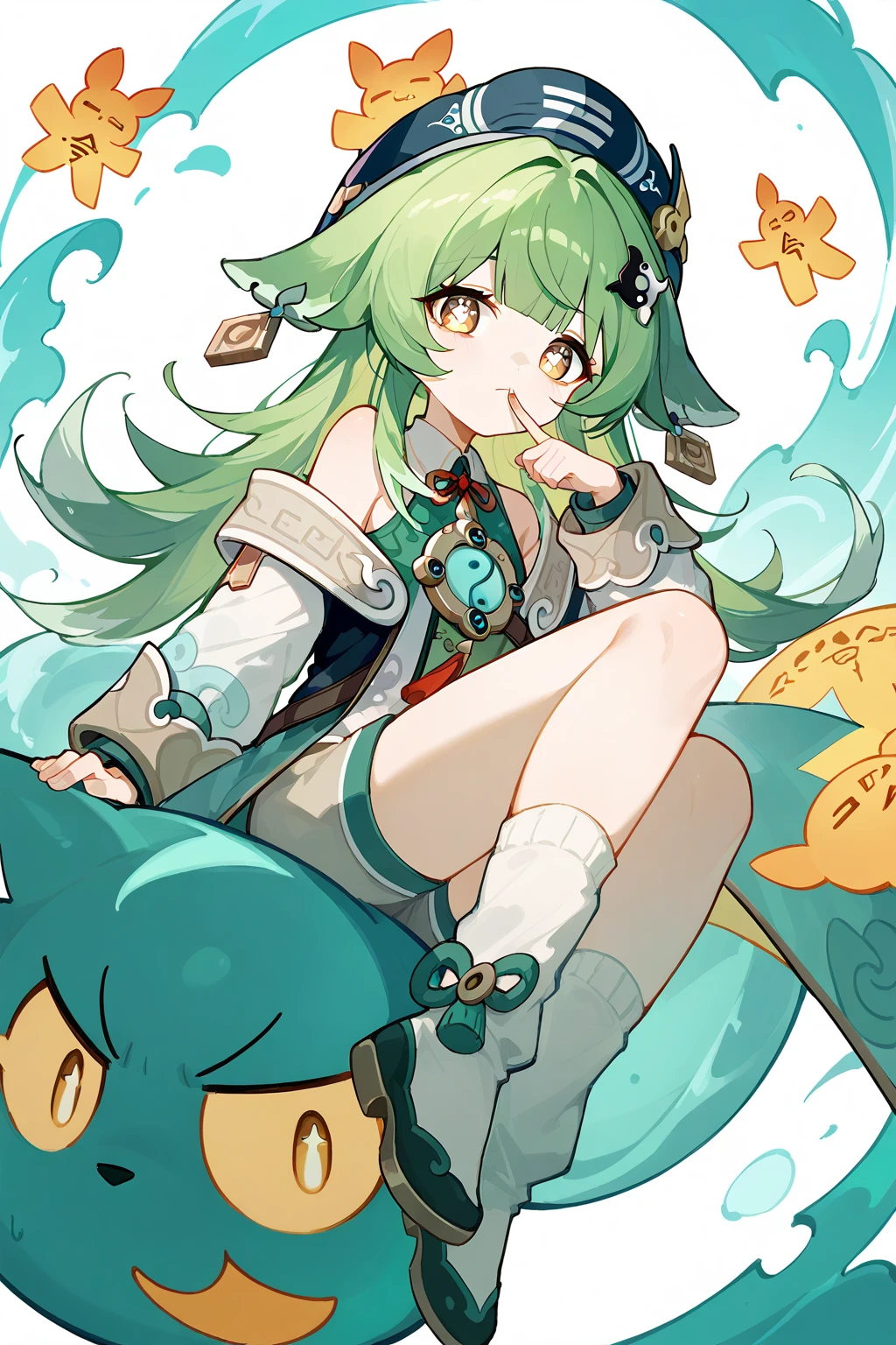 HuoHuo(Honkai: Star Rail),green hair,1girl,long hair,shorts,hat,ahoge,bangs,animal ears,long sleeves,grey eyes,bare shoulders,brown shorts,solo,black footwear,black headwear,hair ornament,