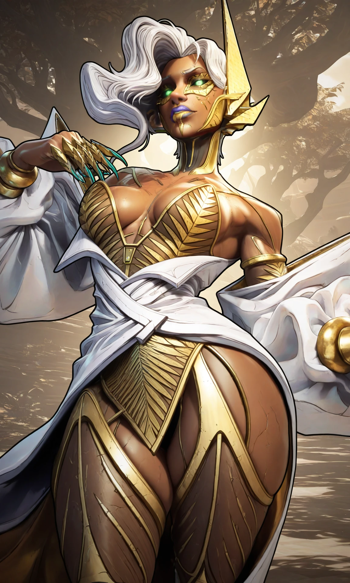 1girl, black sclera, white hair, green eyes, claws, clothing