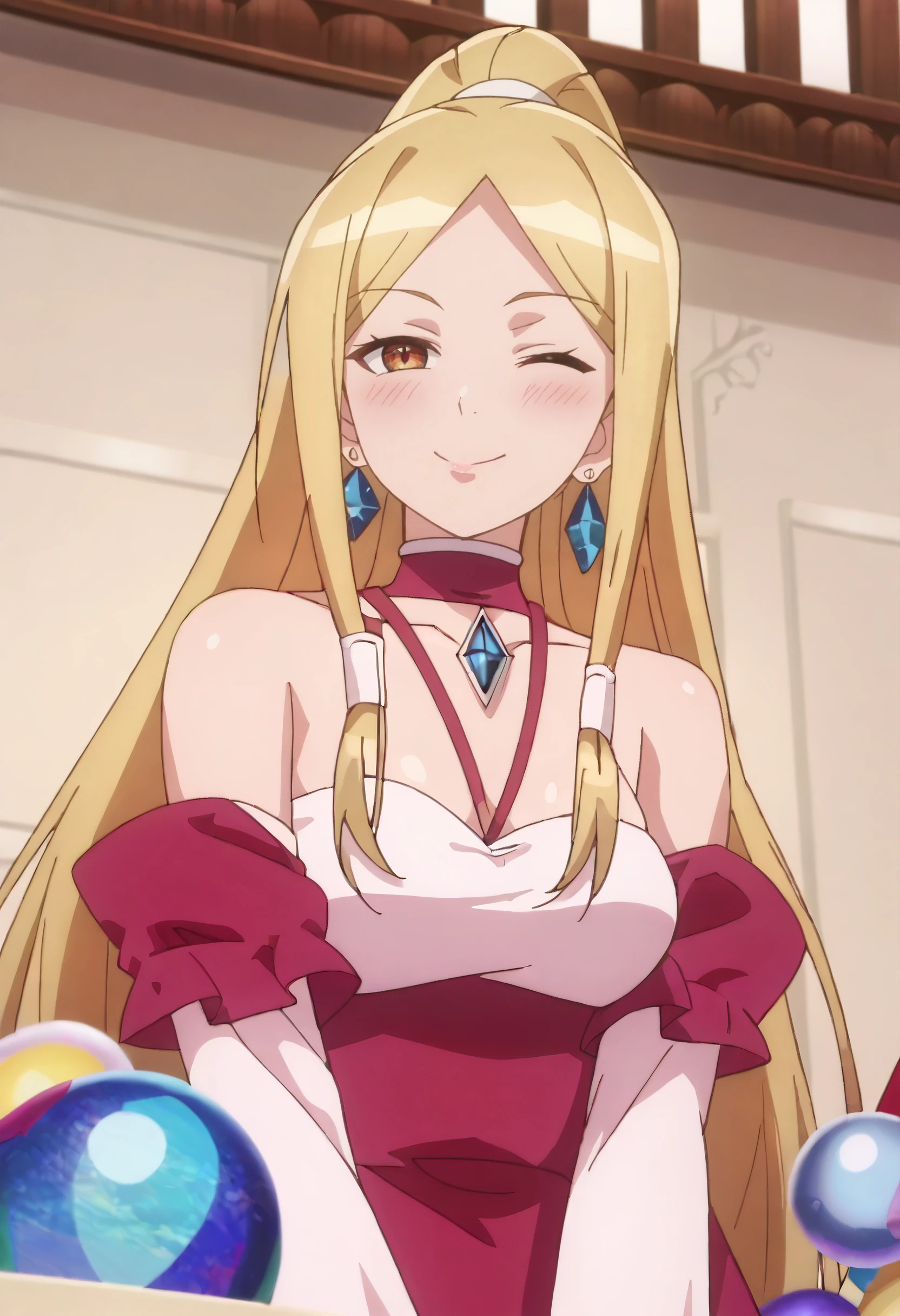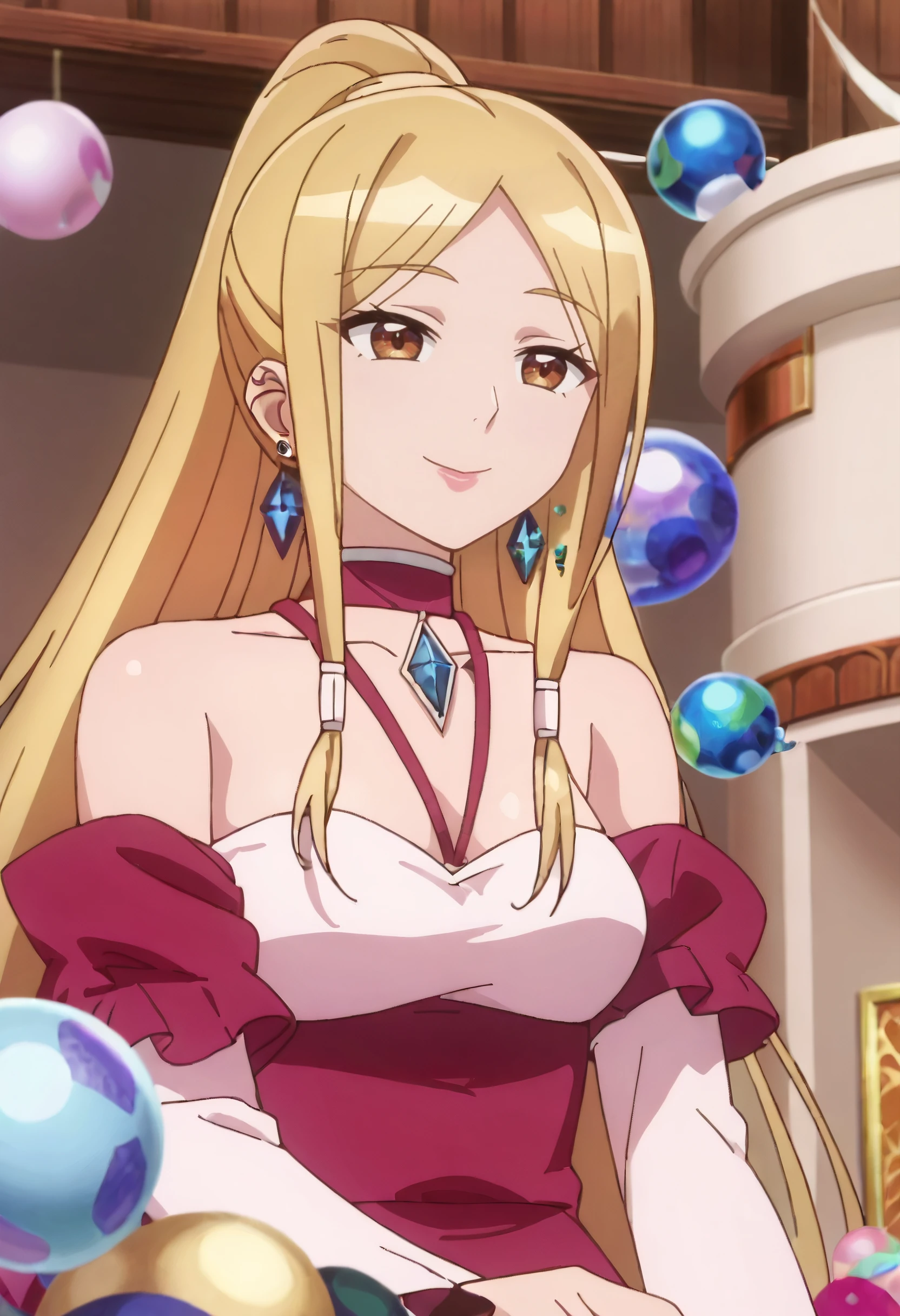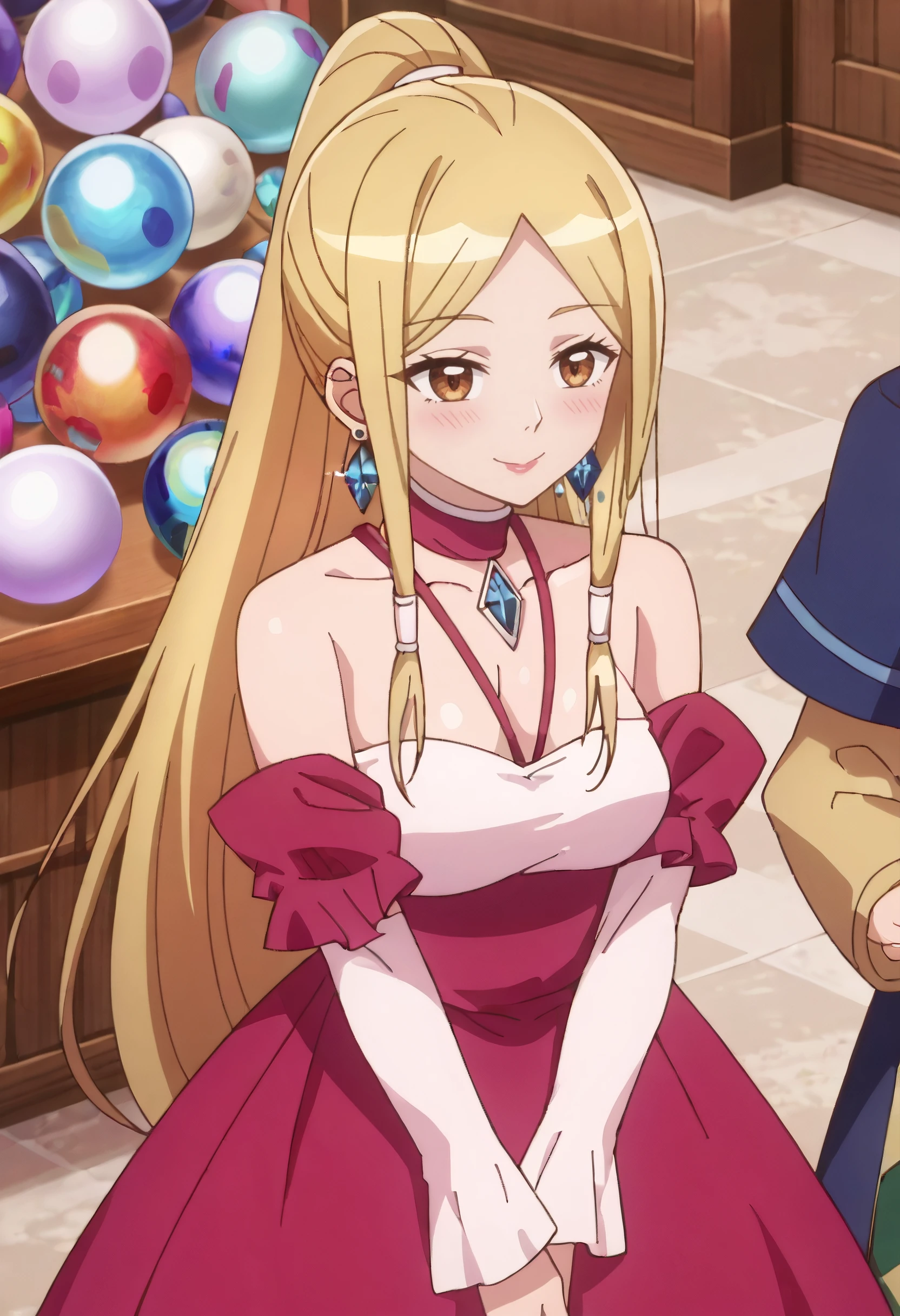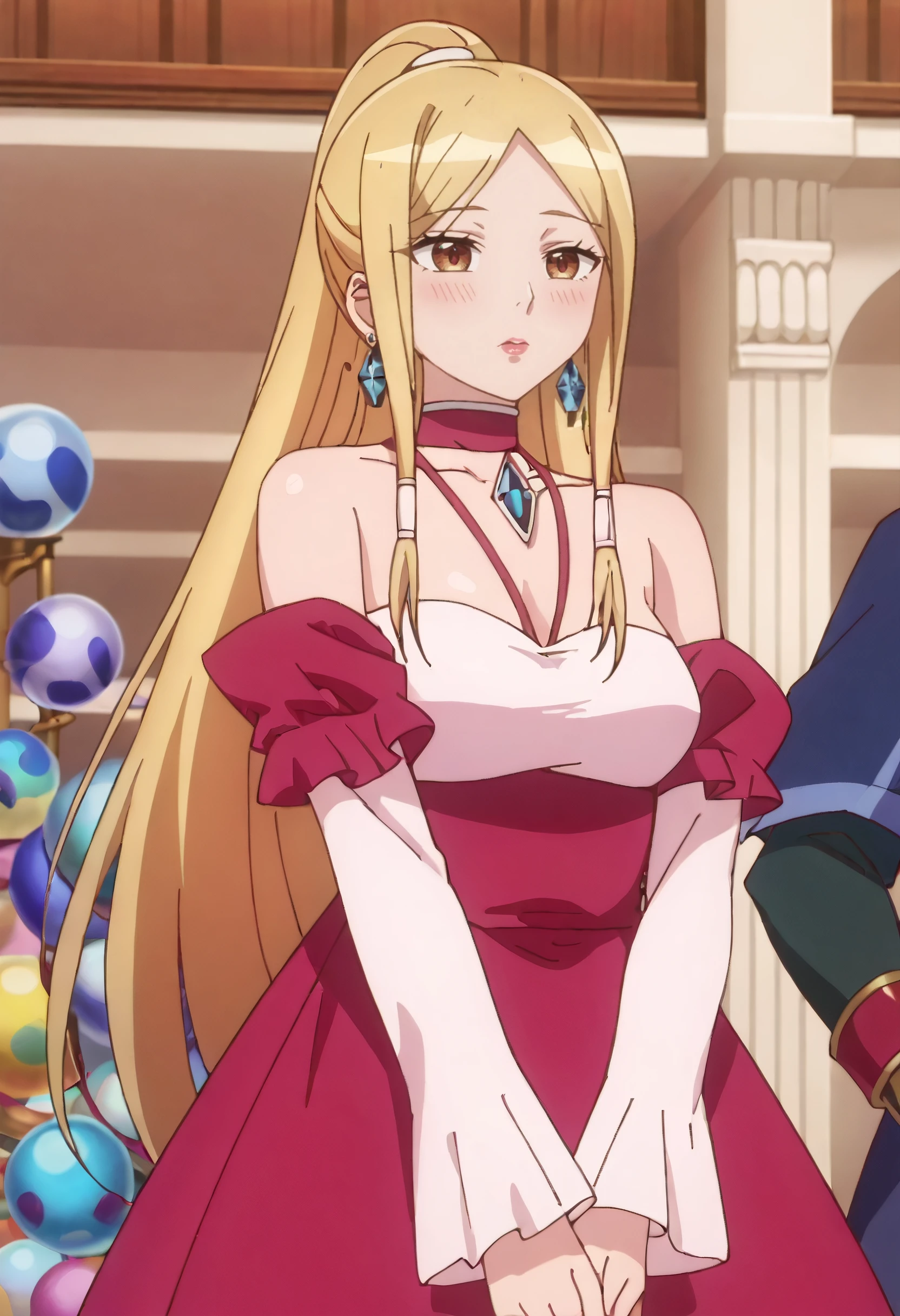 DarcyOutfit, bare shoulders, jewelry, red choker, earrings, pink dress, detached sleeves, long sleeves, off-shoulder dress, cleavage, long dress, sphere earrings, off shoulder, pink sleeves,