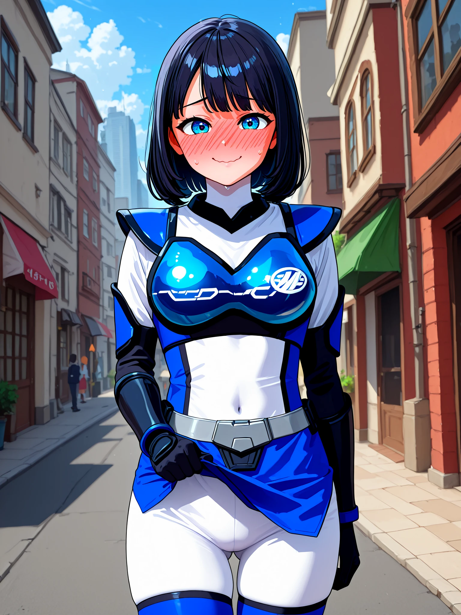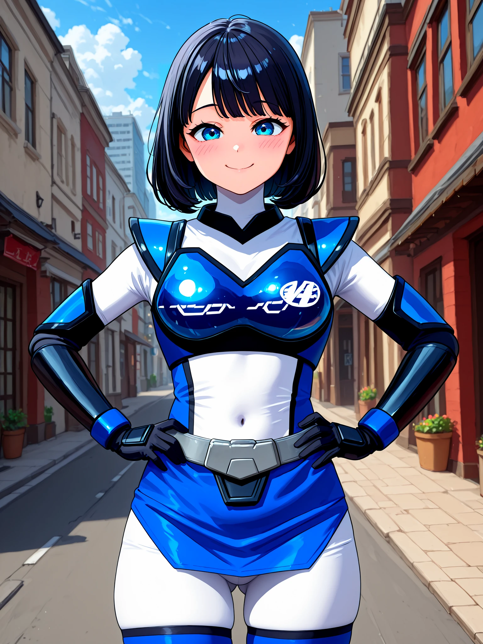 ak1bab1ue, white neck, white bodysuit, bodysuit under clothes, blue armor, boobplate, shoulder armor, elbow gloves, black gloves, black arm guards, silver belt, microskirt, blue skirt, blue thighhighsFor full body: