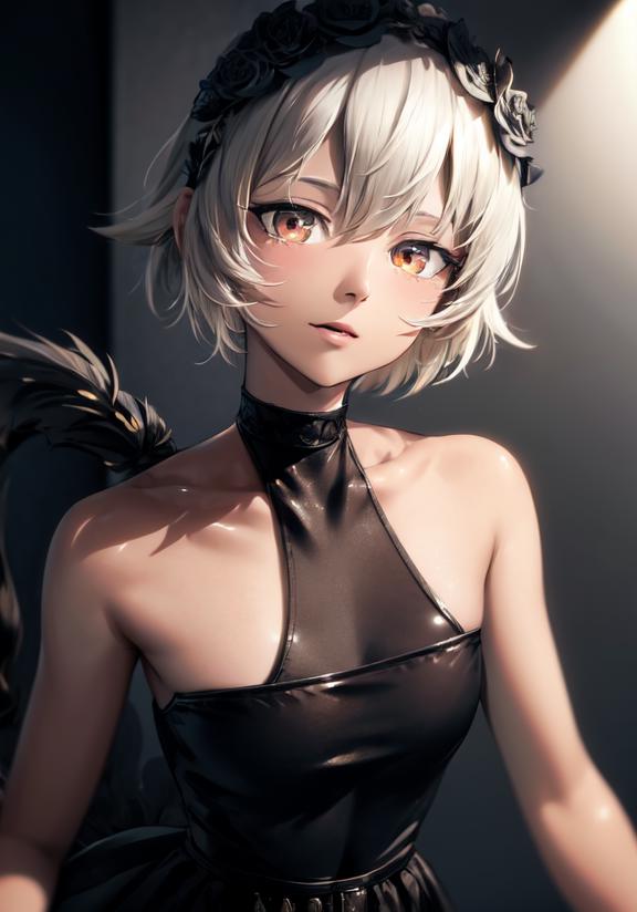 1 girl, white hair, short hair, orange eyes, brown skin, glove, black clothes, kimono black,