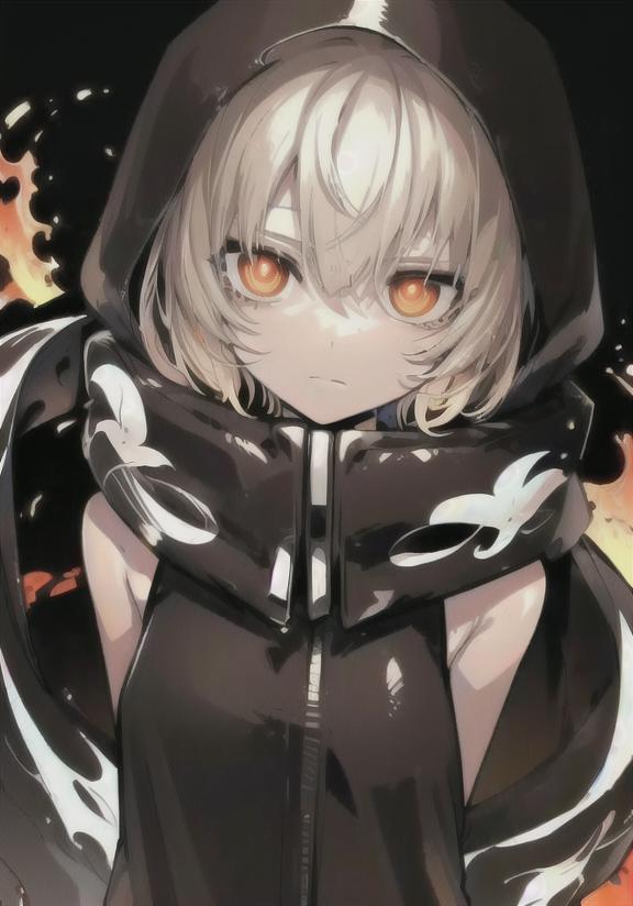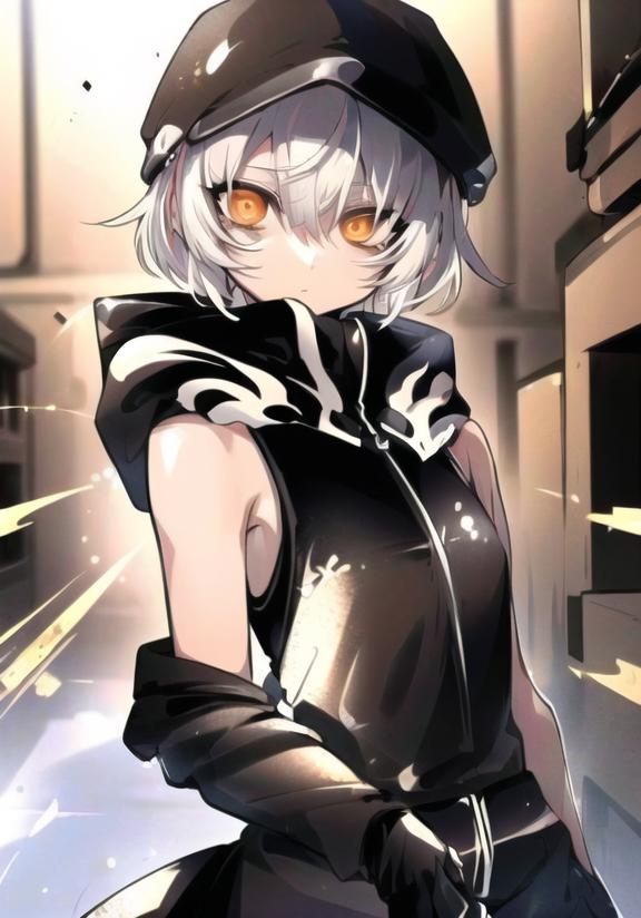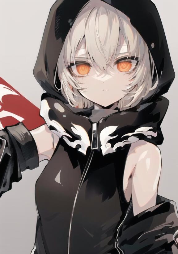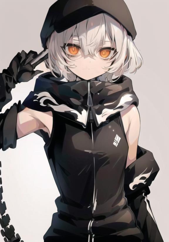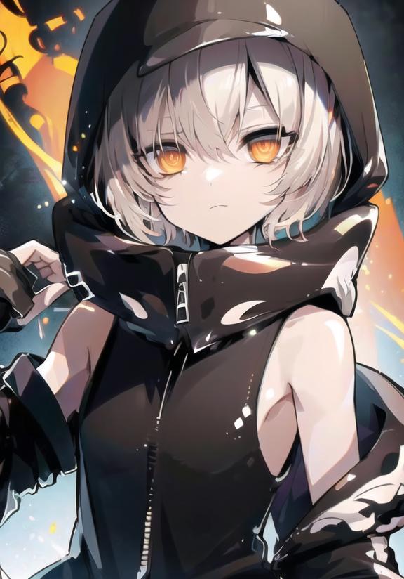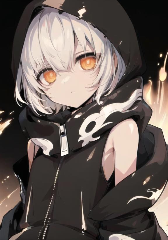 1 girl, white hair, short hair, orange eyes, tail, brown skin, hood, black clothes, sleeveless jacket,