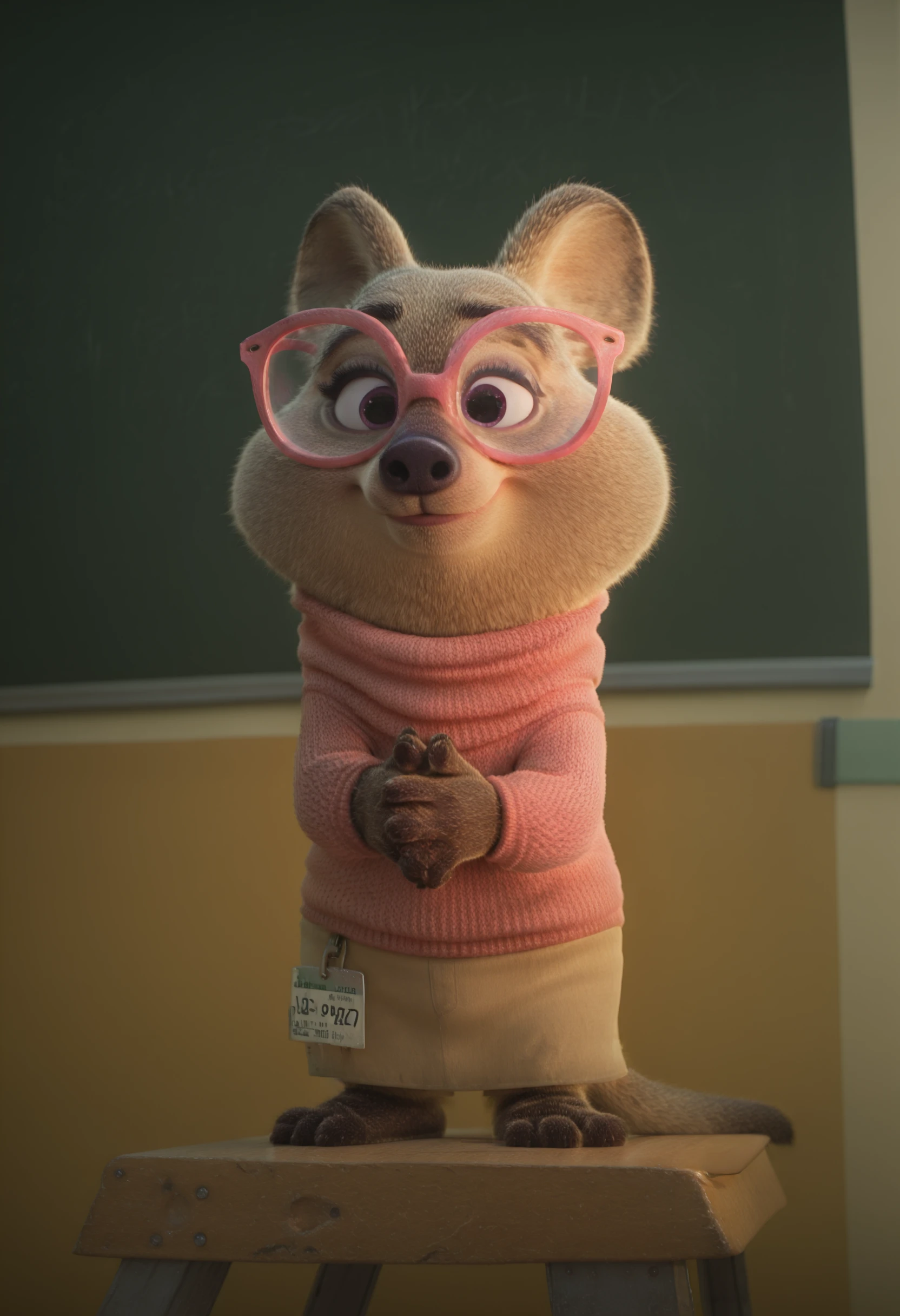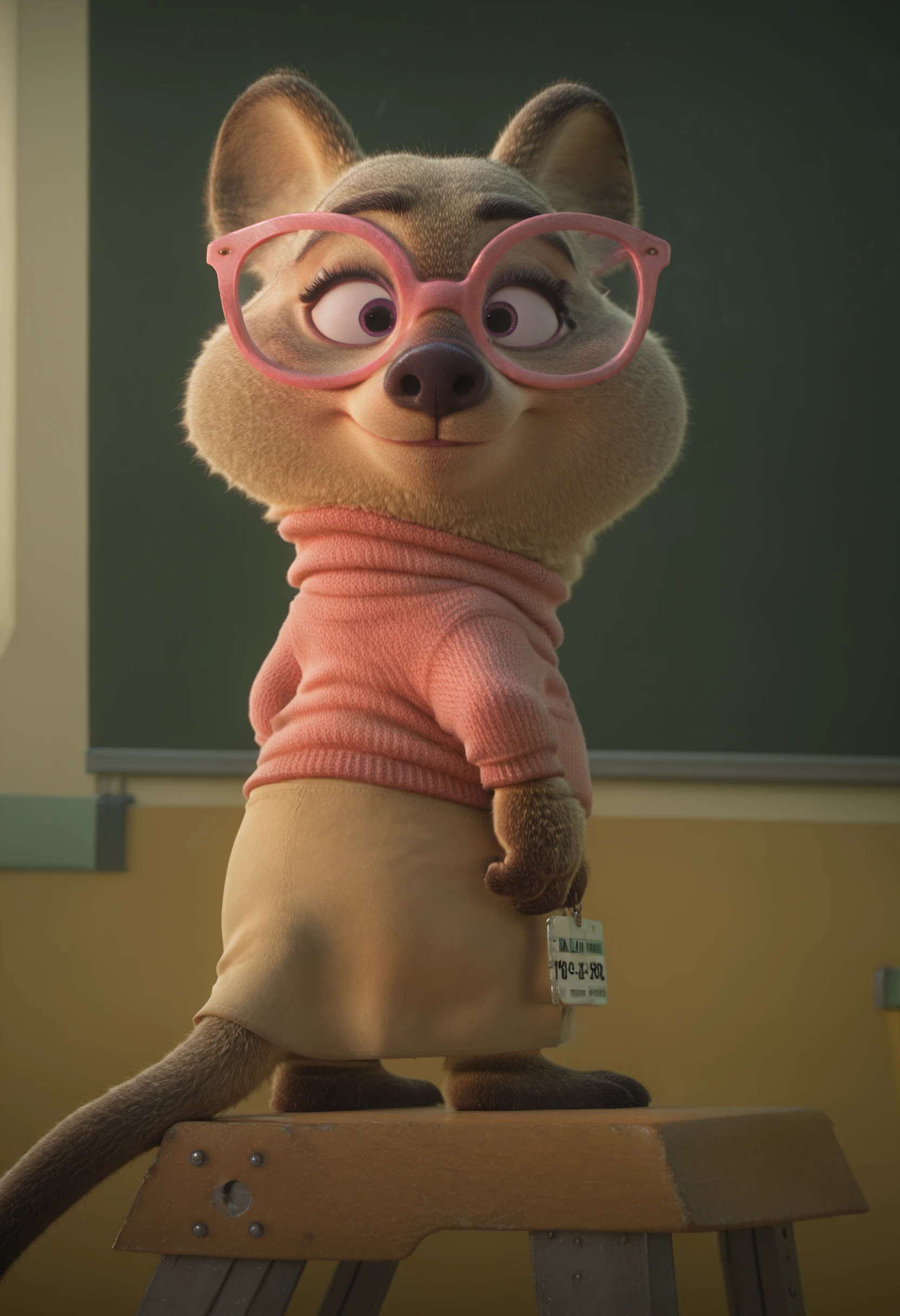 quokka, pink sweater, pink glasses, taupe skirt