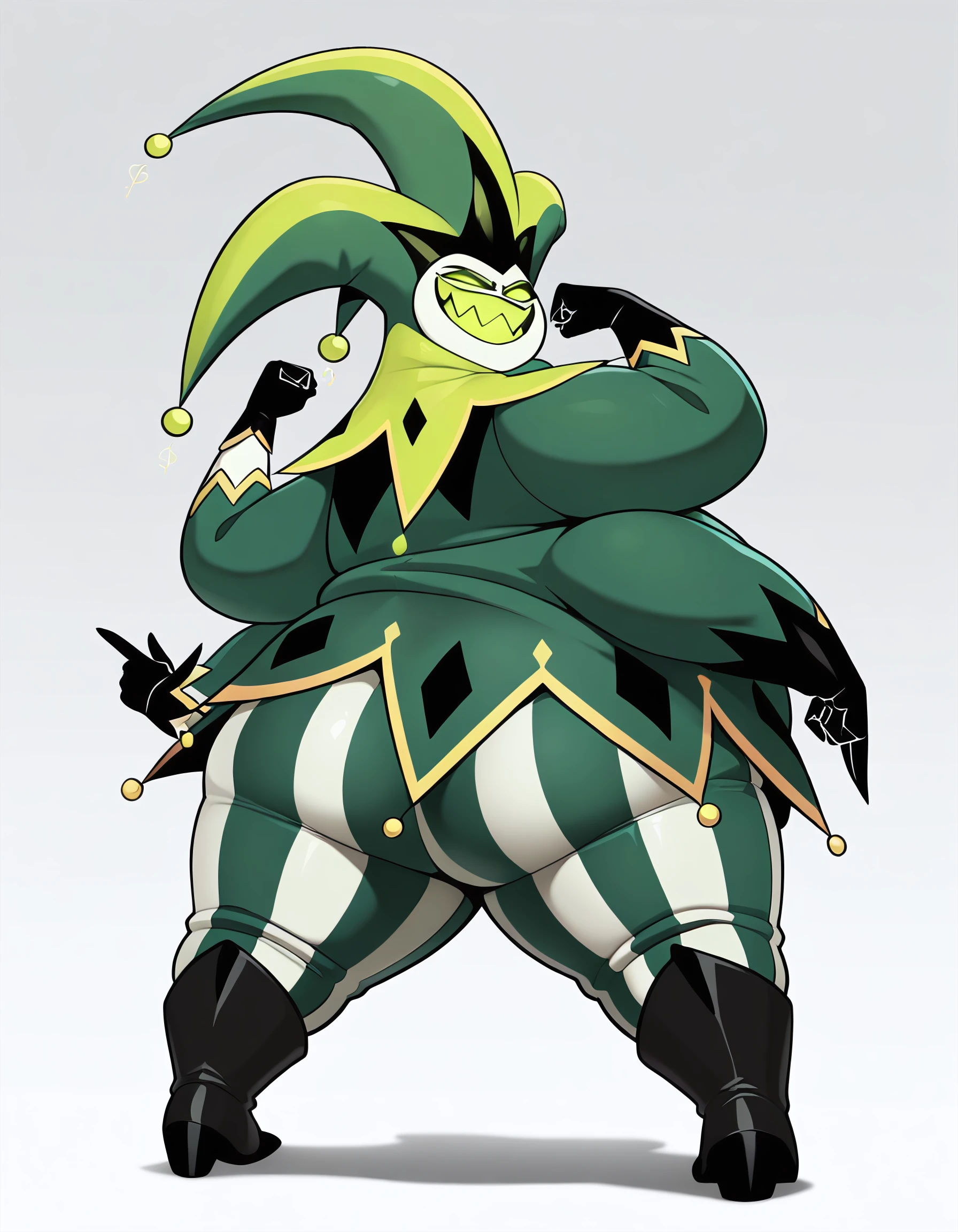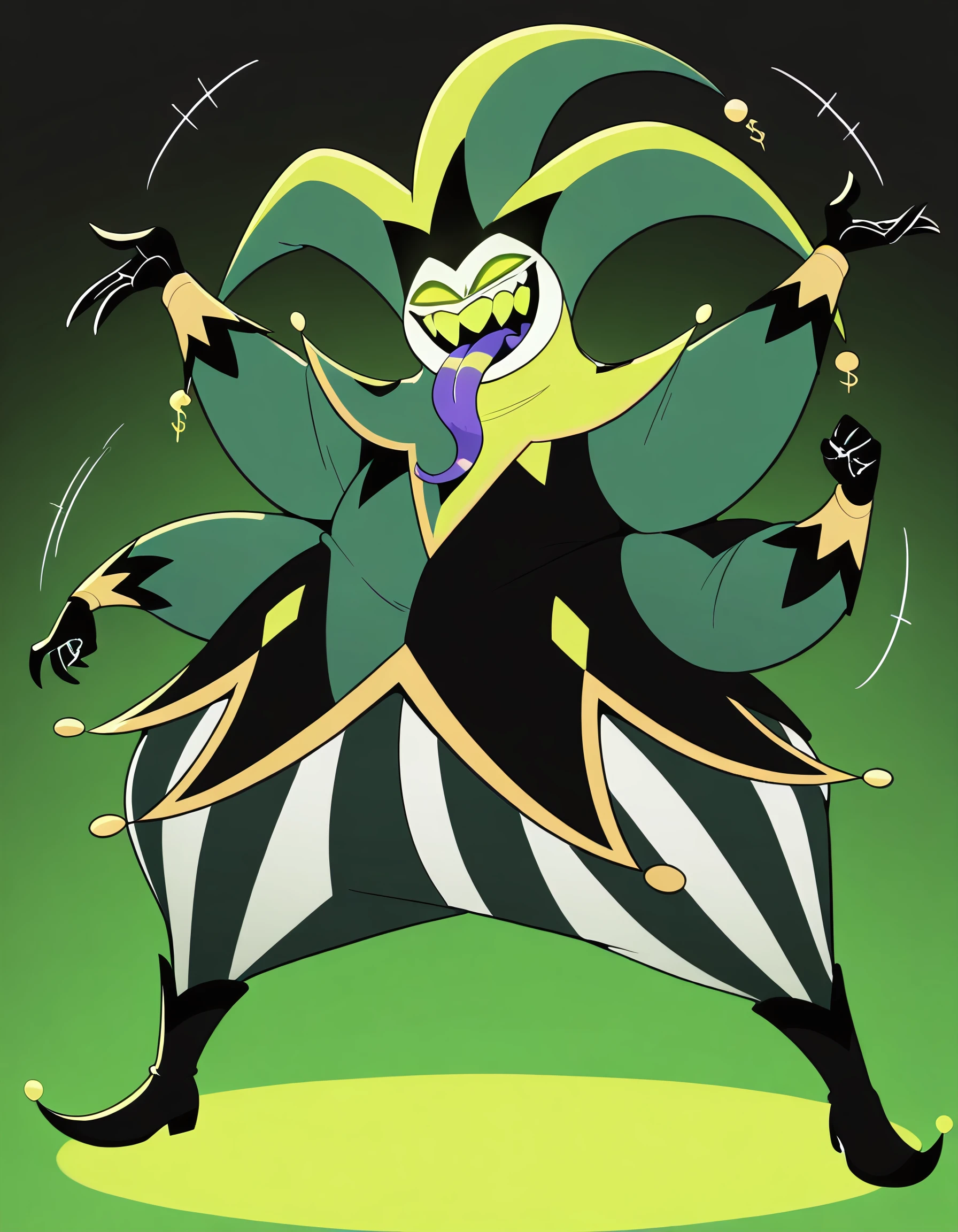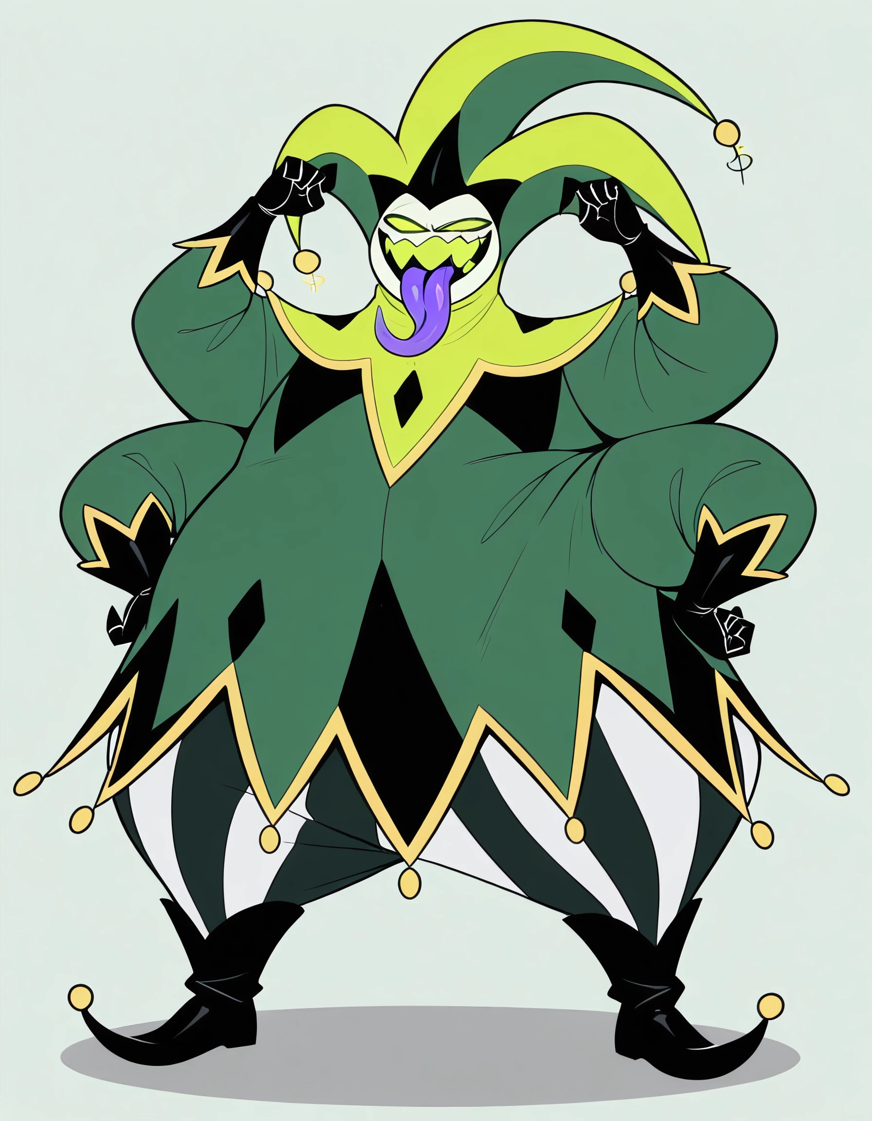 helluva boss, 1boy, male, plump, fat, obese, green theme, greenish white skin, greenish white body, monster, green headwear, jester hat, green eyes, green teeth, empty eyes, no pupils,