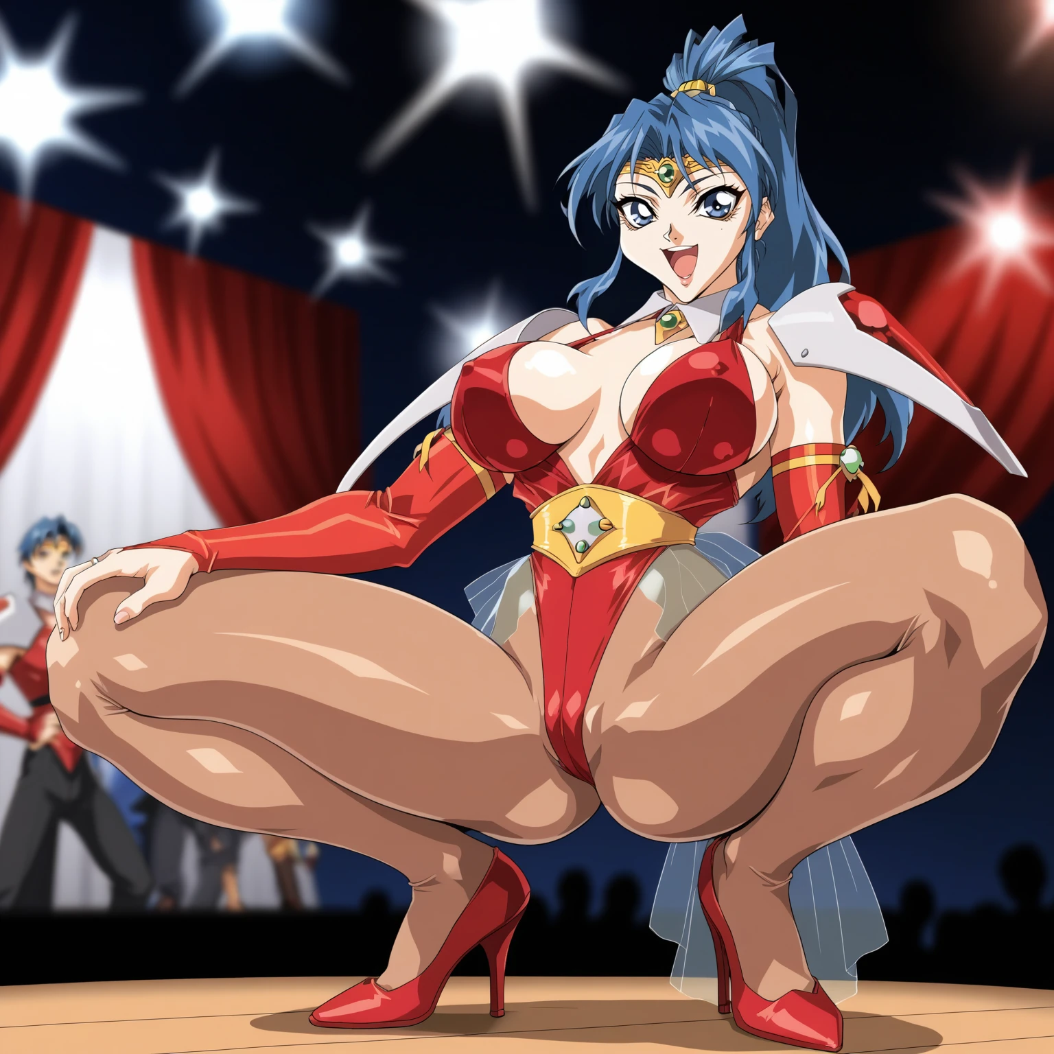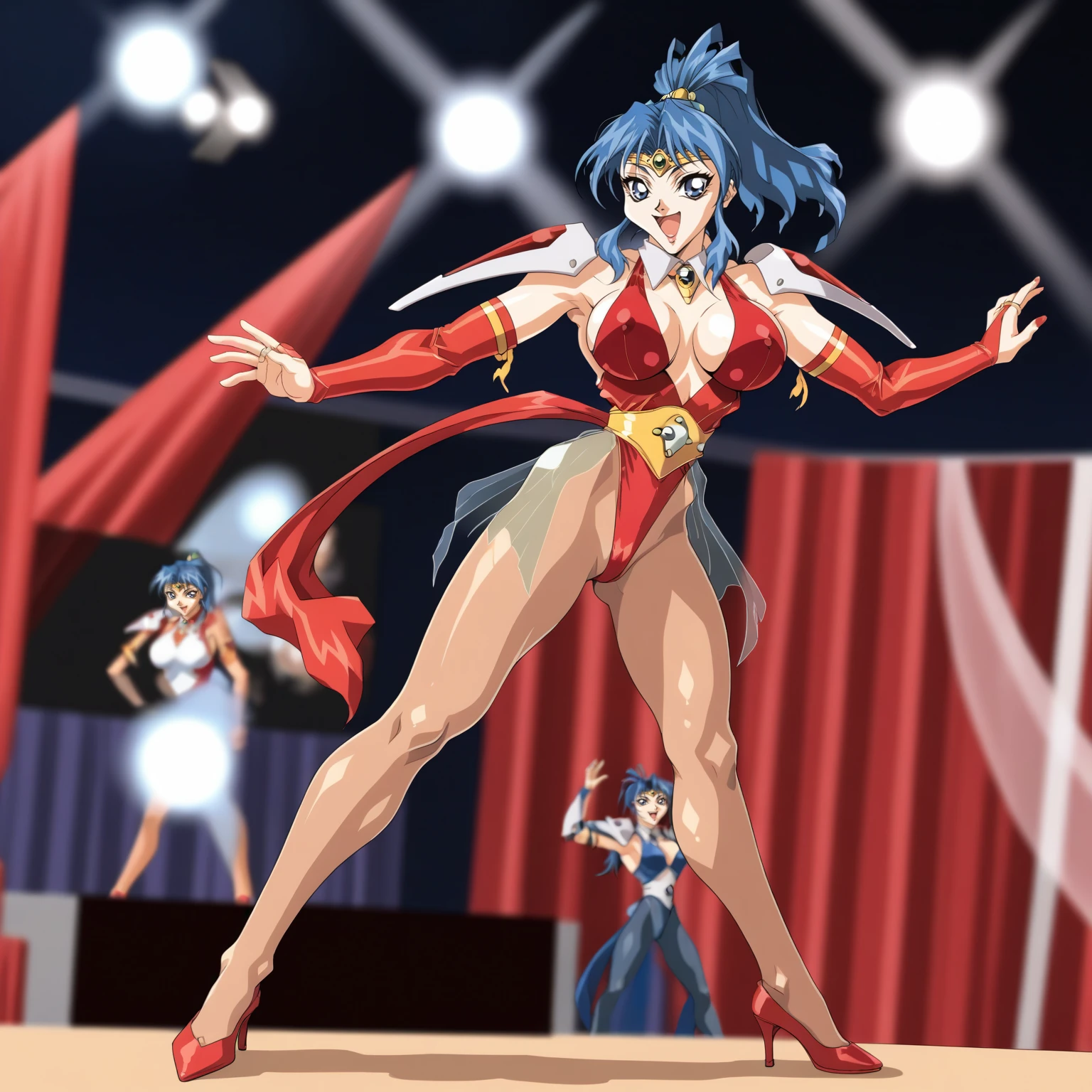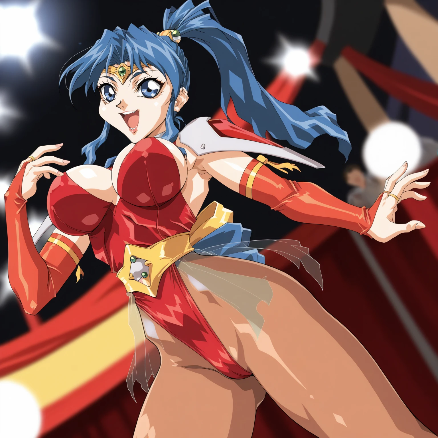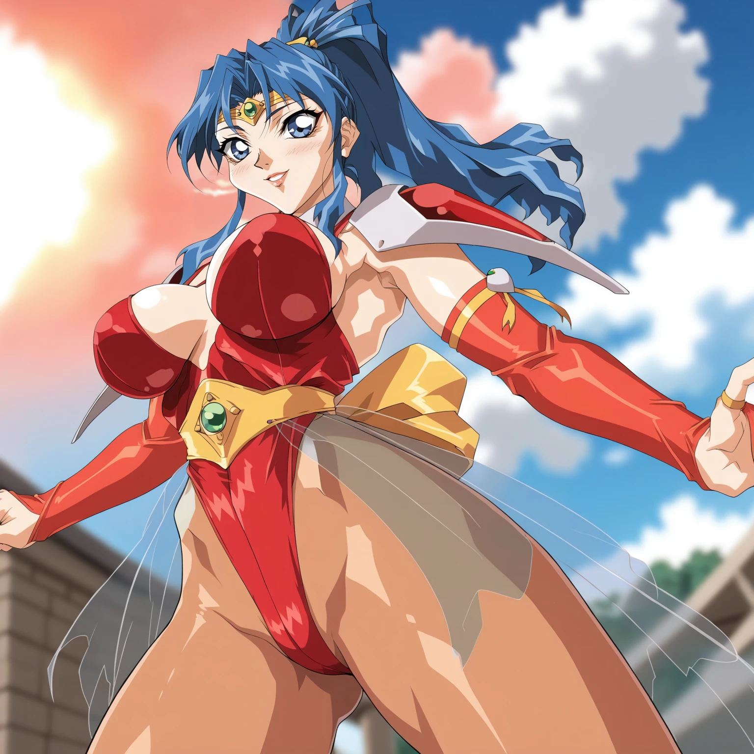 circlet, shoulder armor,red leotard, bridal gauntlets, see-through,pantyhose,