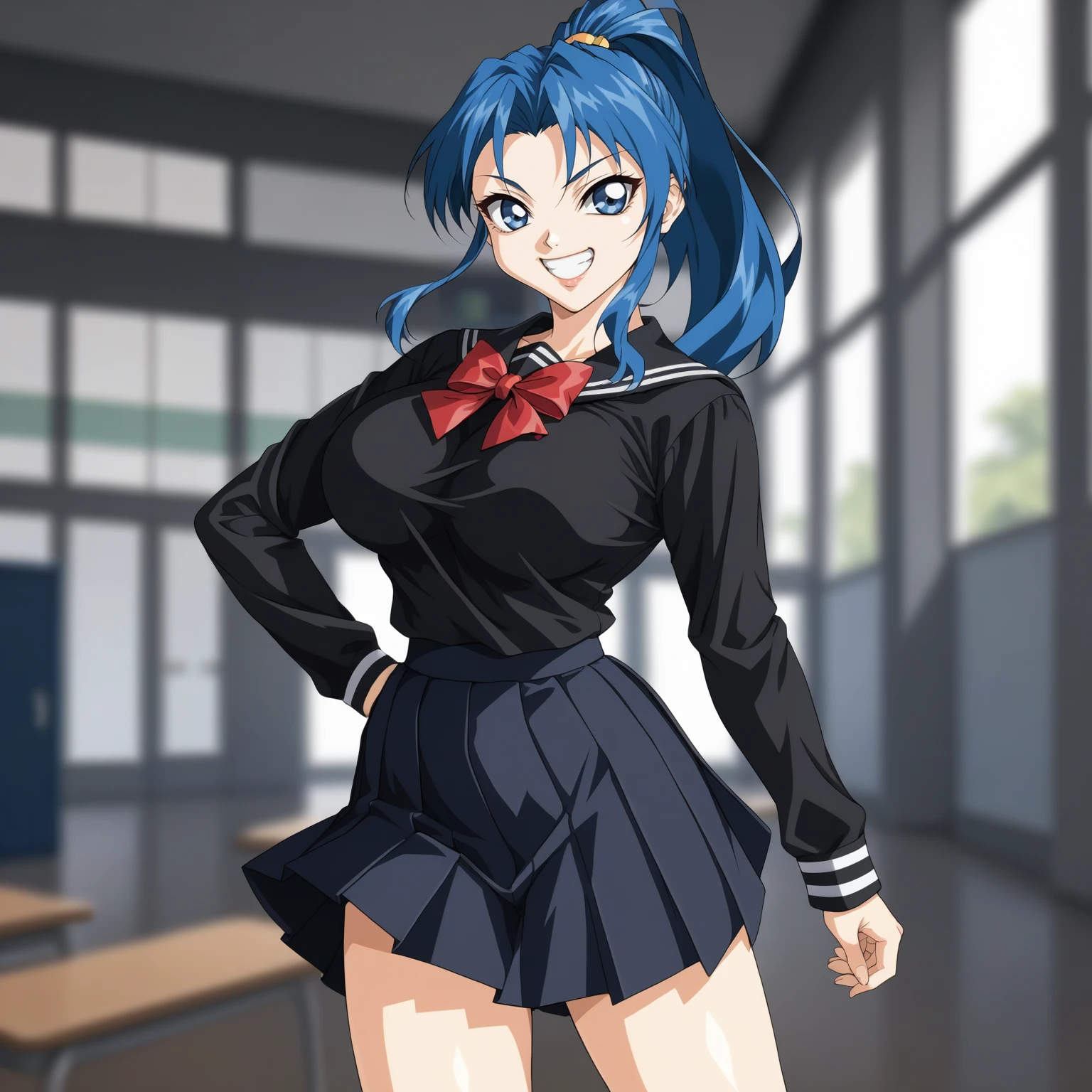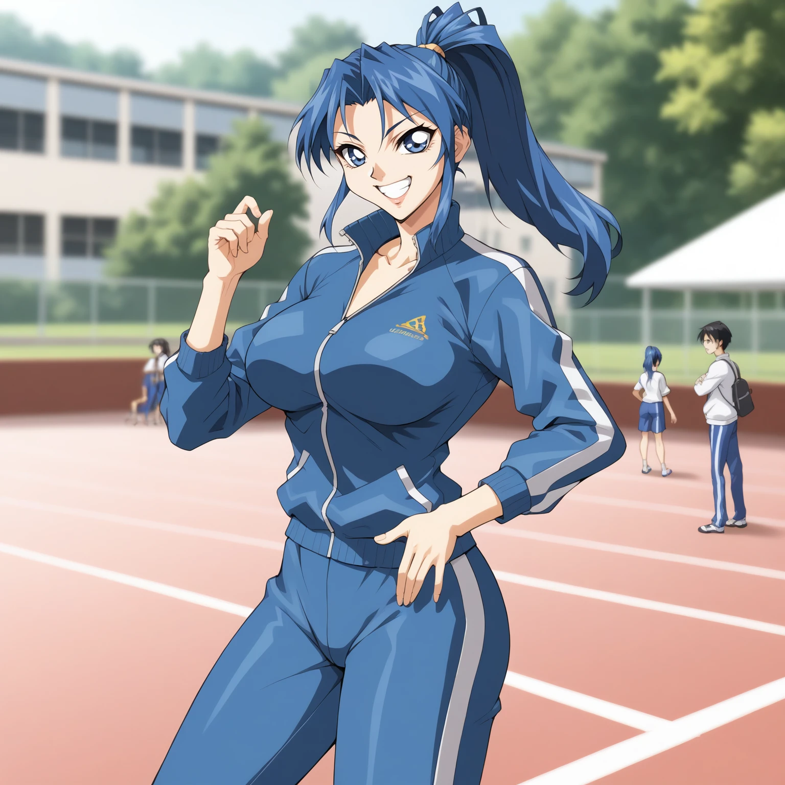 HishizakiShire,1girl,blue hair,high ponytail,blue eyes, large breasts,