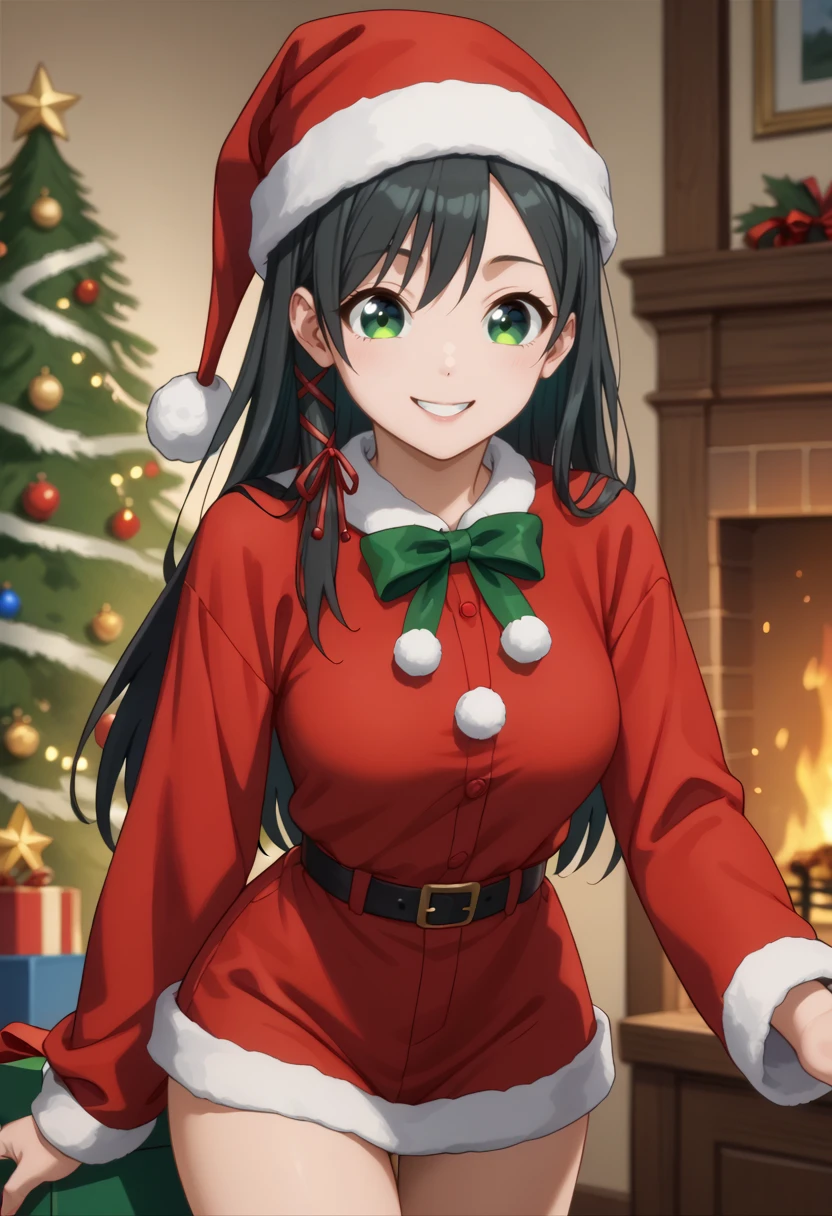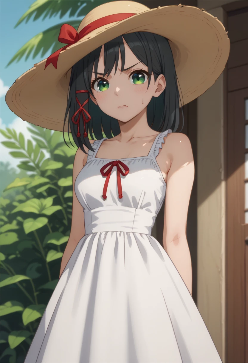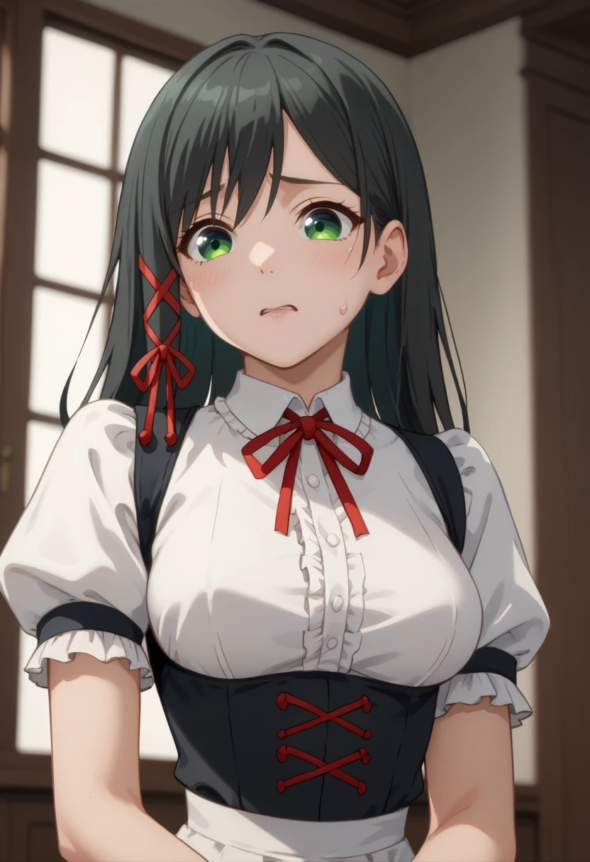 amagamiyae, black hair, green eyes, red ribbon, hair ribbon