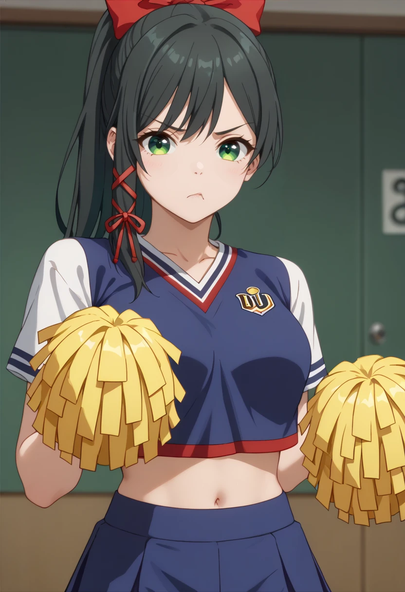 character: amagamiyae, black hair, green eyes, red ribbon, hair ribbon