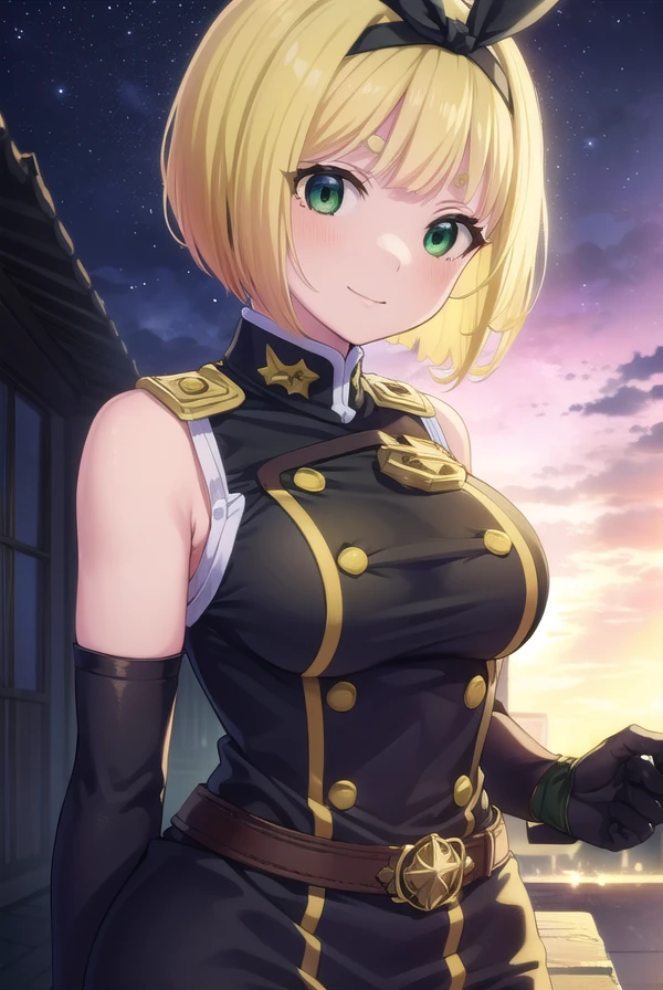 gloves, shorts, elbow gloves, belt, buttons, military uniform, military, (bare shoulders:1.5), (black military uniform:1.7),