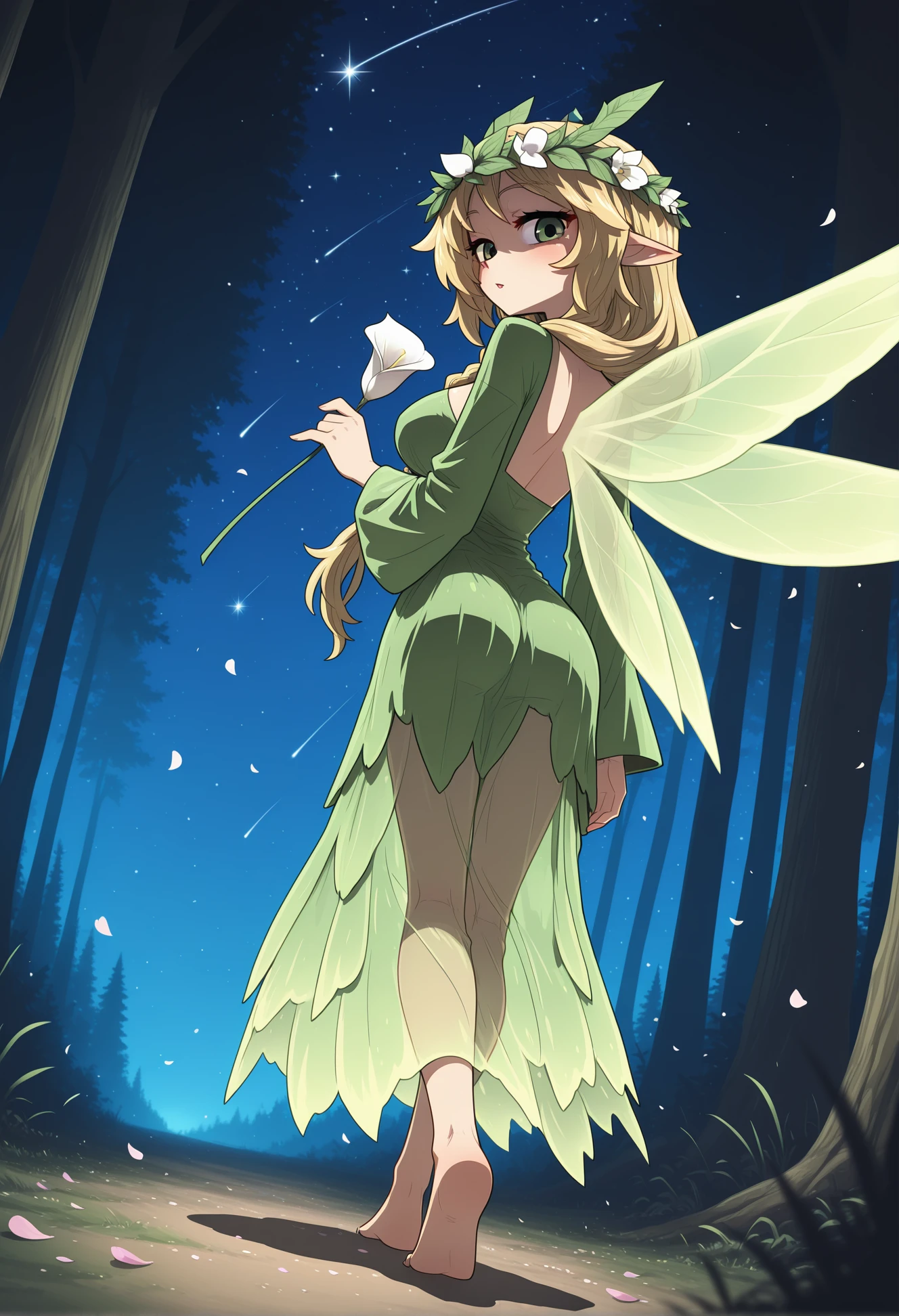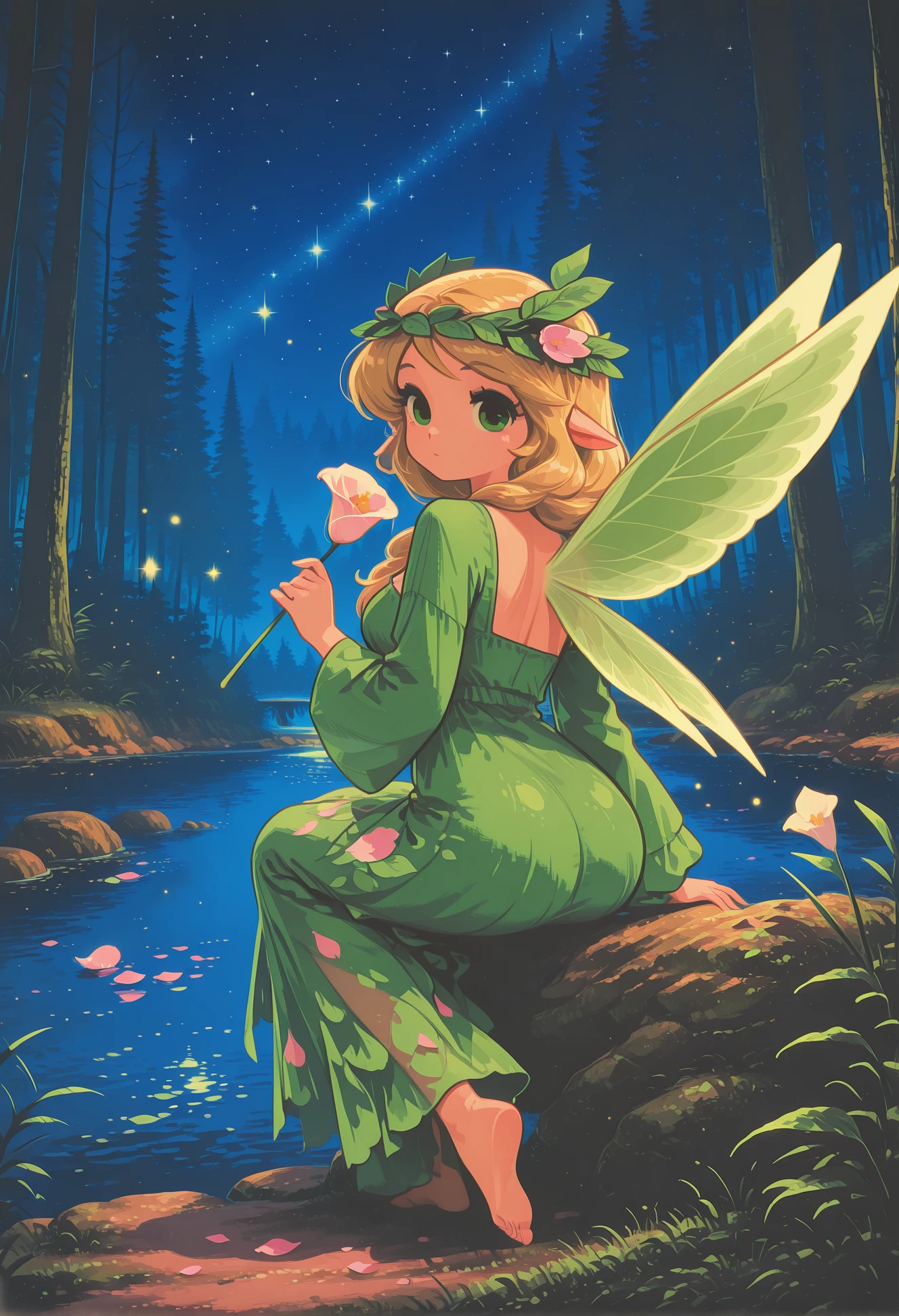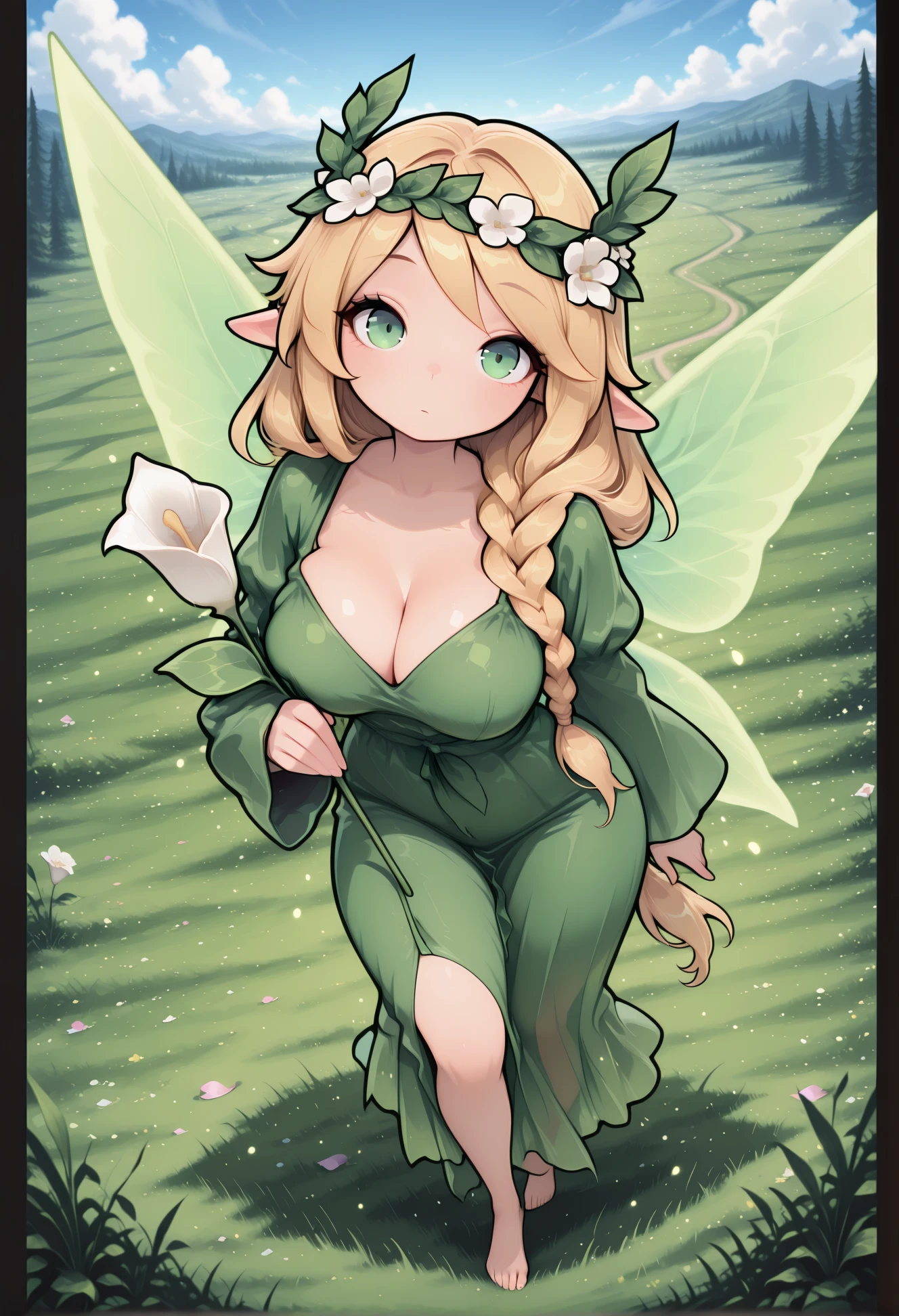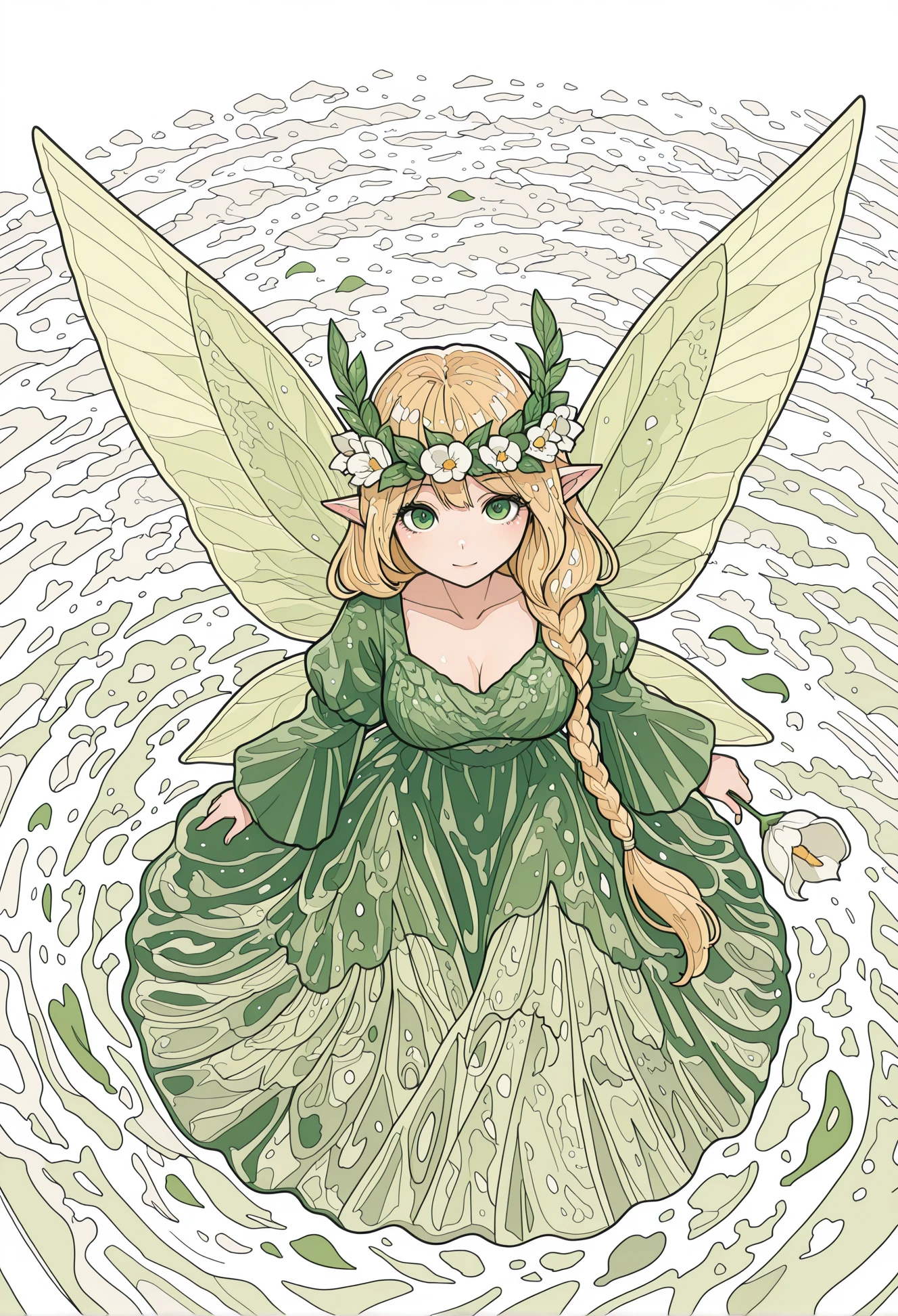 Helping tags: 1girl, pointy ears, wings, green eyes, blonde hair, long hair, fairy wings, barefoot, very long hair, braid, single braid,