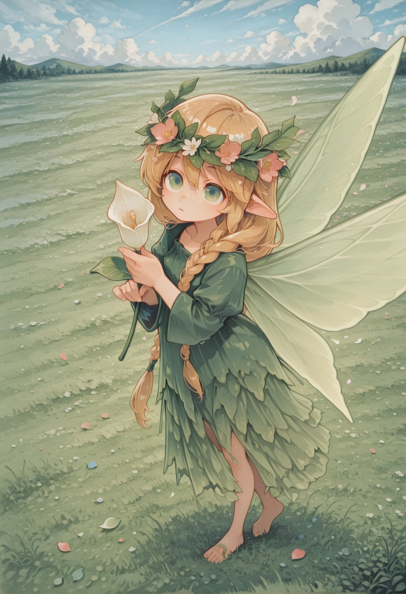 green dress, petal dress, wide sleeves, hair flower, head wreath, calla lily, holding flower,