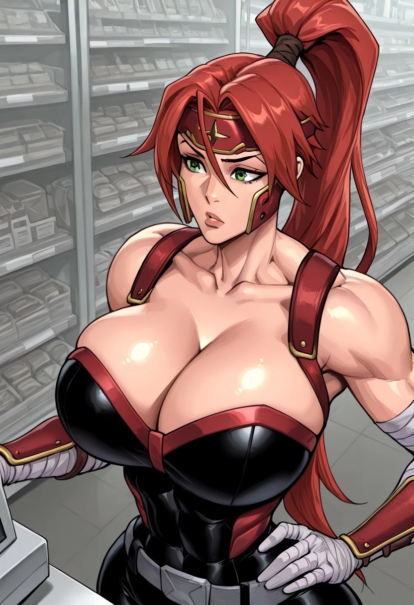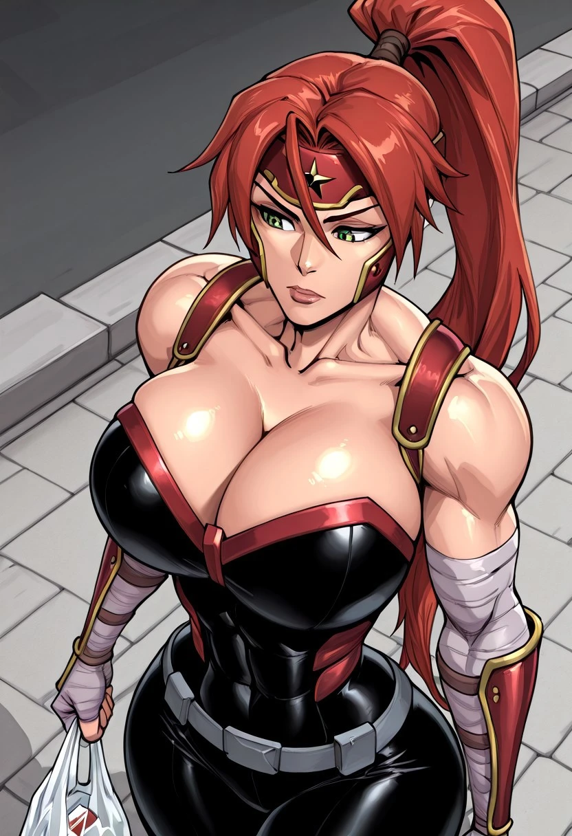 red hair, long hair, ponytail, hair between eyes, green eyes, muscular female,