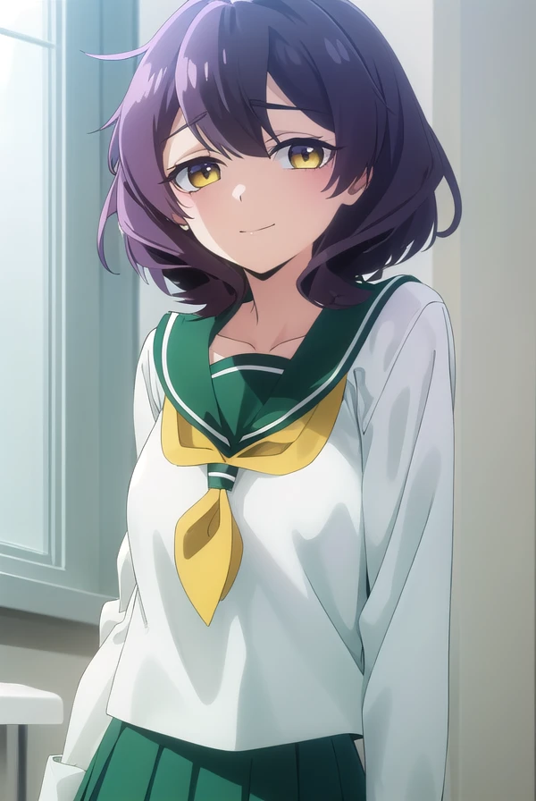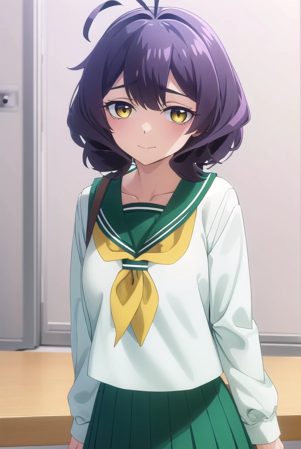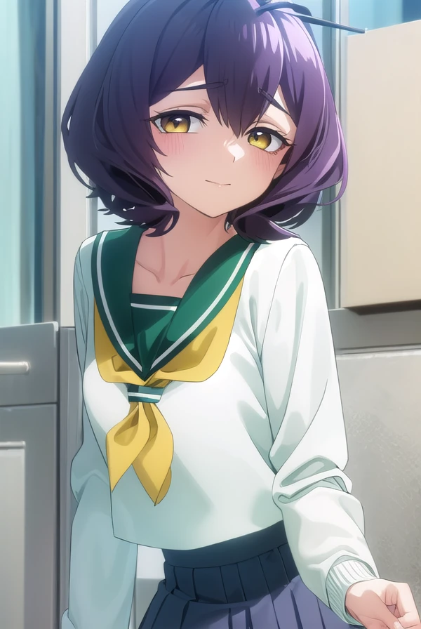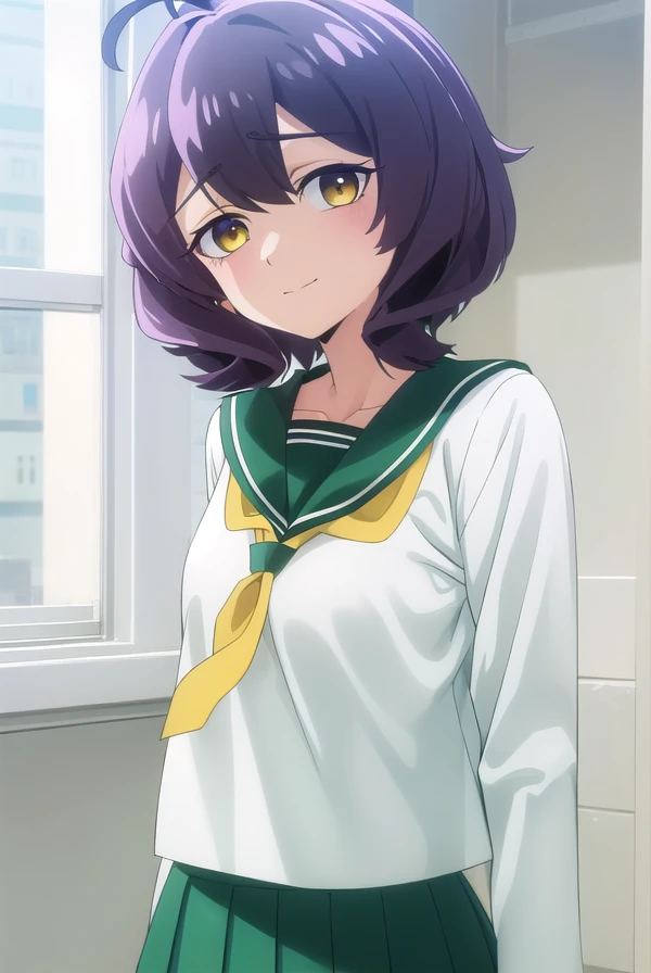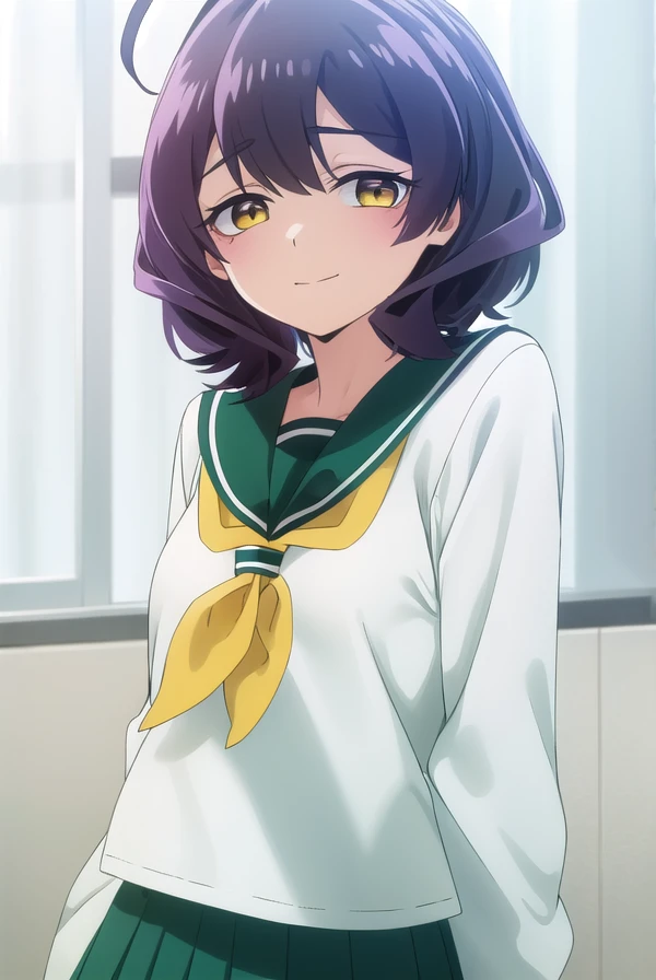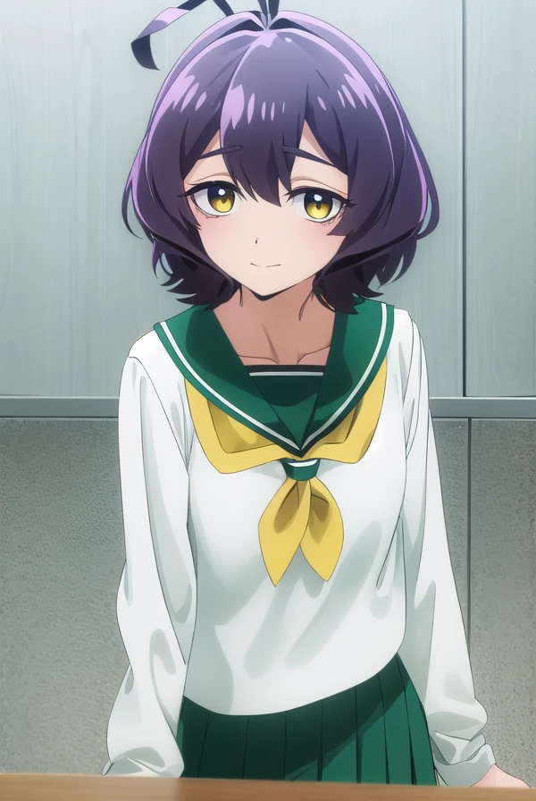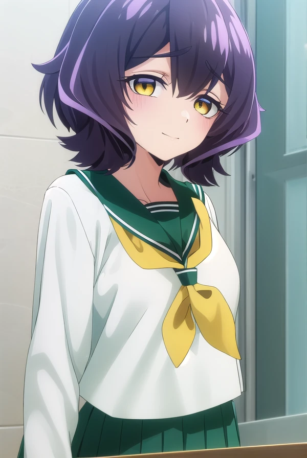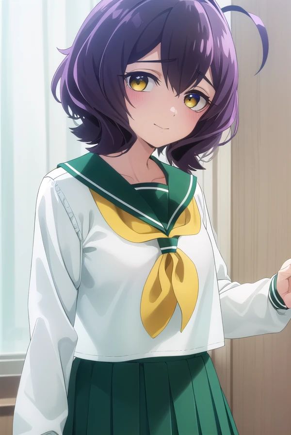 utena hiiragi, short hair, (yellow eyes:1.3), purple hair, ahoge, hair intakes,