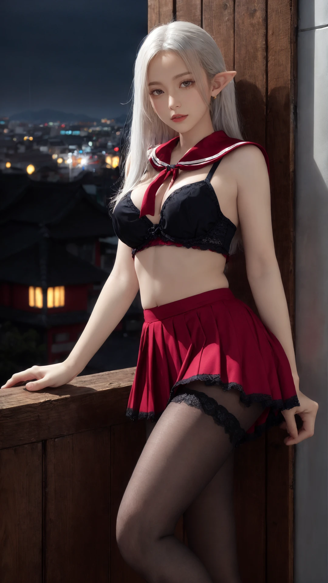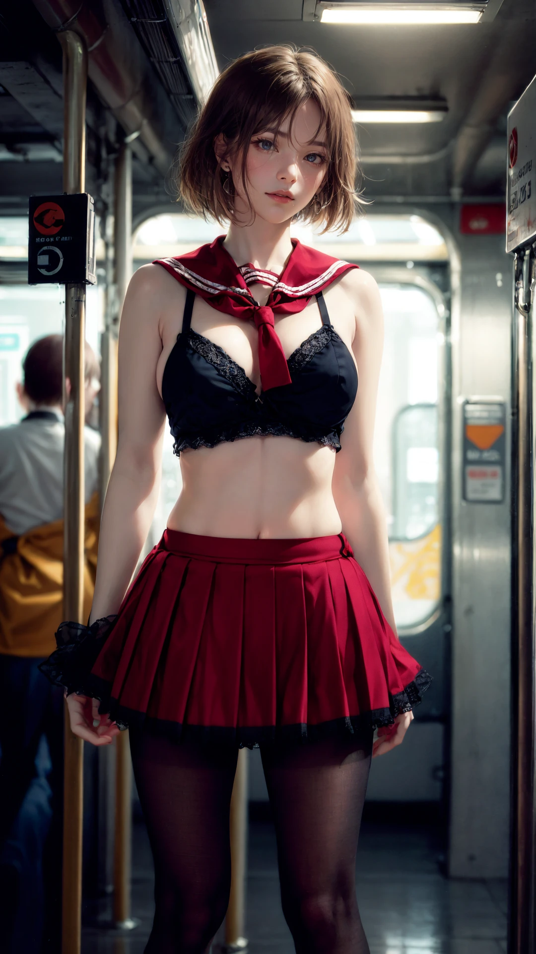 tutututu,red_skirt, school uniform, black_bra, underwear,lingerie,midriff,red_sailor_collar,