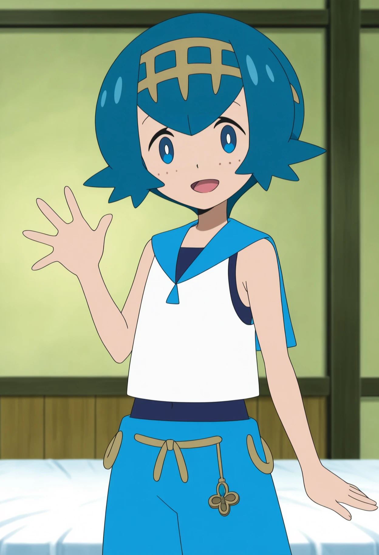 lanapokemon, blue eyes, blue hair, freckles, hairband, short hair, white pupils, yellow hairband, bright pupils, swimsuit under clothes, blue swimsuit, white shirt, sleeveless shirt, baggy pants, blue pants, blue sailor collar