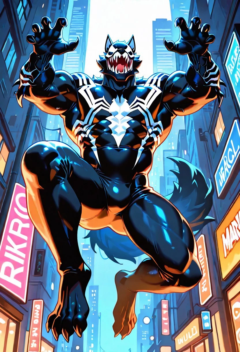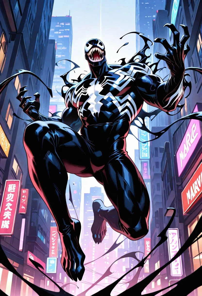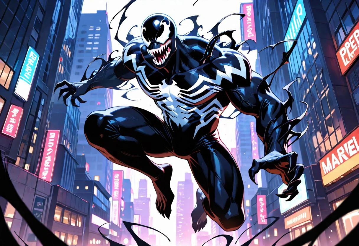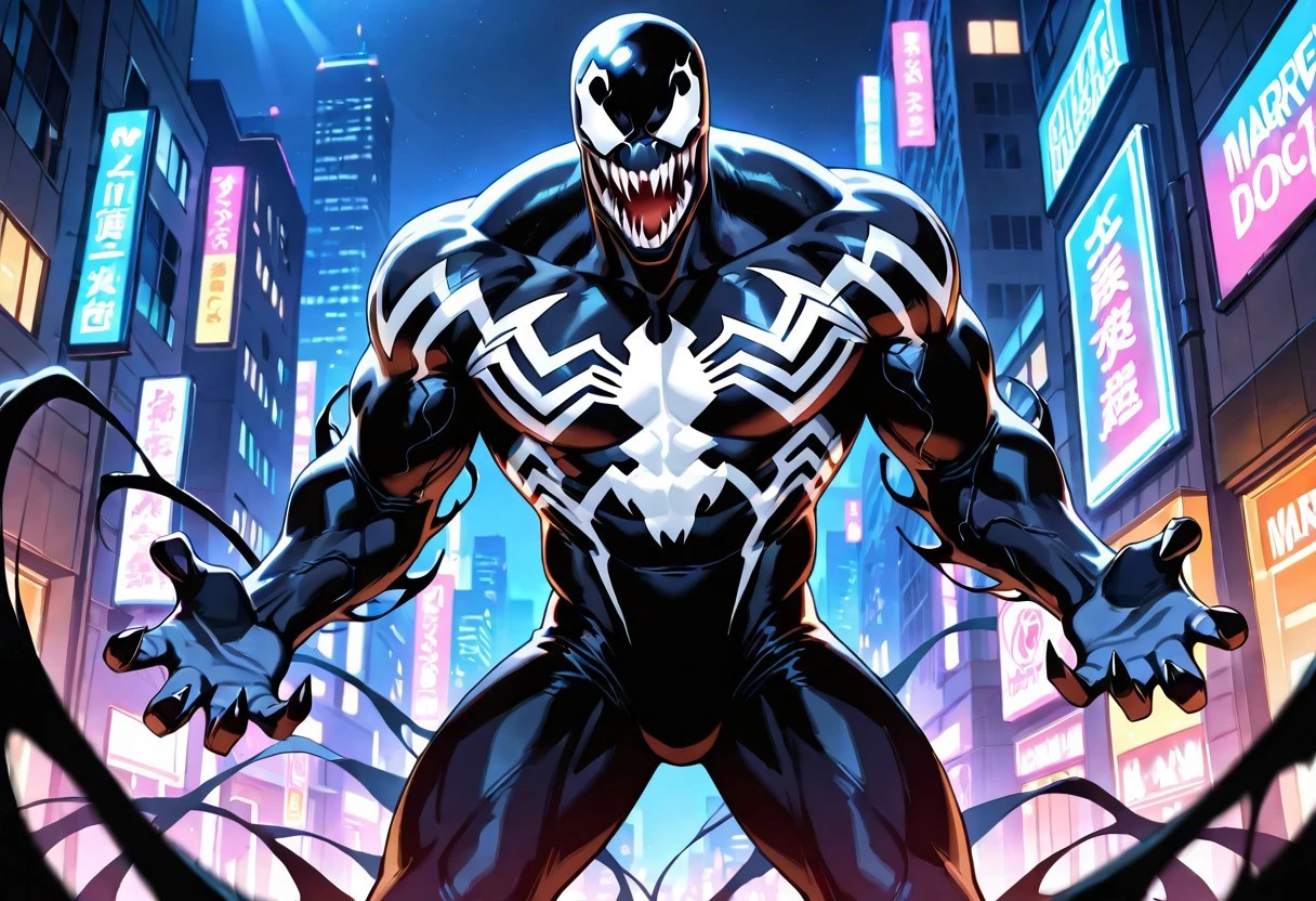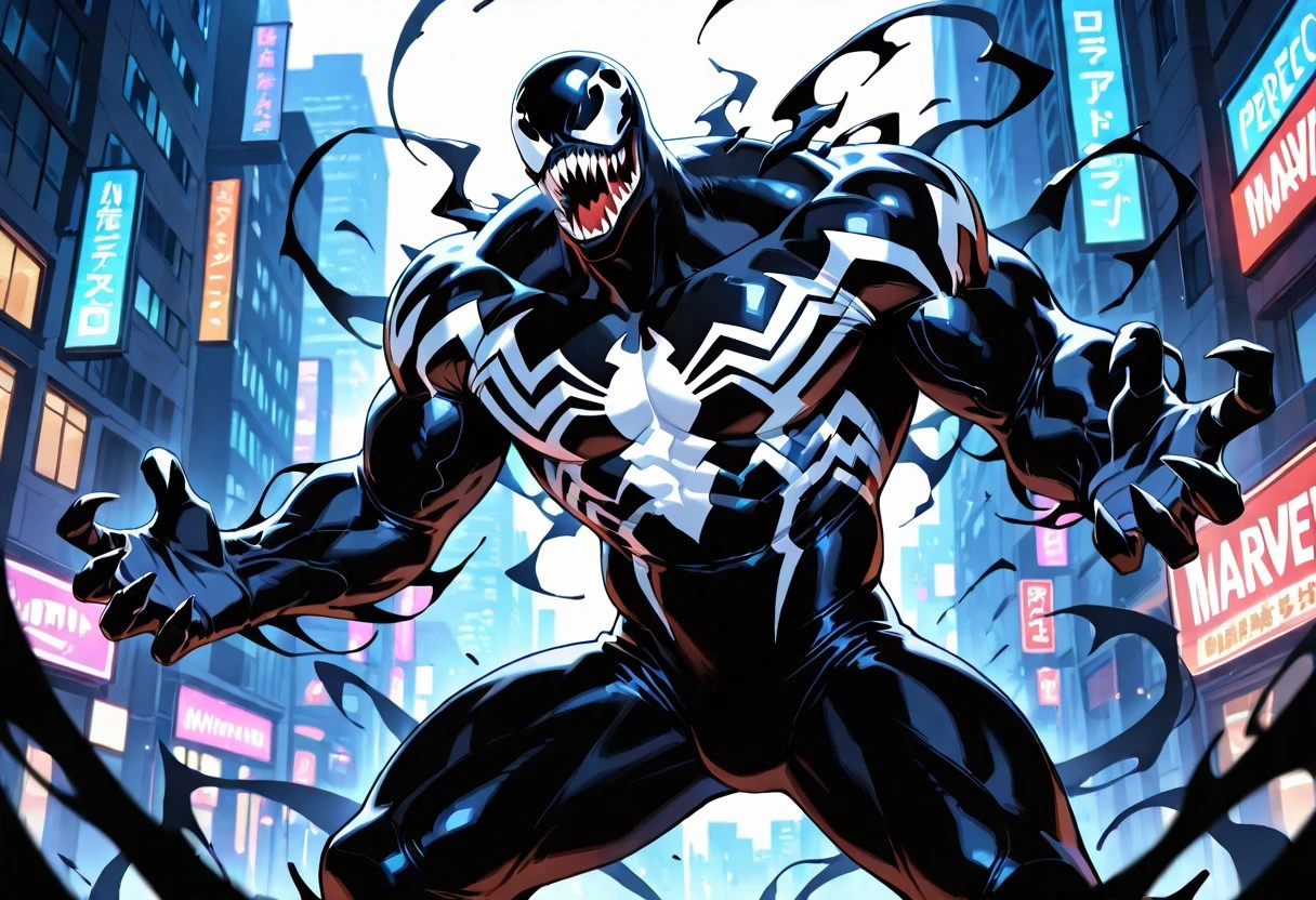 unlimited_venom/(marvel)/IL, symbiote, monsterboy, sharp teeth, mouth, spiderprint, whiteprint, bodysuit, blacksuit, 1boy, solo, muscular,