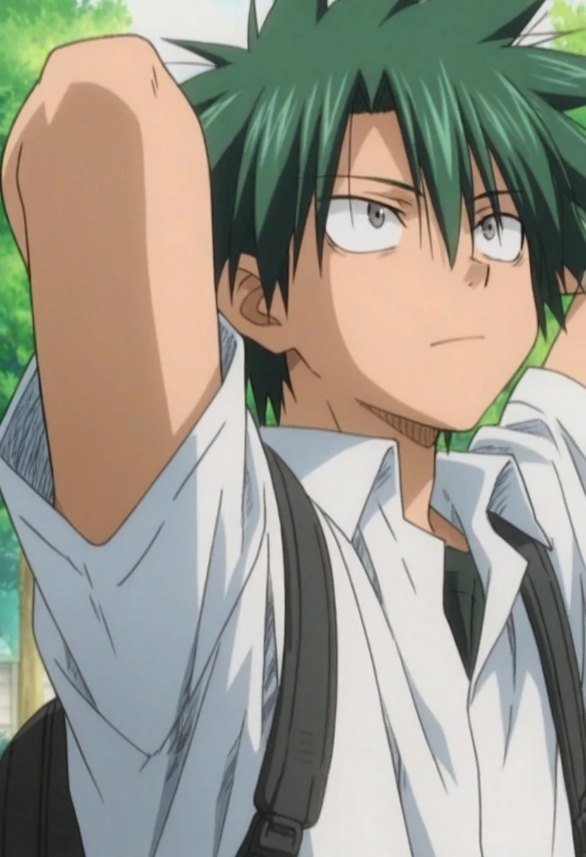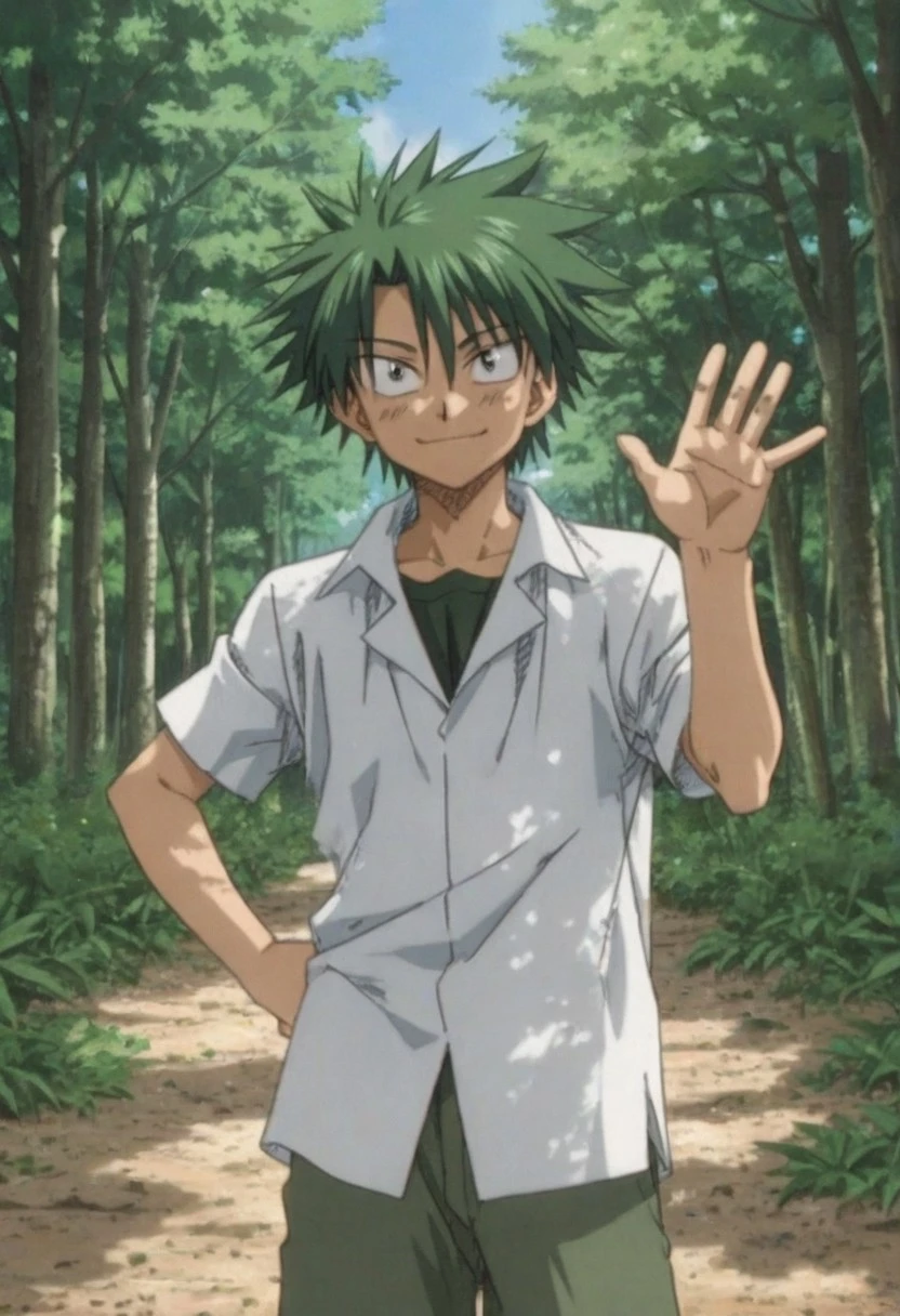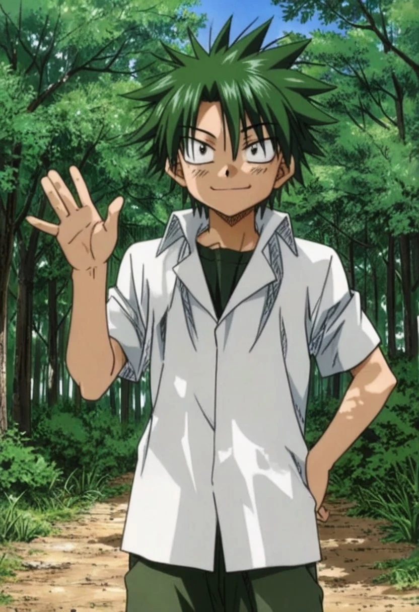 Kosuke Ueki, green hair, gray eyes, white collared shirt, short sleeves, dark green undershirt, green-gray shorts