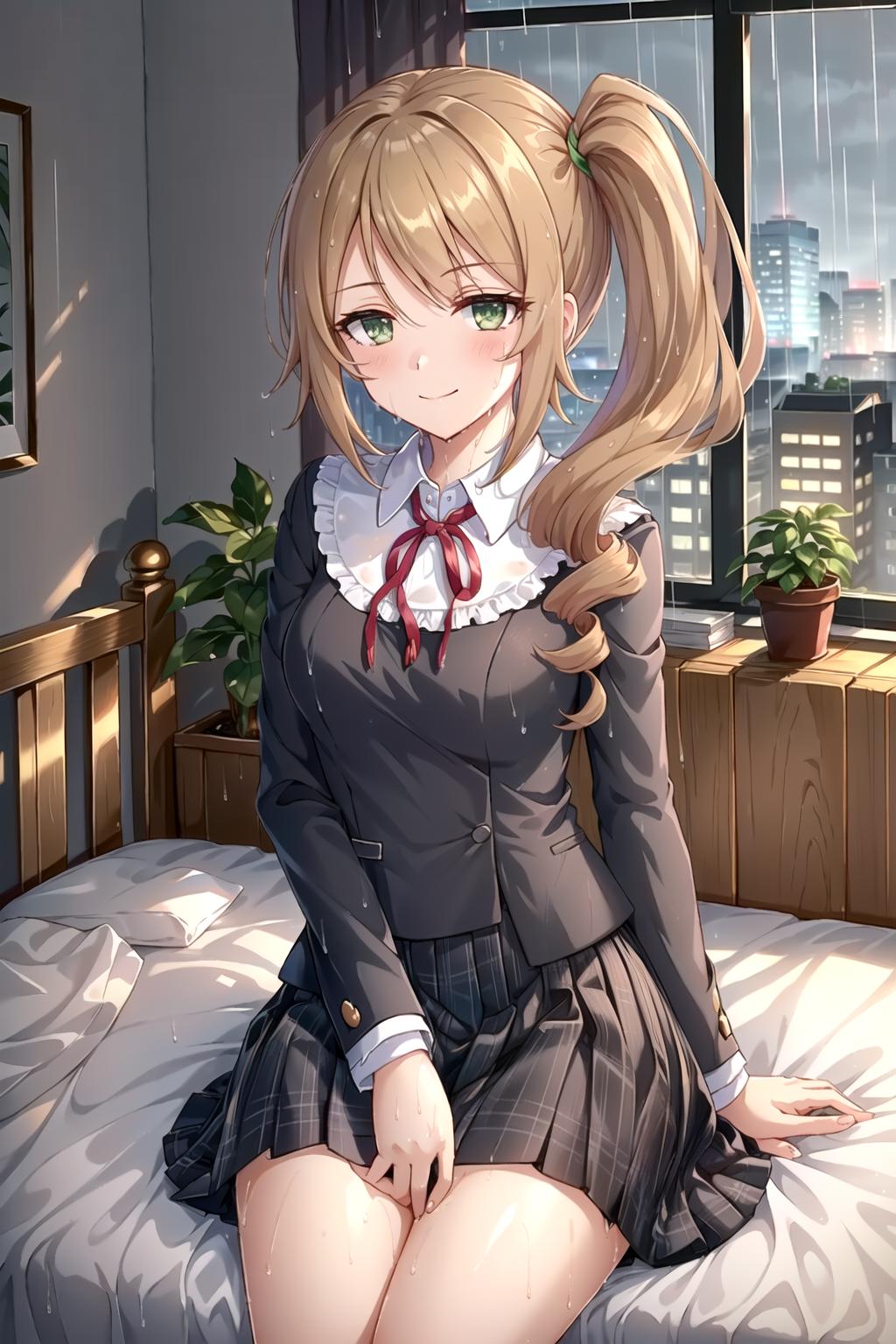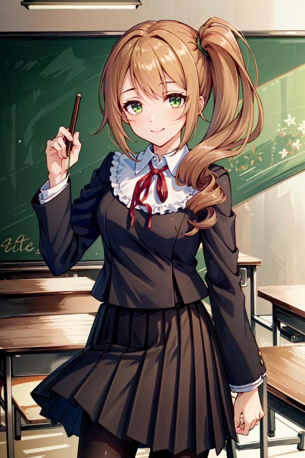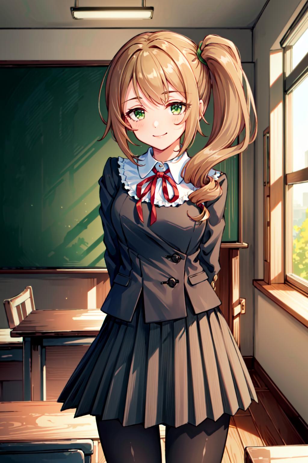 chloerealschoollong hair,bangs,brown hair,green eyes,side ponytail,skirt,ribbon,pleated skirt,black pantyhose,red ribbon,neck ribbon,pantyhoseIf the features of other costumes get mixed up, you may want to add a word of that feature to the negative prompt.