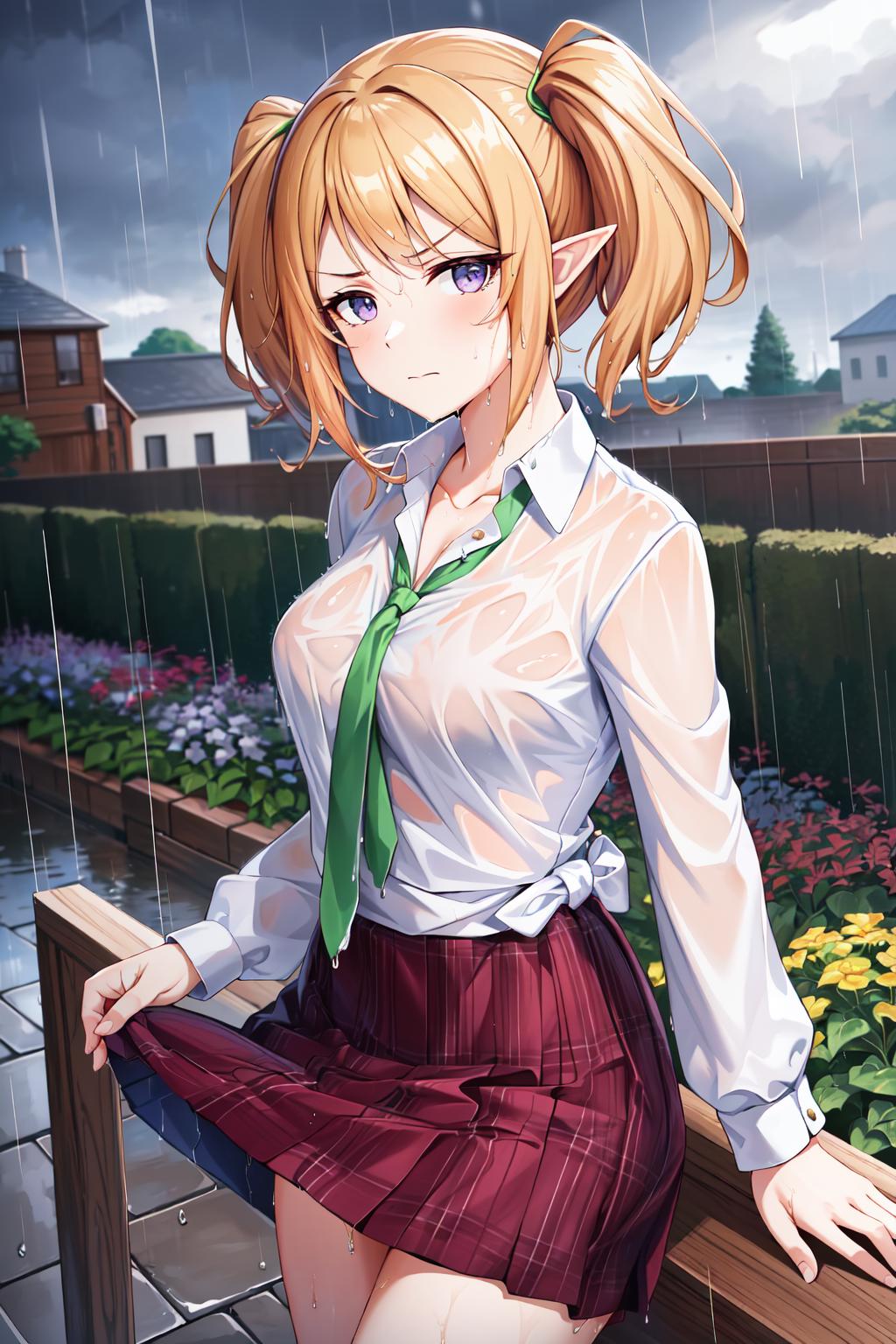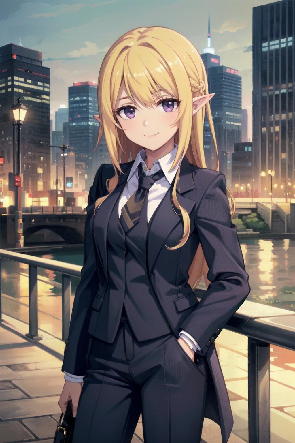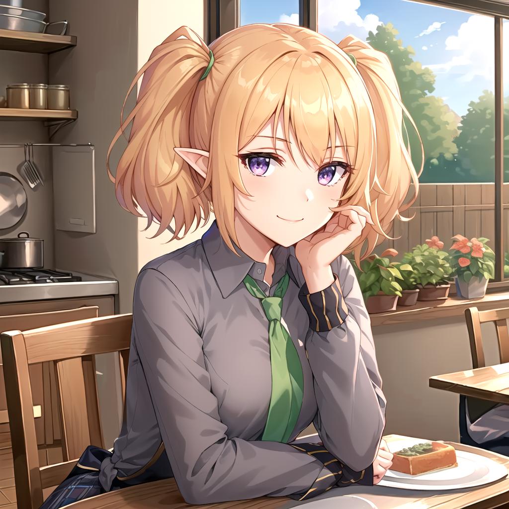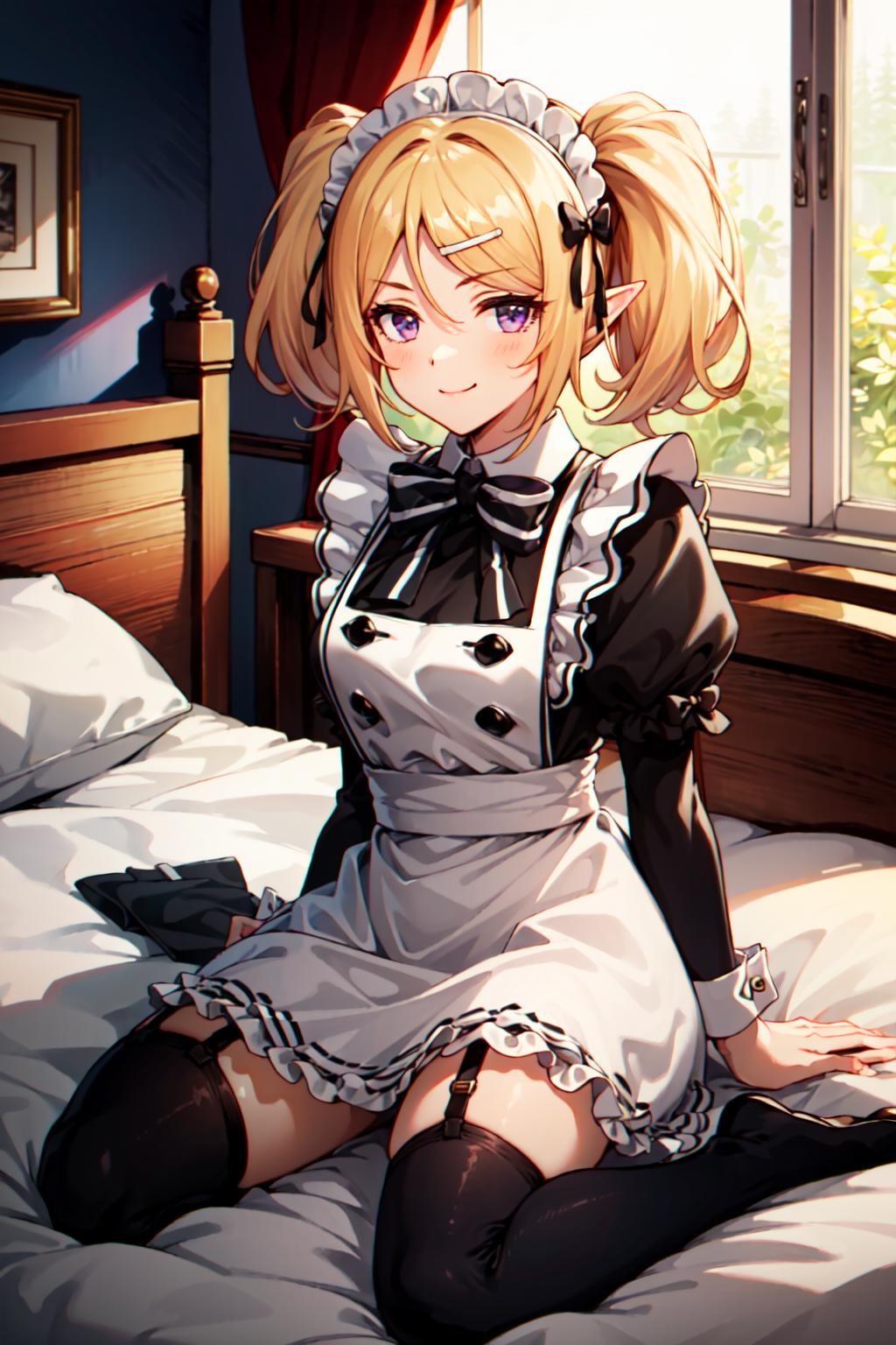 chloemaid,twintails,purple eyes,blonde hair,pointy ears,maid,maid headdress,black thighhighs,garter strapsChloe (Real World) base prompt: