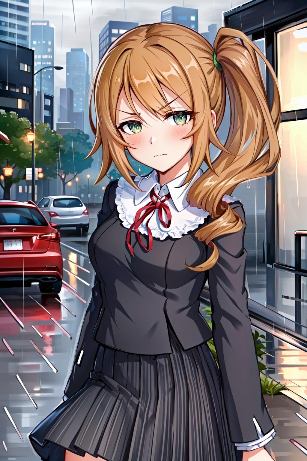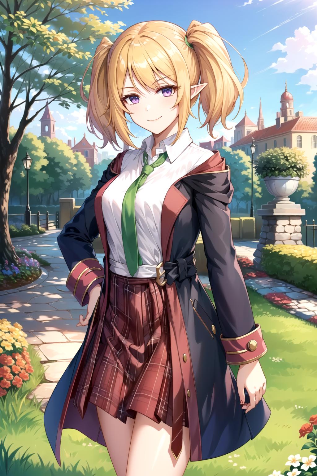 chloeschool,twintails,purple eyes,blonde hair,pointy ears,st. theresa's girls academy school uniform,pleated skirt,plaid skirt,red skirt,choker,black coat,green necktie.school uniformFor School Festival outfit: