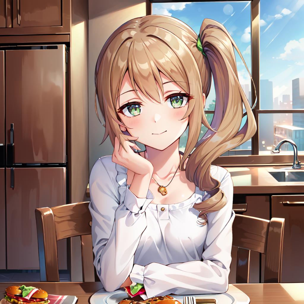 chloereal,long hair,brown hair,hair between eyes,green eyes,side ponytailFor Casual outfit: