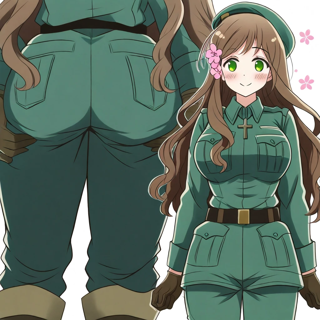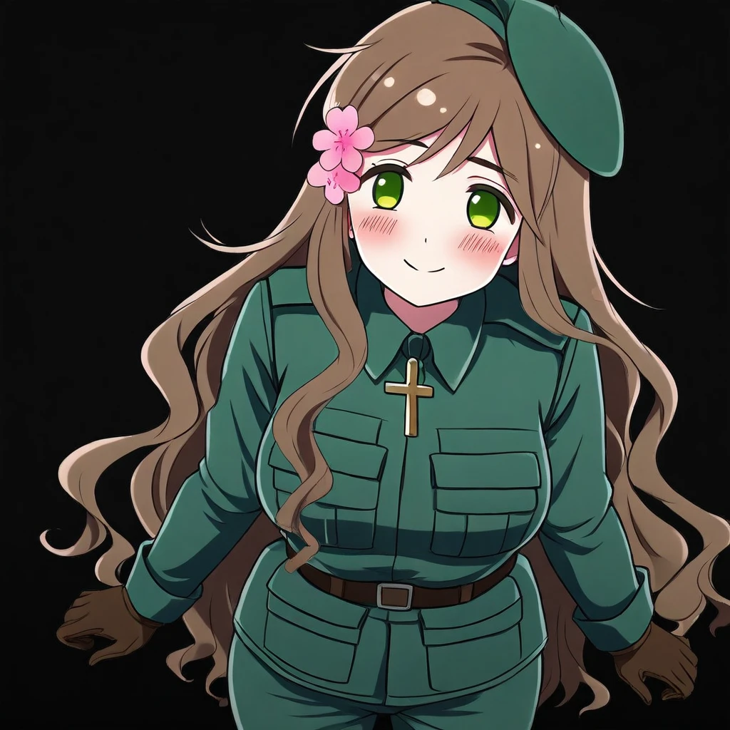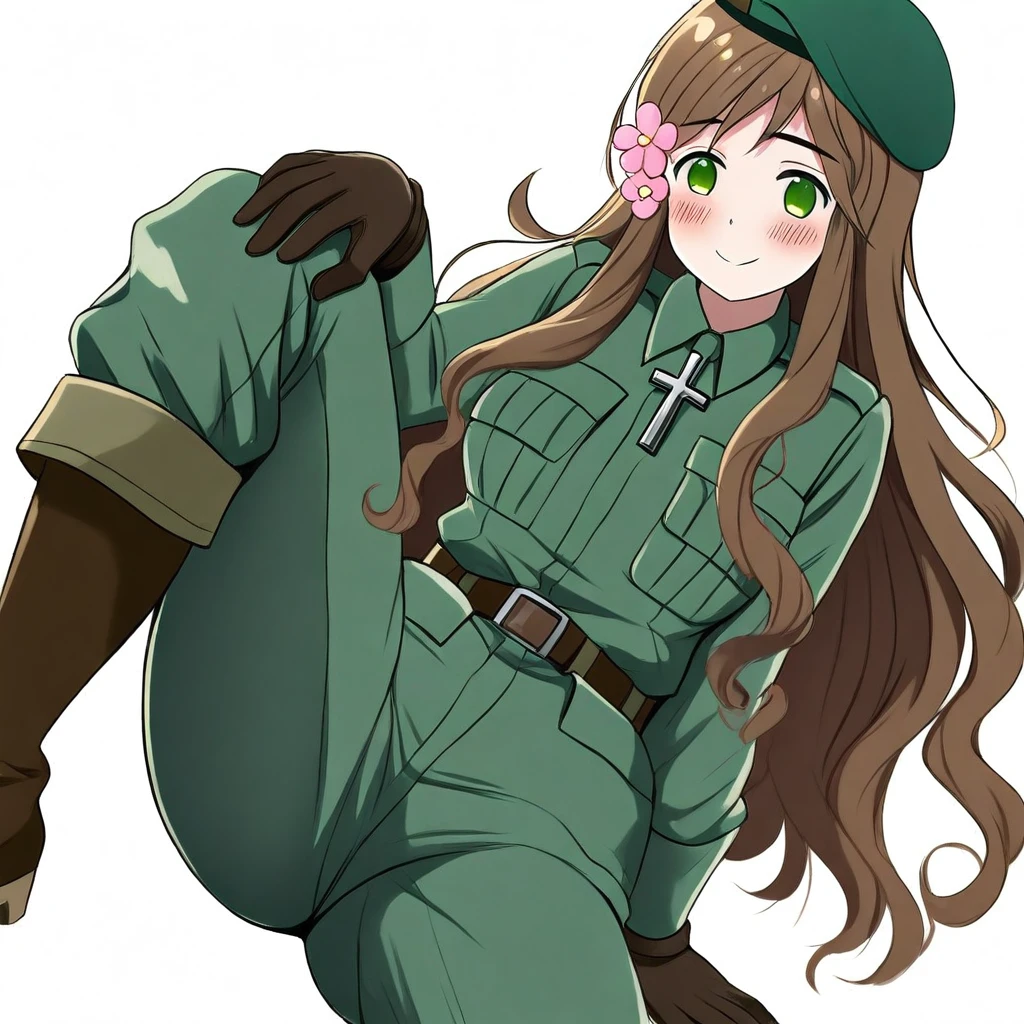 Elizabeta_Military, dark-green uniform, long-sleeves, cross (pendant), belt, dark-green pants, brown knee-boots, gloves, dark-green beret,