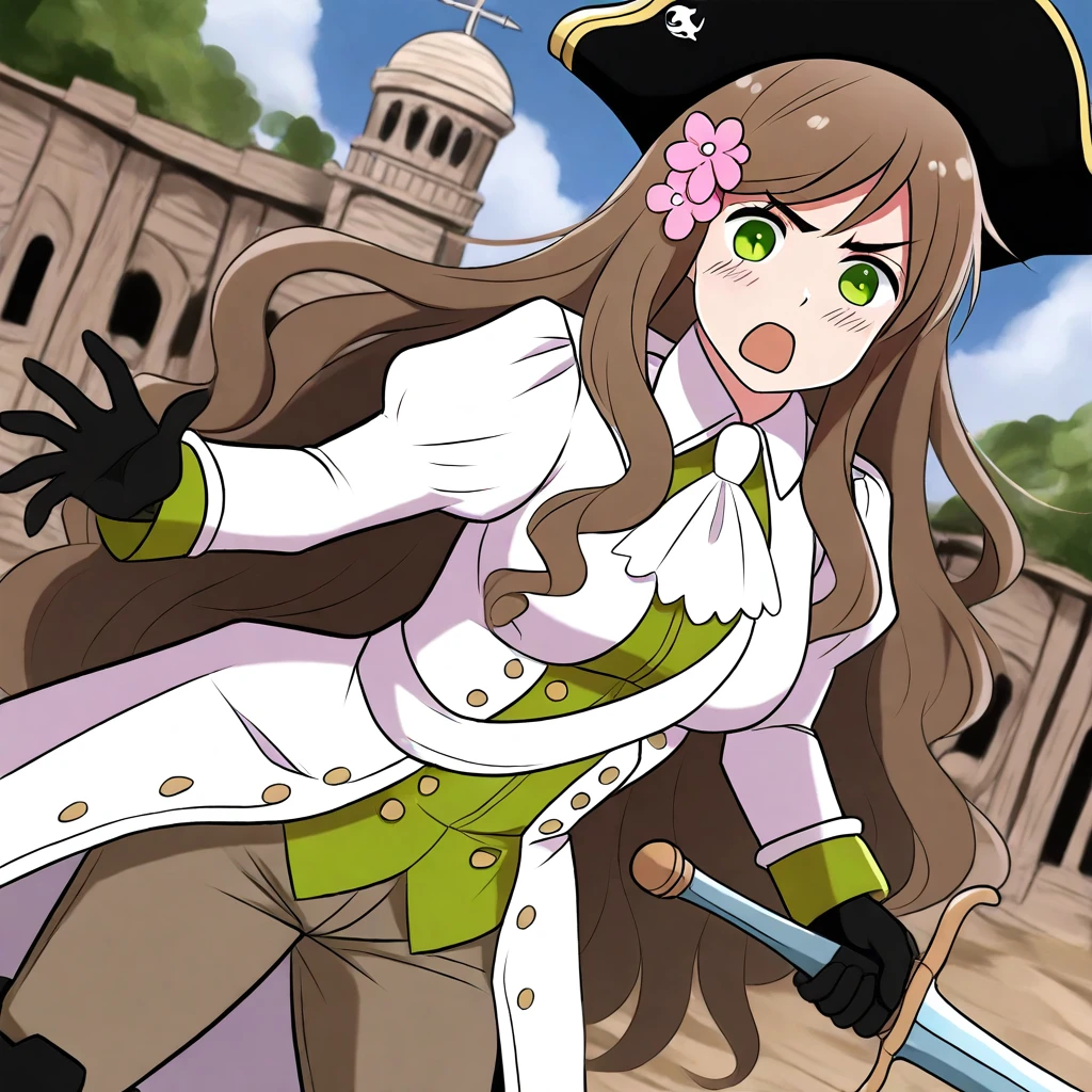 Elizabeta_WoAS, white long-coat, long-sleeves, Juliet sleeves, green undershirt, white ascot, buttons, white shoulder-sash, brown pants, black knee-boots, gloves, black pirate hat,