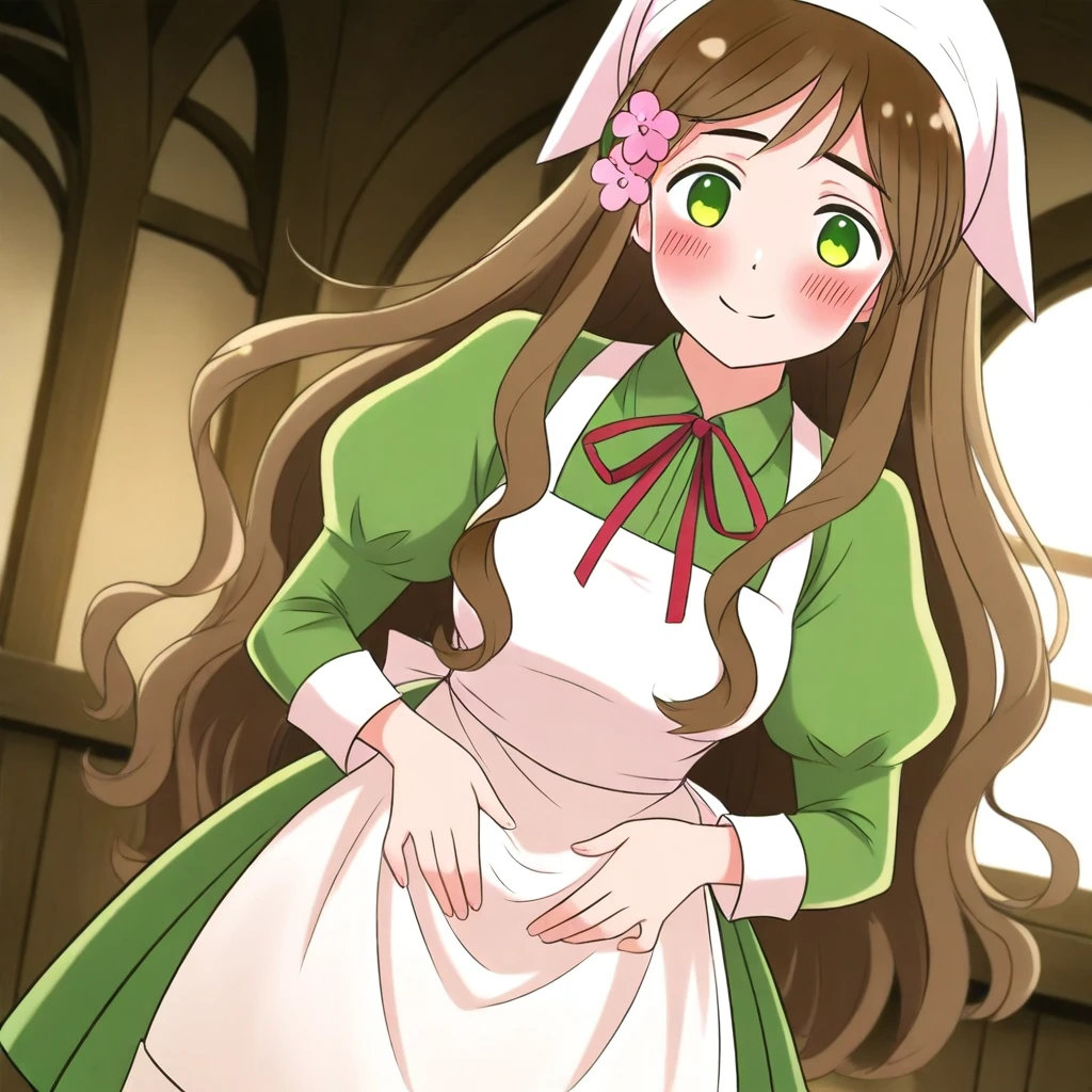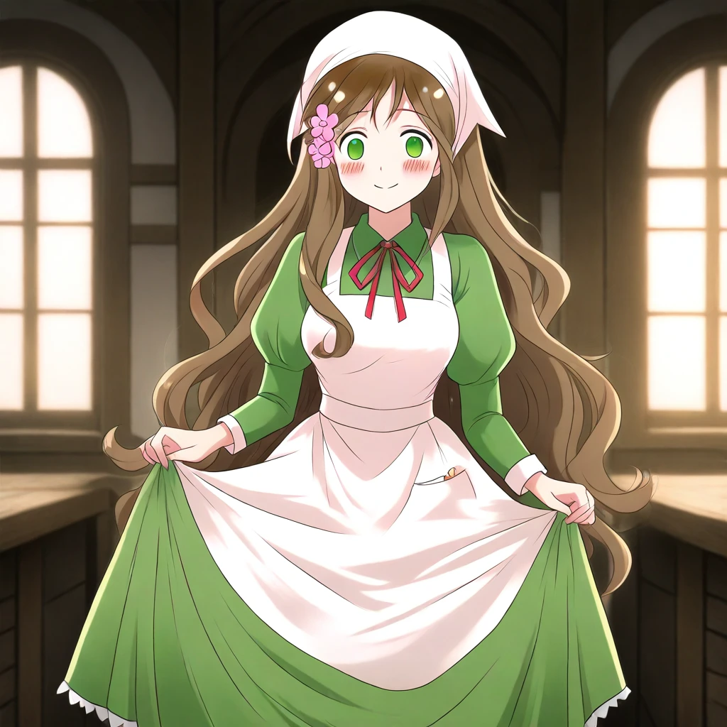 Elizabeta_Maid, green undershirt, Juliet sleeves, long-sleeves, red neck-ribbon, white apron, green skirt, white head-scarf,