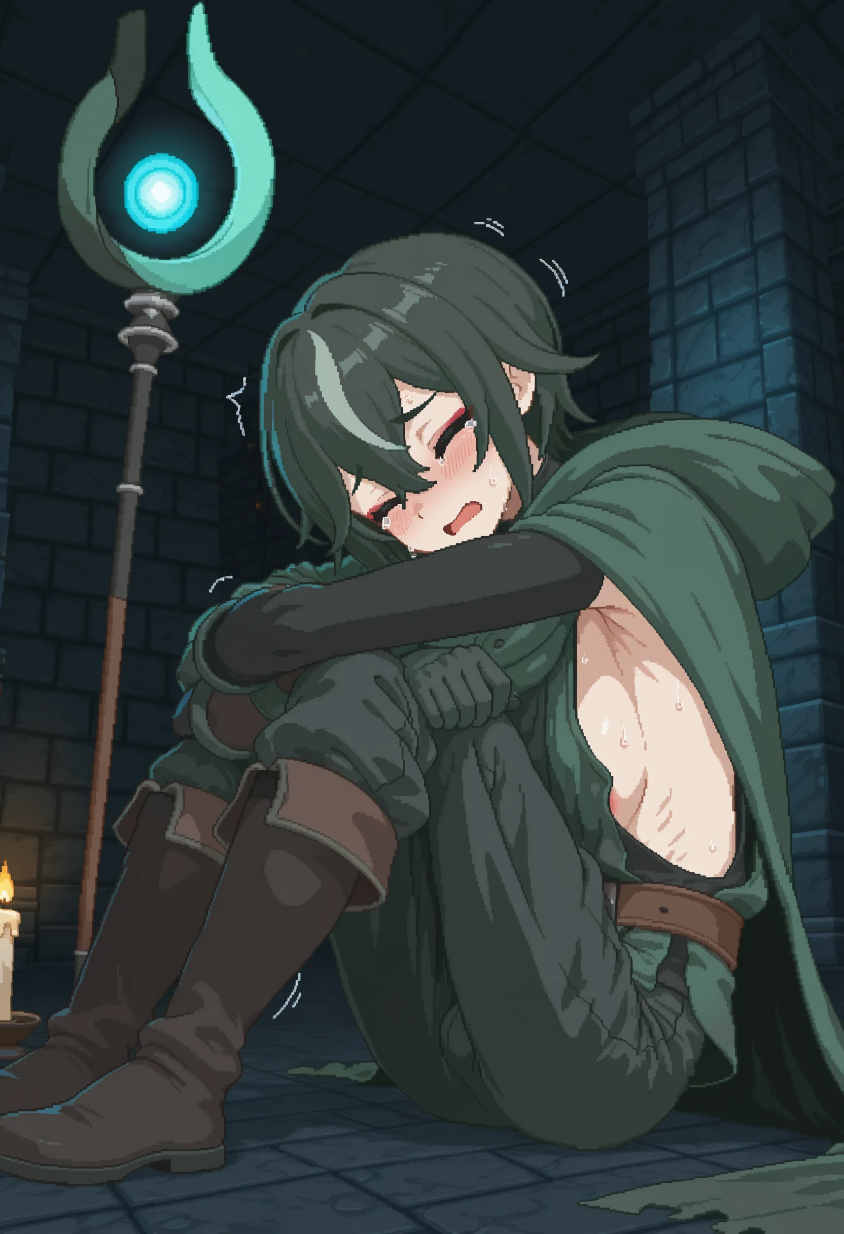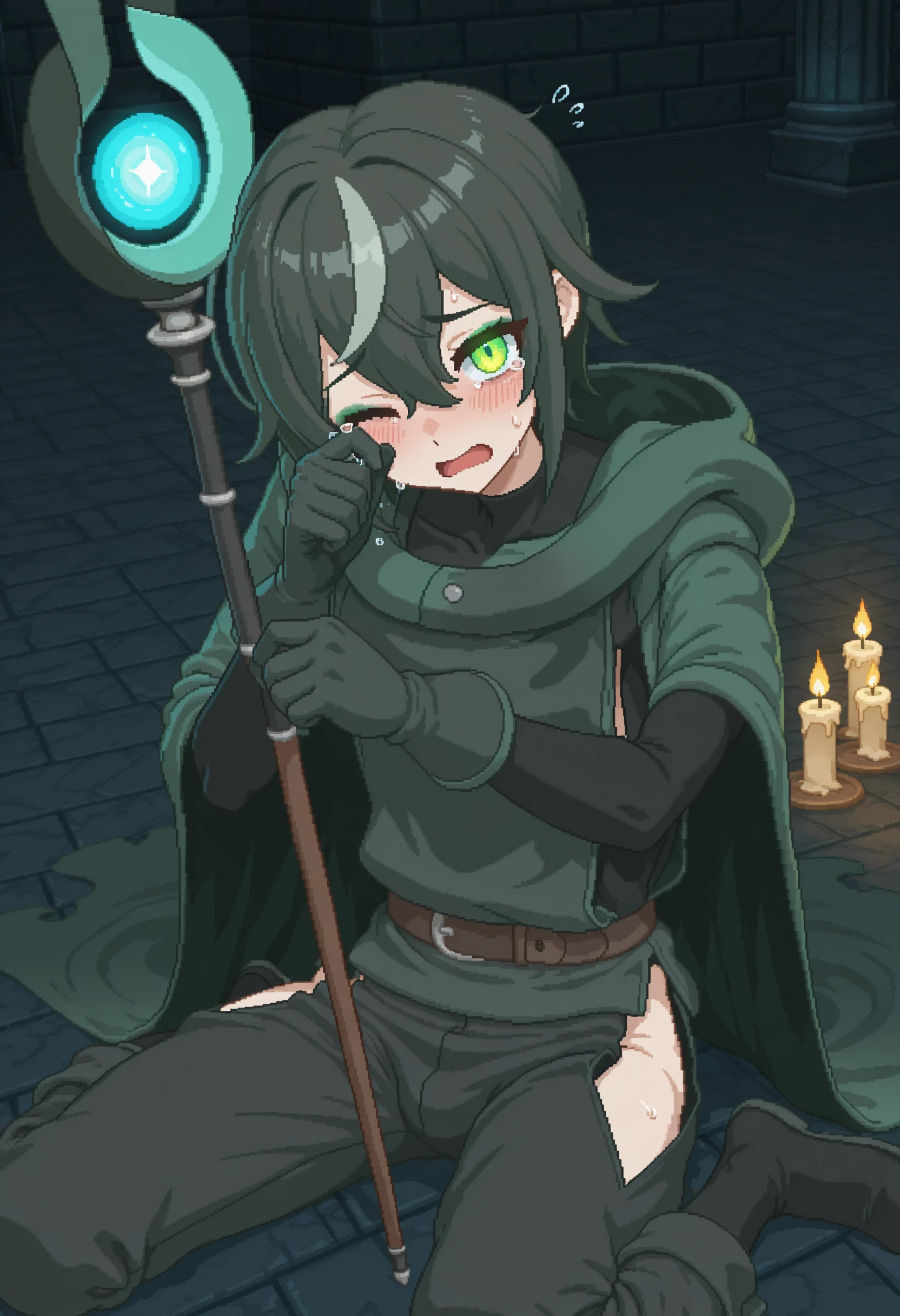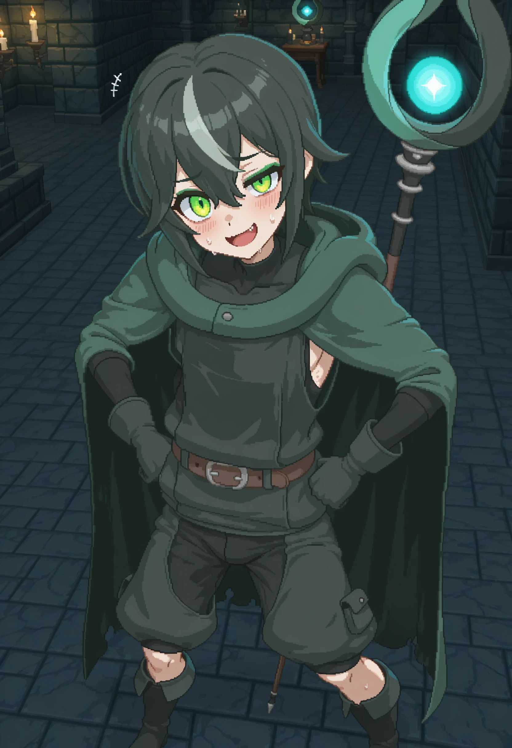 main trigger: vic_nakara,1boy,streaked hair, hair between eyes, eyeshadow,green eyes,bare knee,