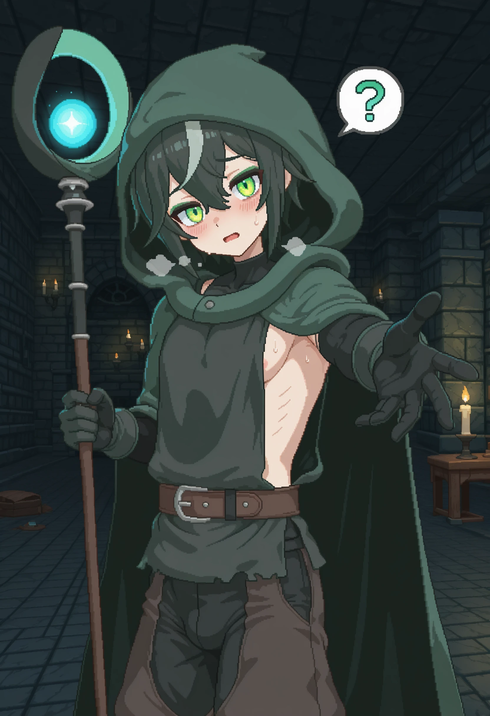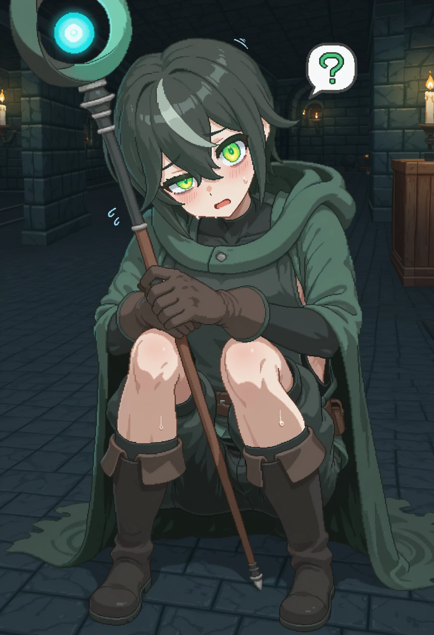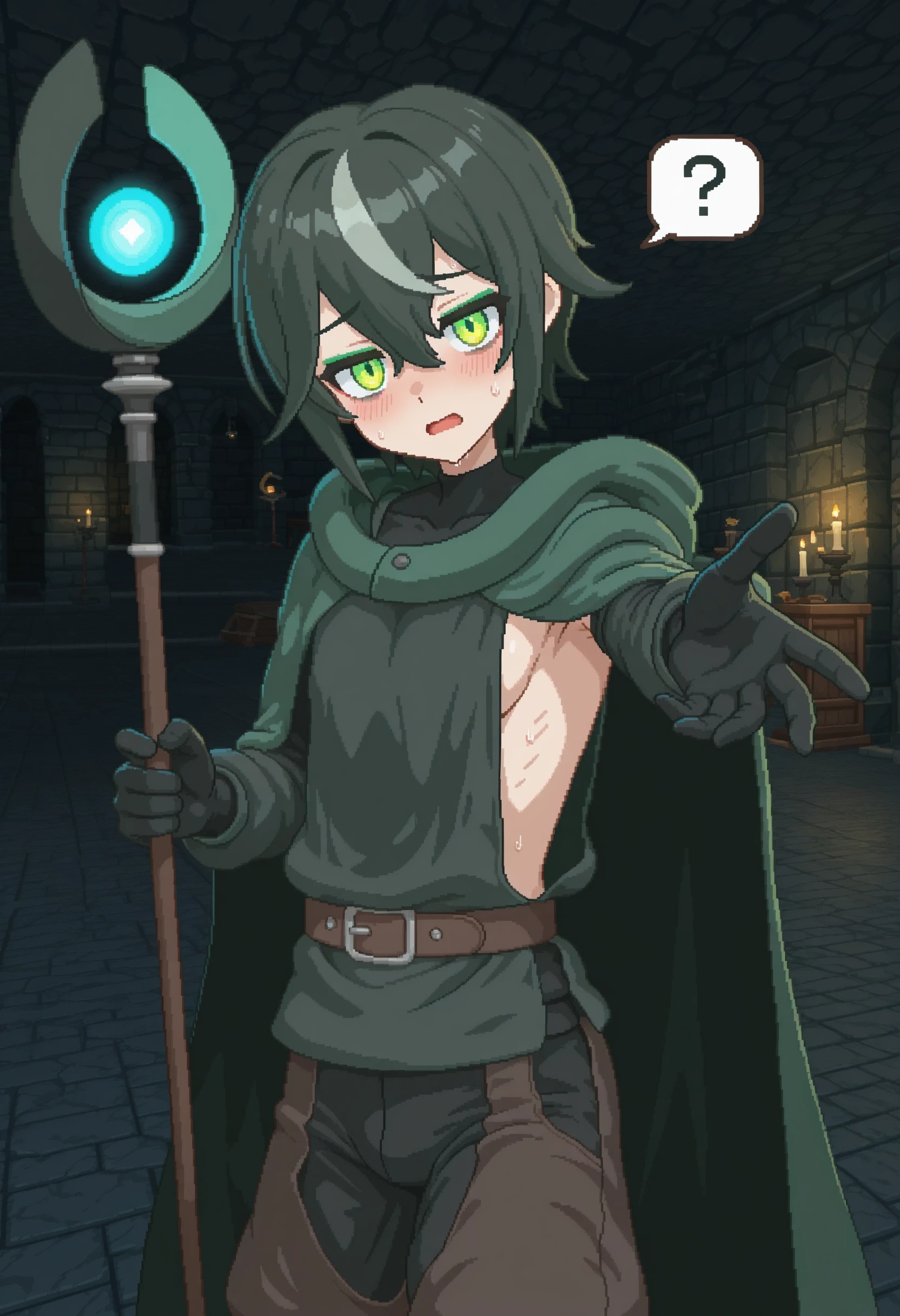 main trigger: vic_nakara,1boy,streaked hair, hair between eyes, eyeshadow,green eyes,bare knee,