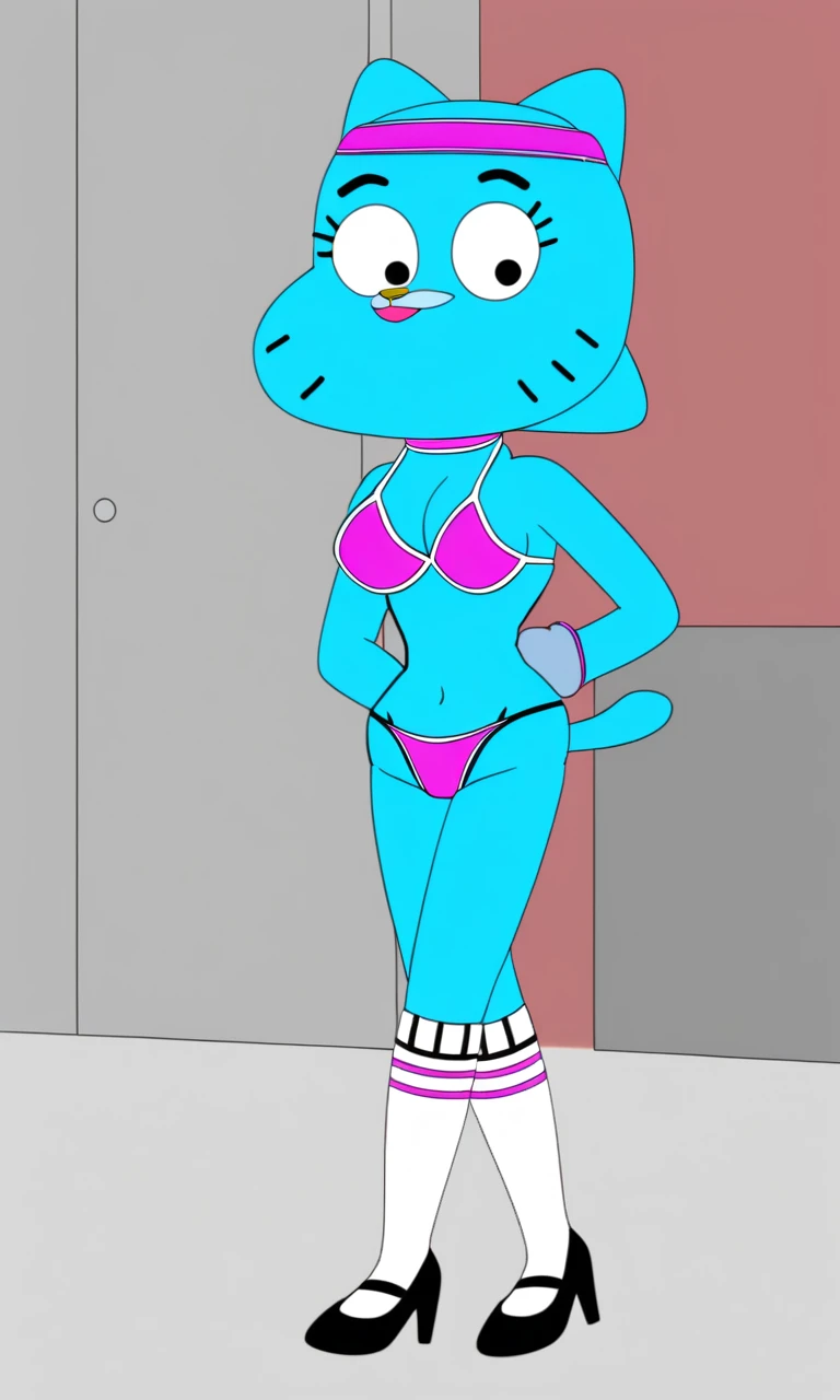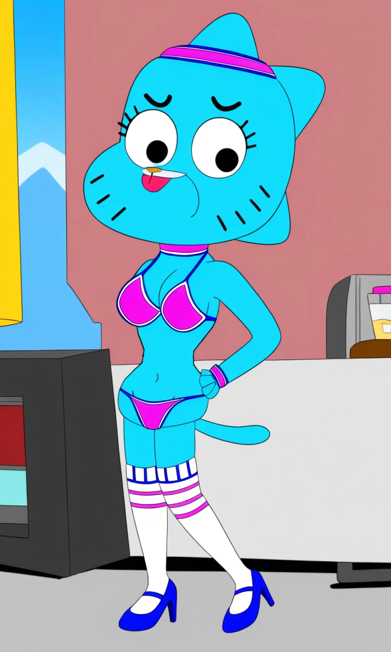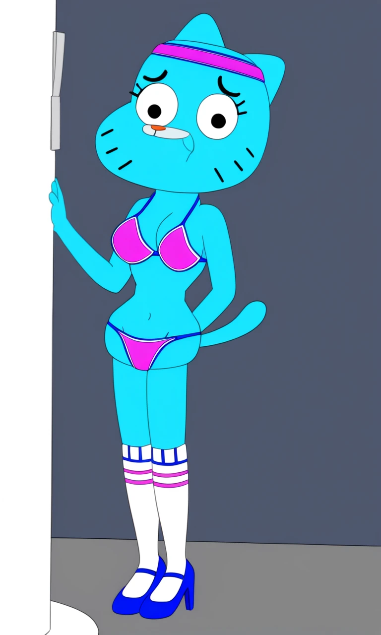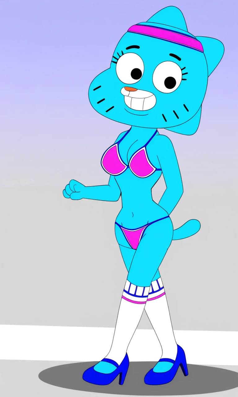 thecanadiantoonystylesexynicolewatterson, Nicole watterson, 1girl, solo, sexy, bikini, heels, socks, adult, cat tail, light blue fur, upper lip is a lighter shade of blue, black eyes, pink nose, visible eyelashes,