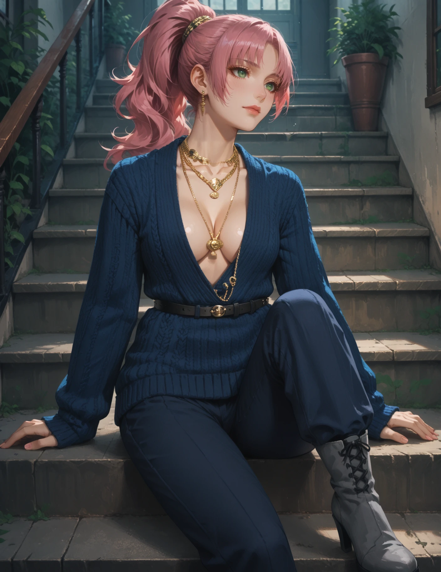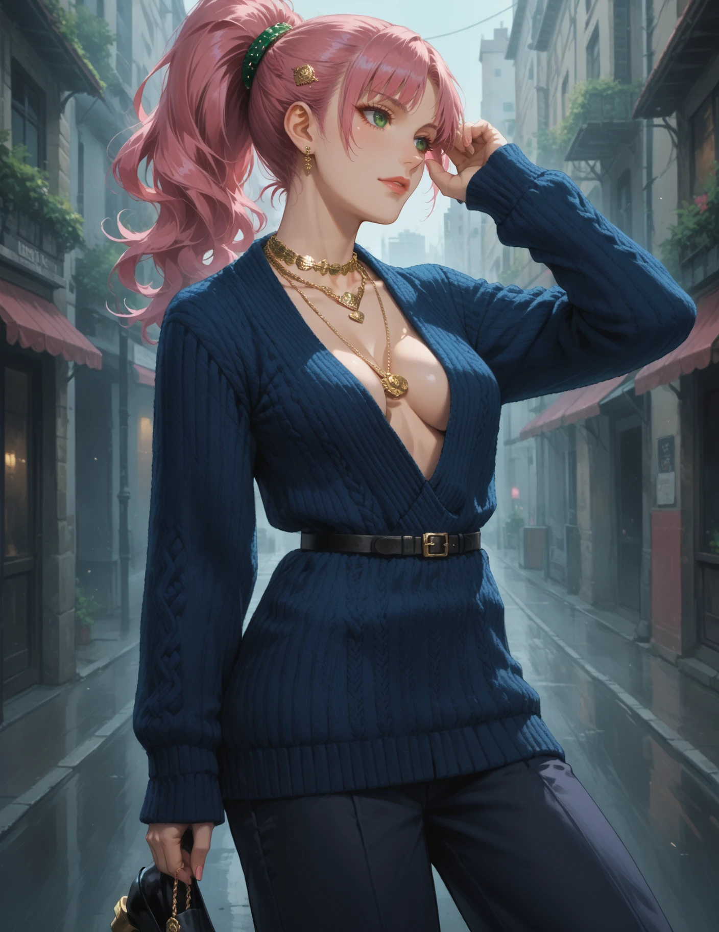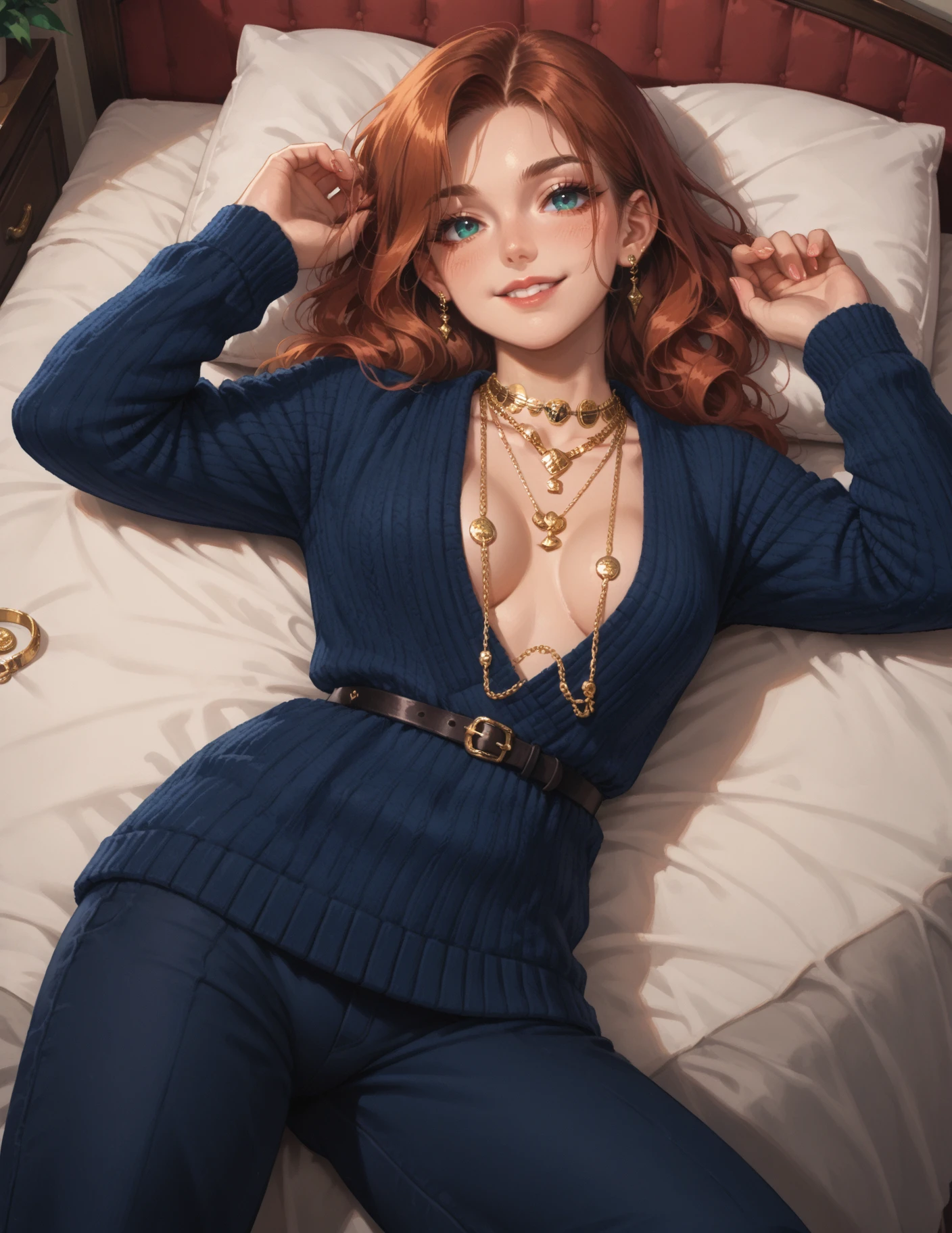 knit, blue sweater, gold jewelry, jewelry, cleavage, belt, pants, necklace, no bra, plunging necklinedifferent colors of outfit work well by replacing 'blue sweater' to '(colors) sweater' but it may change a bit the the shapes