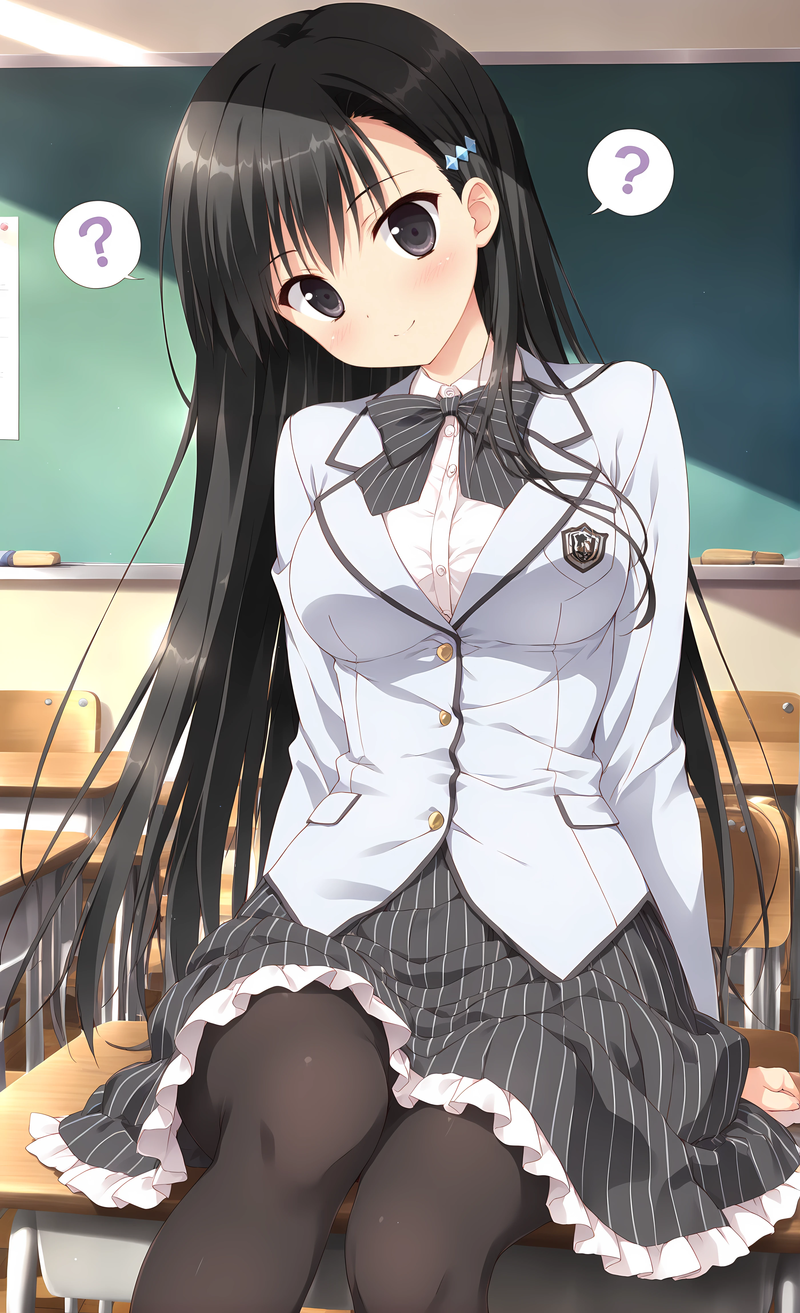 School uniform: School uniform,black pantyhose,pantyhose,skirt,striped skirt,bow,striped,jacket,blazer,bowtie,black bowtie,black bow,