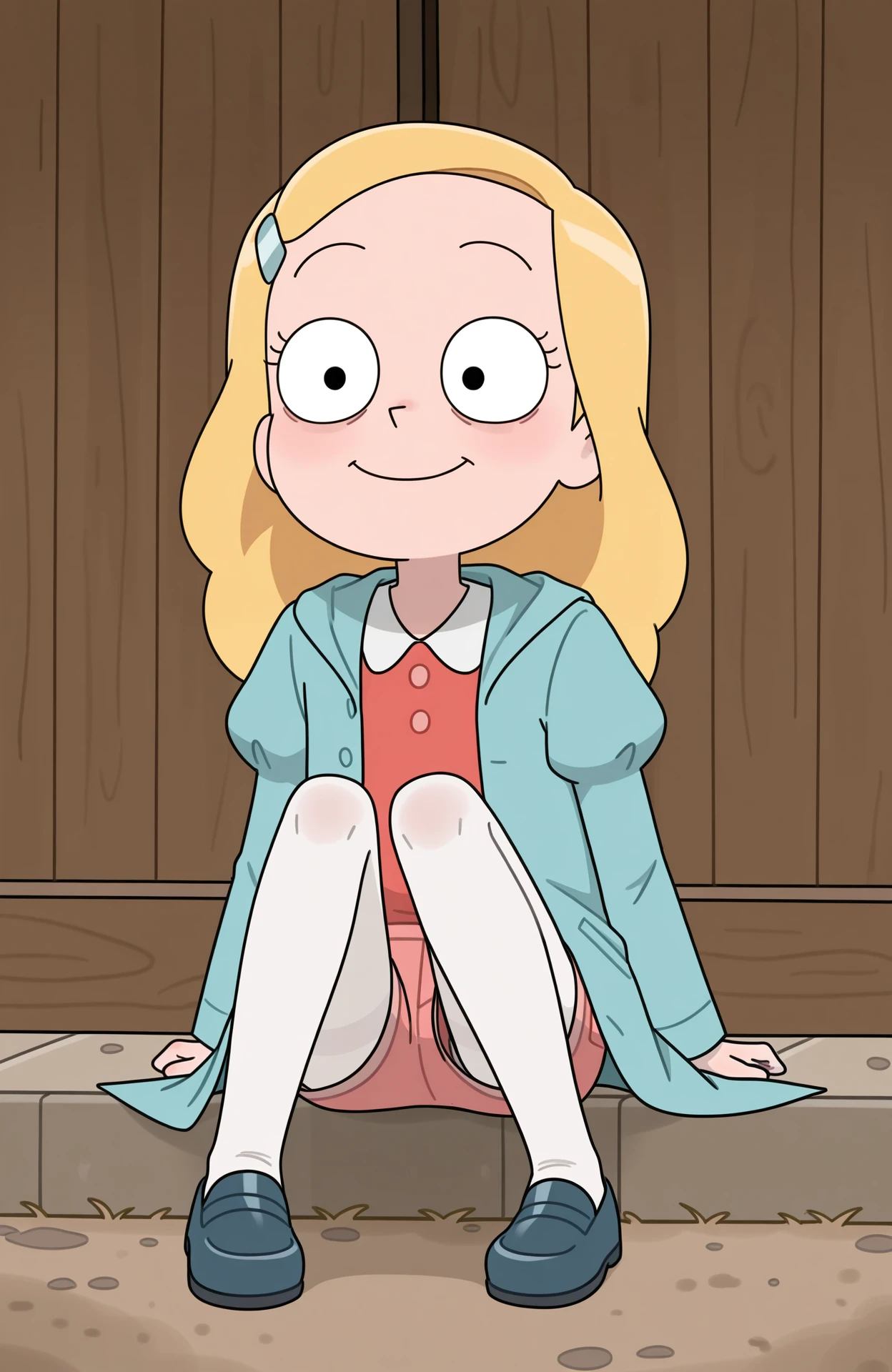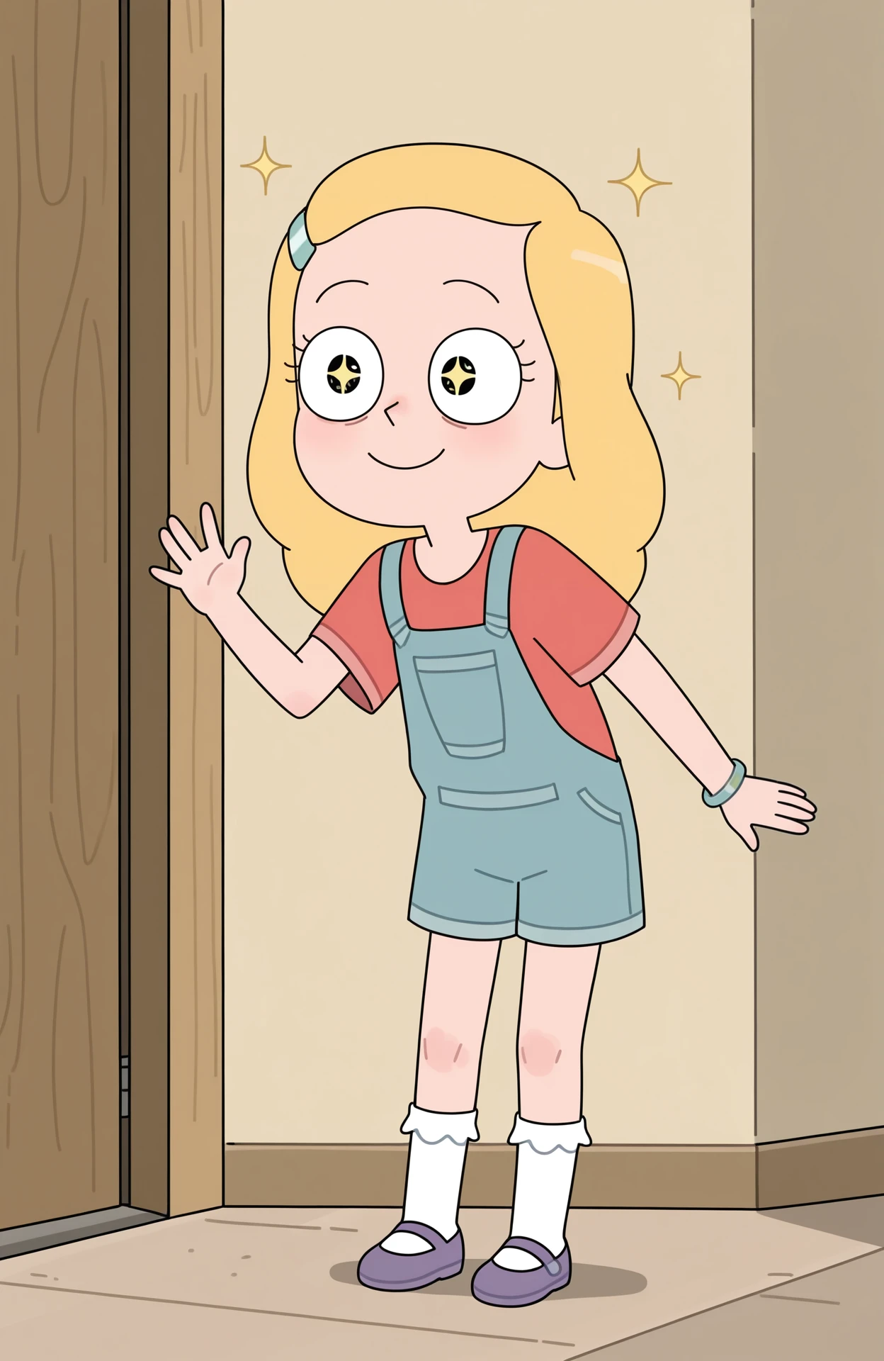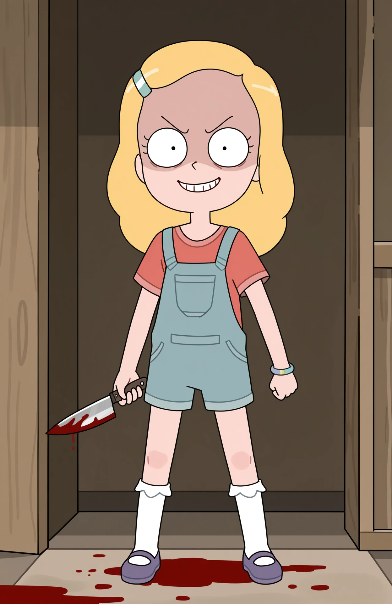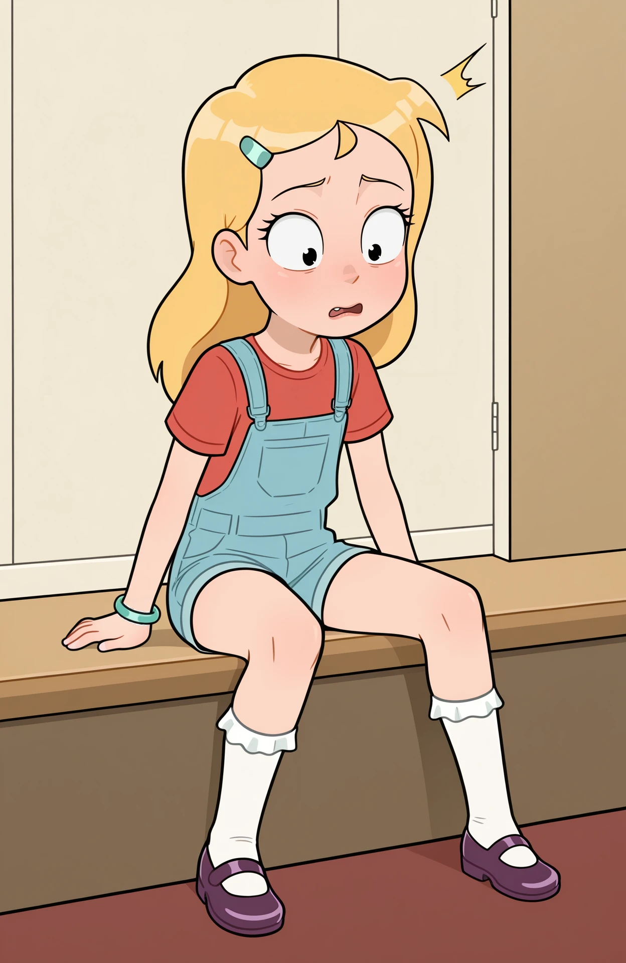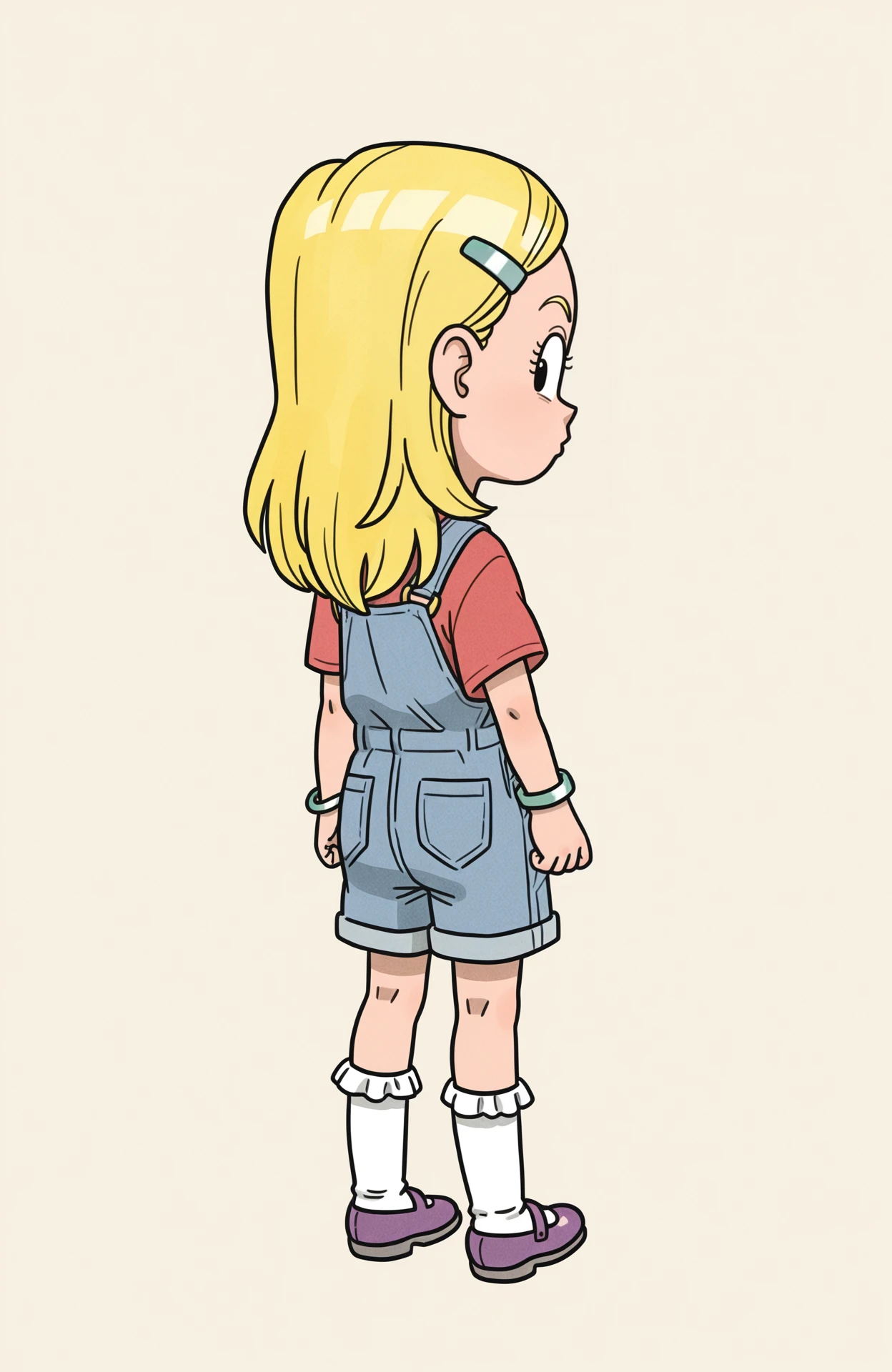 hairclip, blue overalls, overall shorts, kneesocks, frilled socks, white socks, bracelet, red shirt, short sleeves, purple footwear, mary janes