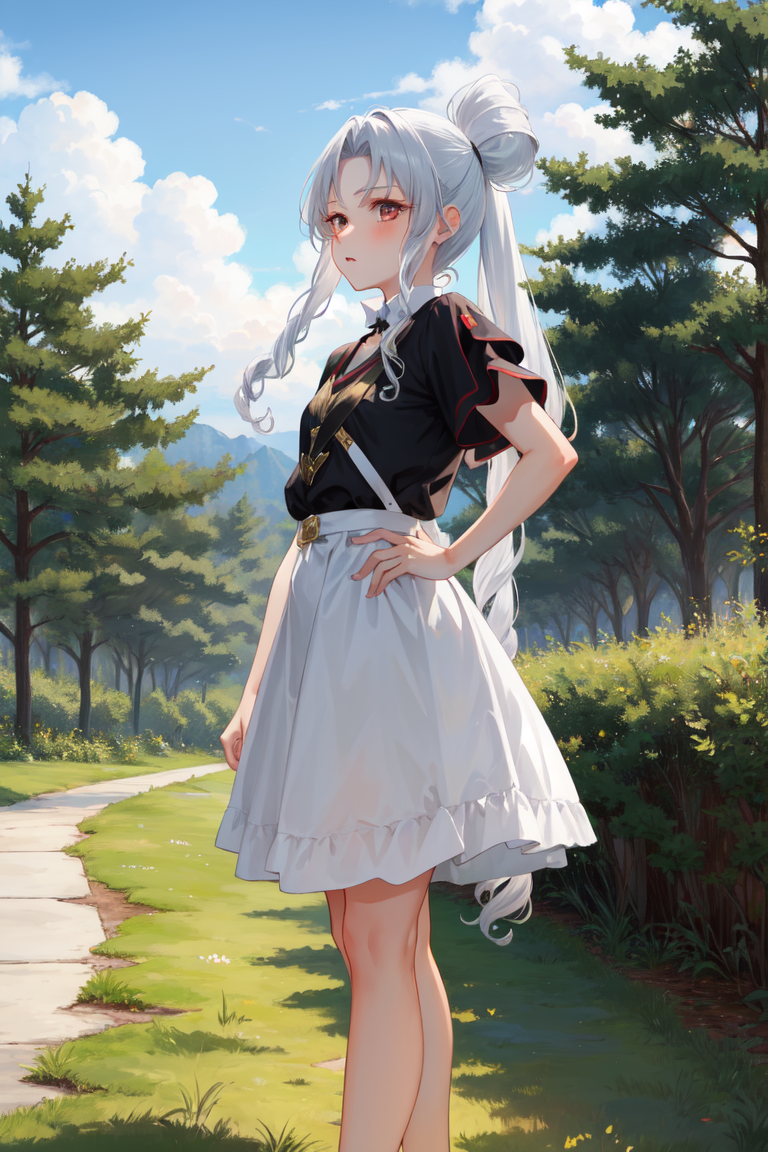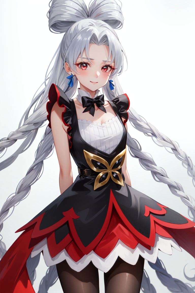 "Twilight, white hair, long hair, quad tails, black dress, red pantyhose, TwilightBelt, skirt, bow"