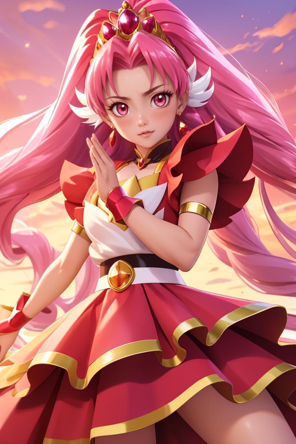 "Akagi Towa, long hair, pink hair, parted bangs, red dress, magical girl, tiara, red sleeves, detached sleeves, skirt, earrings"