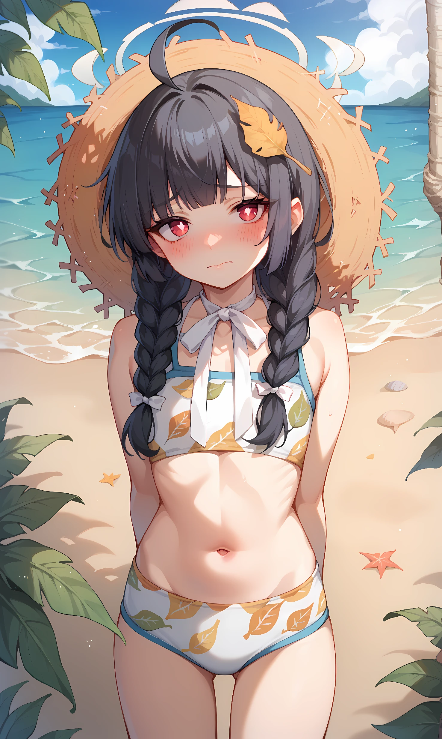 miyu, red eyes, black hair, long hair, blunt bangs, ahoge, leaf on head, fake animal ears, halo, white pupils