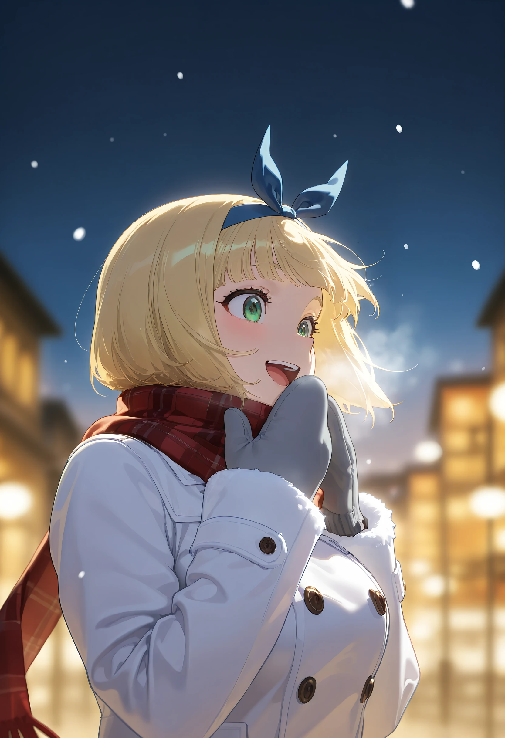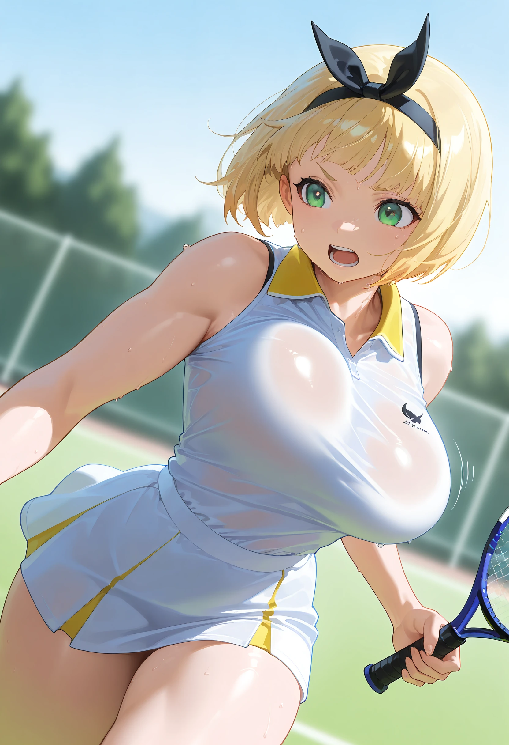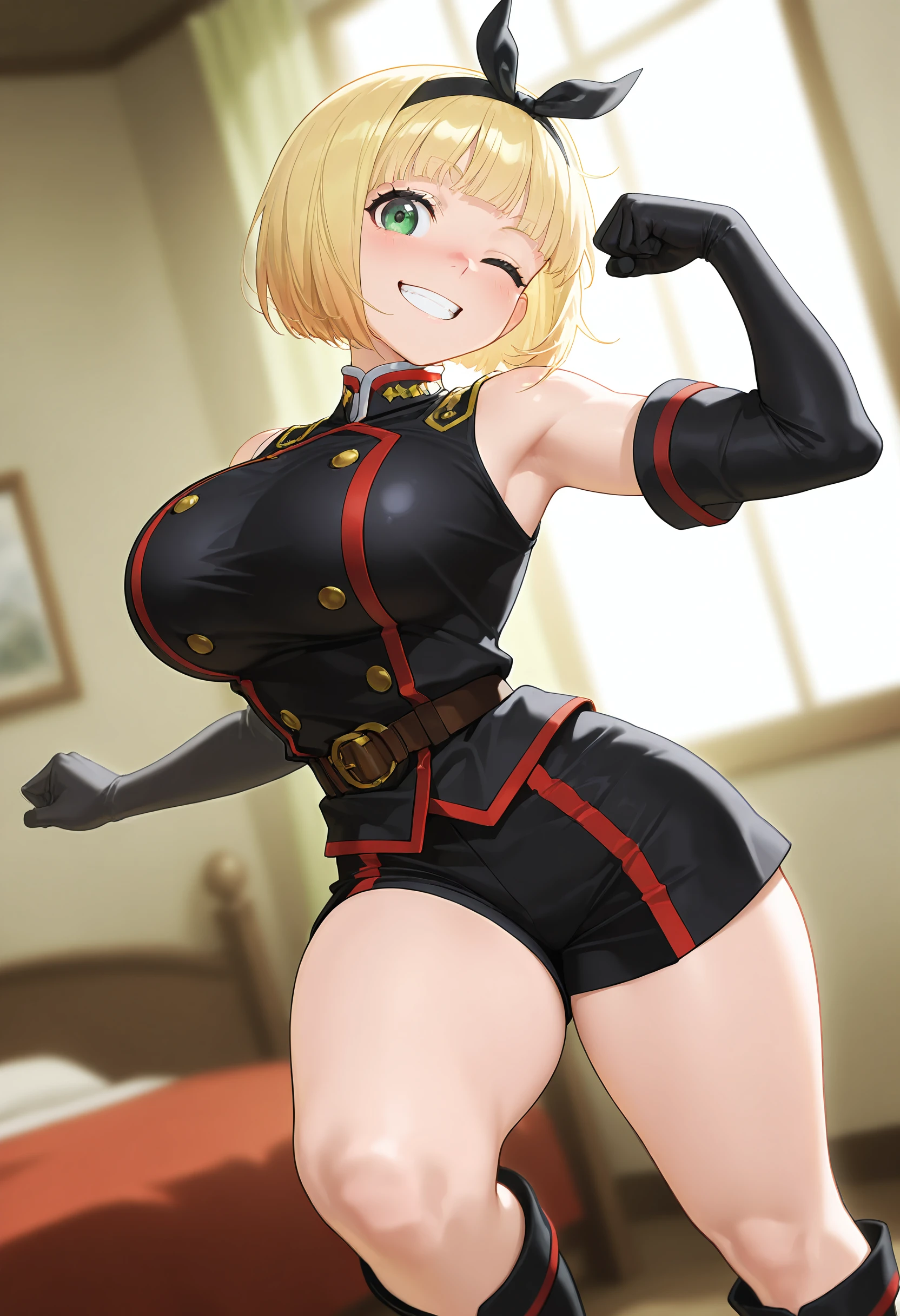 Tags for her look: 1girl, solo, large breasts, short hair, blonde hair, green eyes, hair ribbon, blue hairband, bow hairband, bob cut,