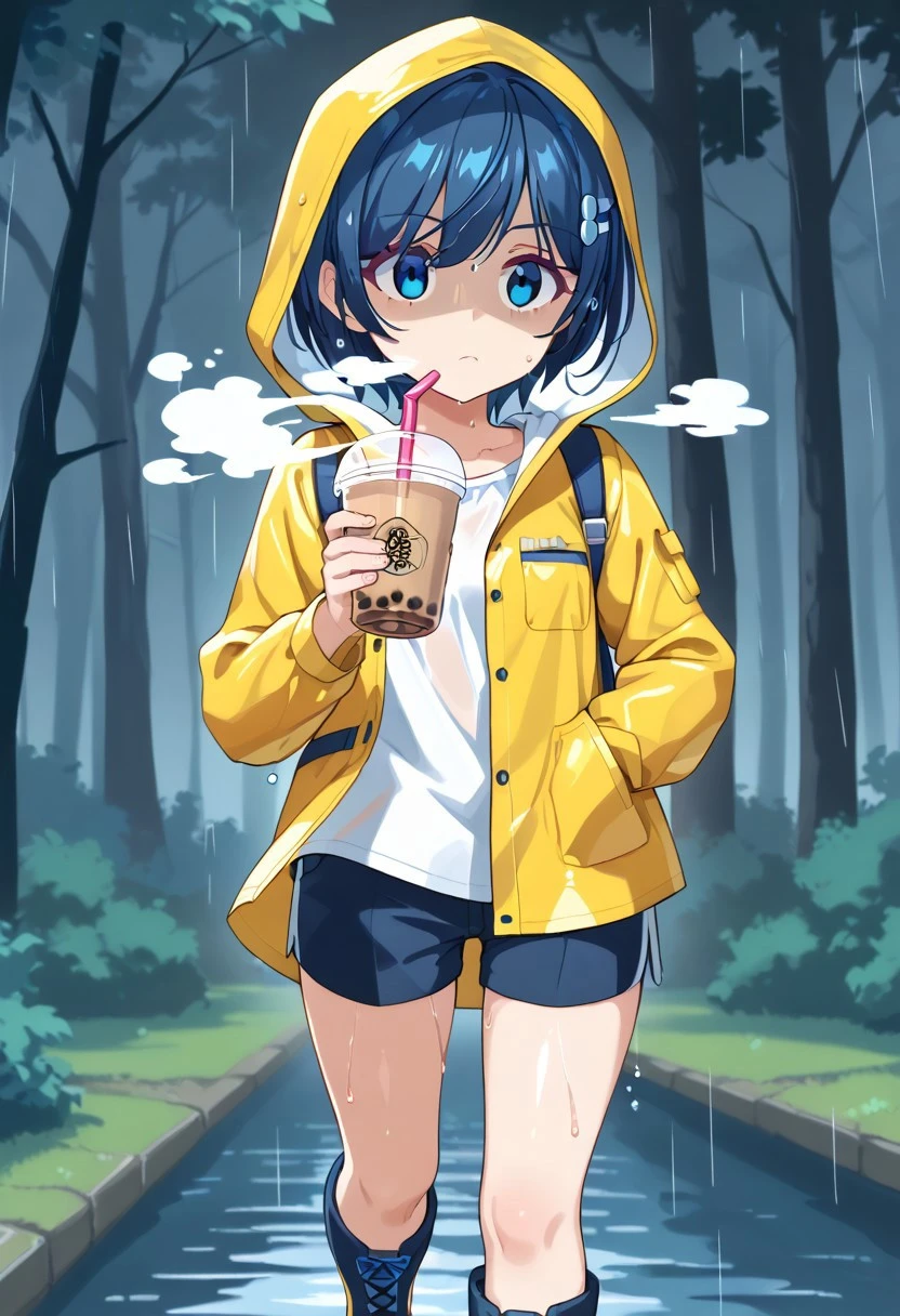 yellow raincoat, hood, long shirt, white shirt, short pants, boots,