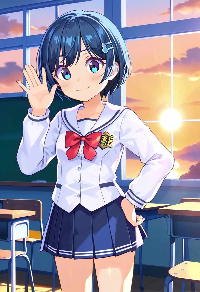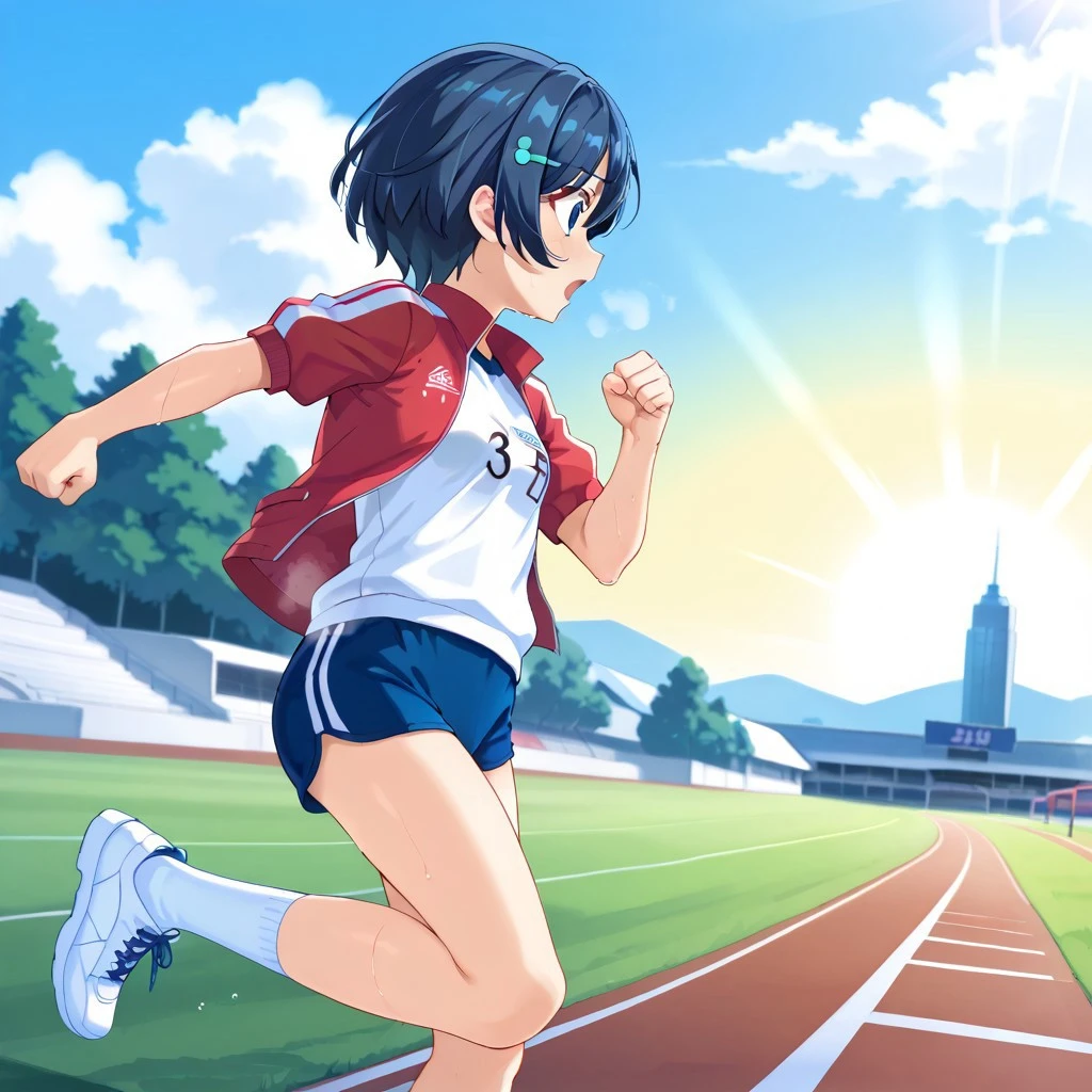 <lora:tomonaga_kaori_SDXL_v1:1>, 1girl, tomonaga_kaorin,blue hair,short hair,blue eyes,hair clip, small breasts,