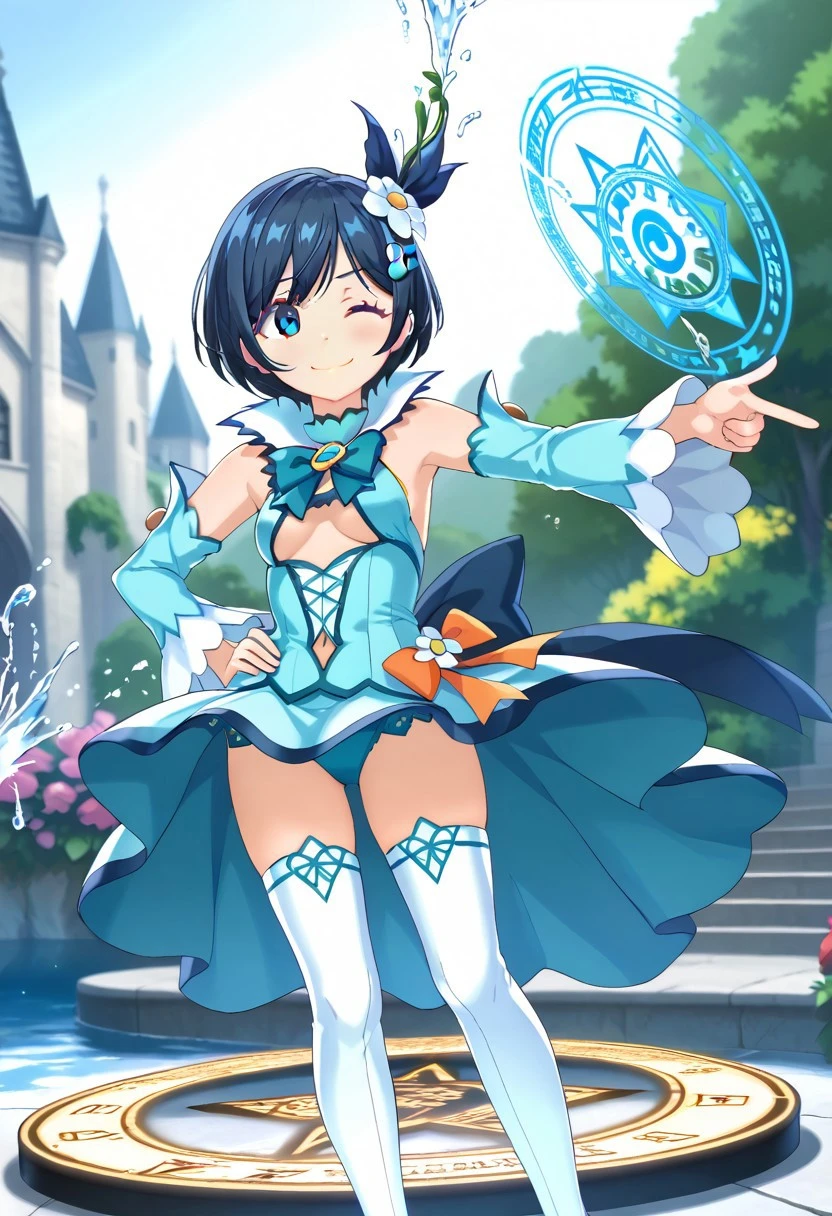magica2020, hair flower, hairclip, aqua dress, blue bowtie, brooch, clothing cutout, underboob, navel, detached sleeves, long sleeves, white thighhighs, thigh boots, high heels