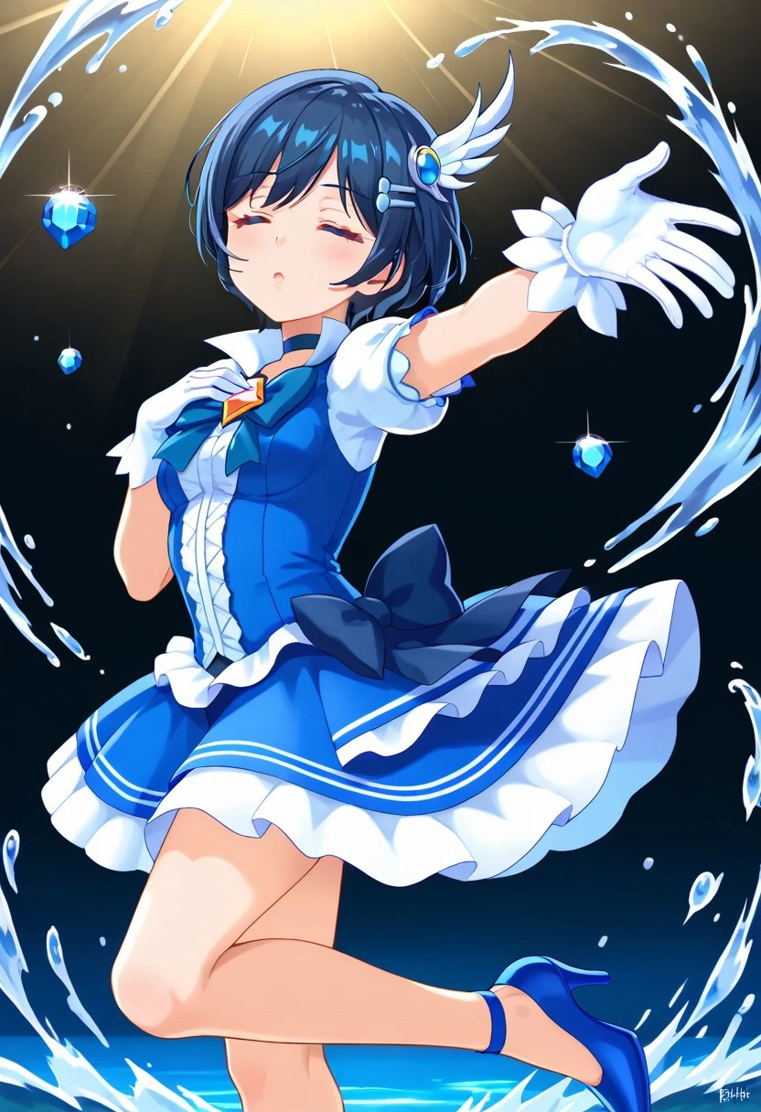 magica2019, wing hair ornament, hairclip, choker, blue dress, blue bowtie, gem, short sleeves, white gloves, plated skirt, frills, blue skirt, blue footwear, high heels,