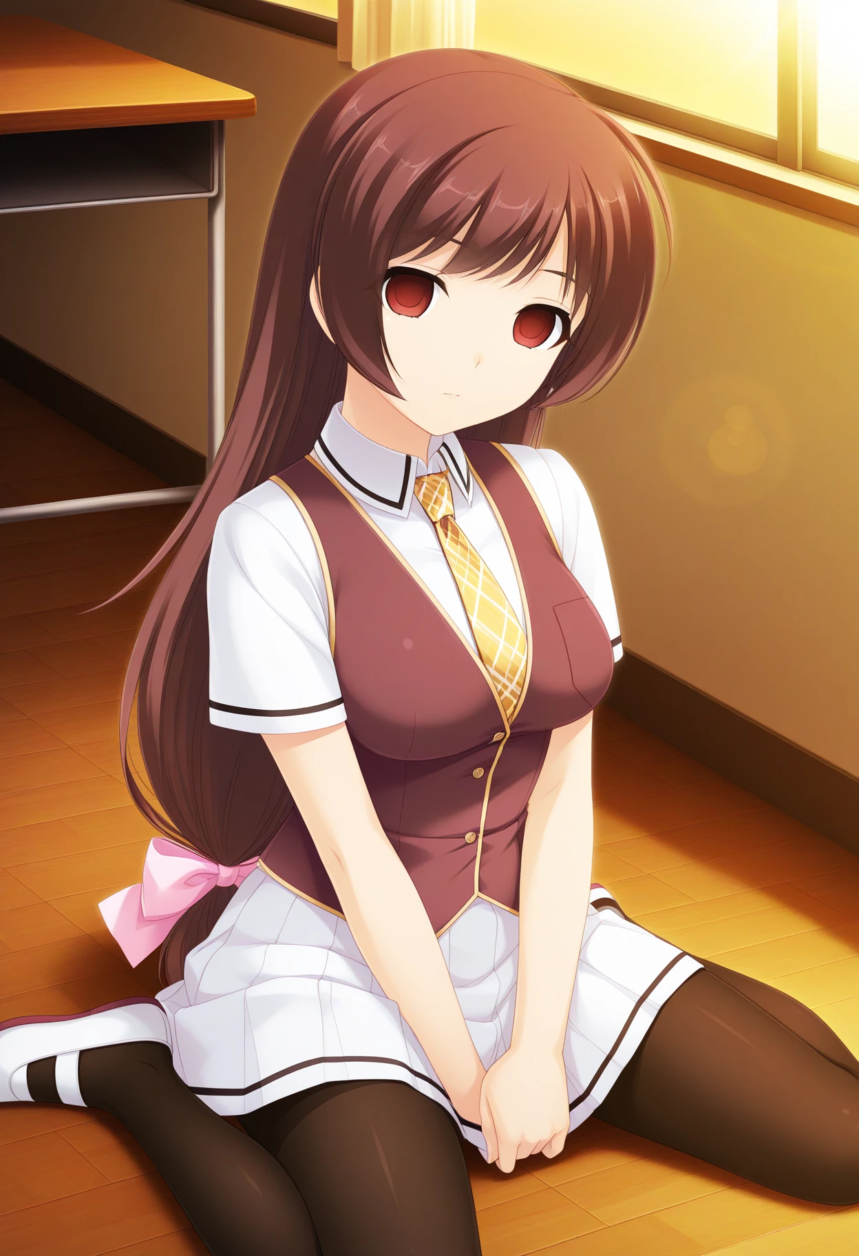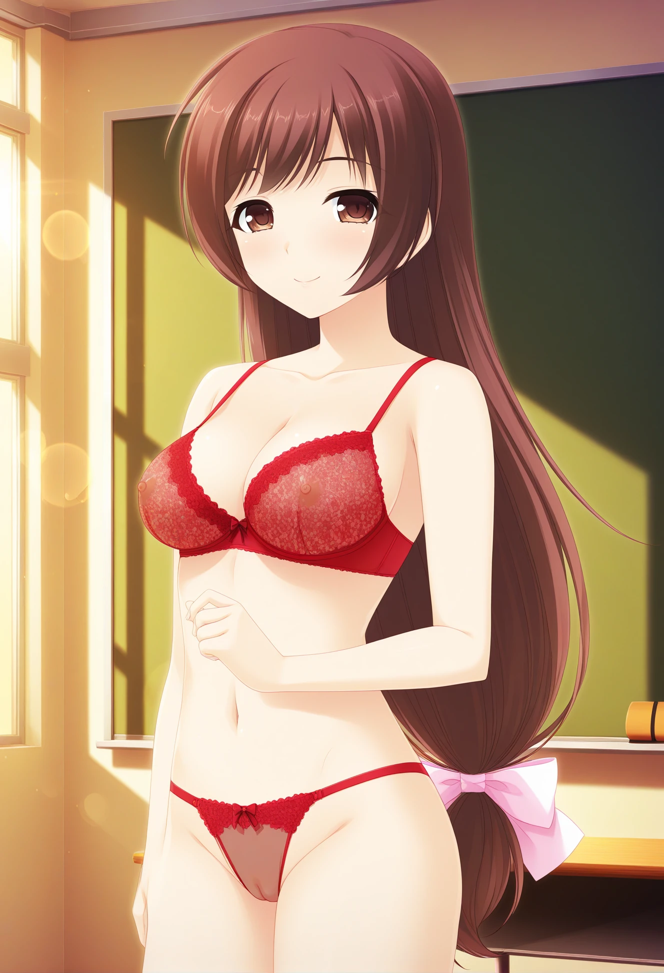 asuka_aoba, 1girl, solo, empty eyes, red eyes, hypnosis, 1girl, solo, long hair, very long hair, brown hair, hair bow, bow, pink bow, medium breasts,